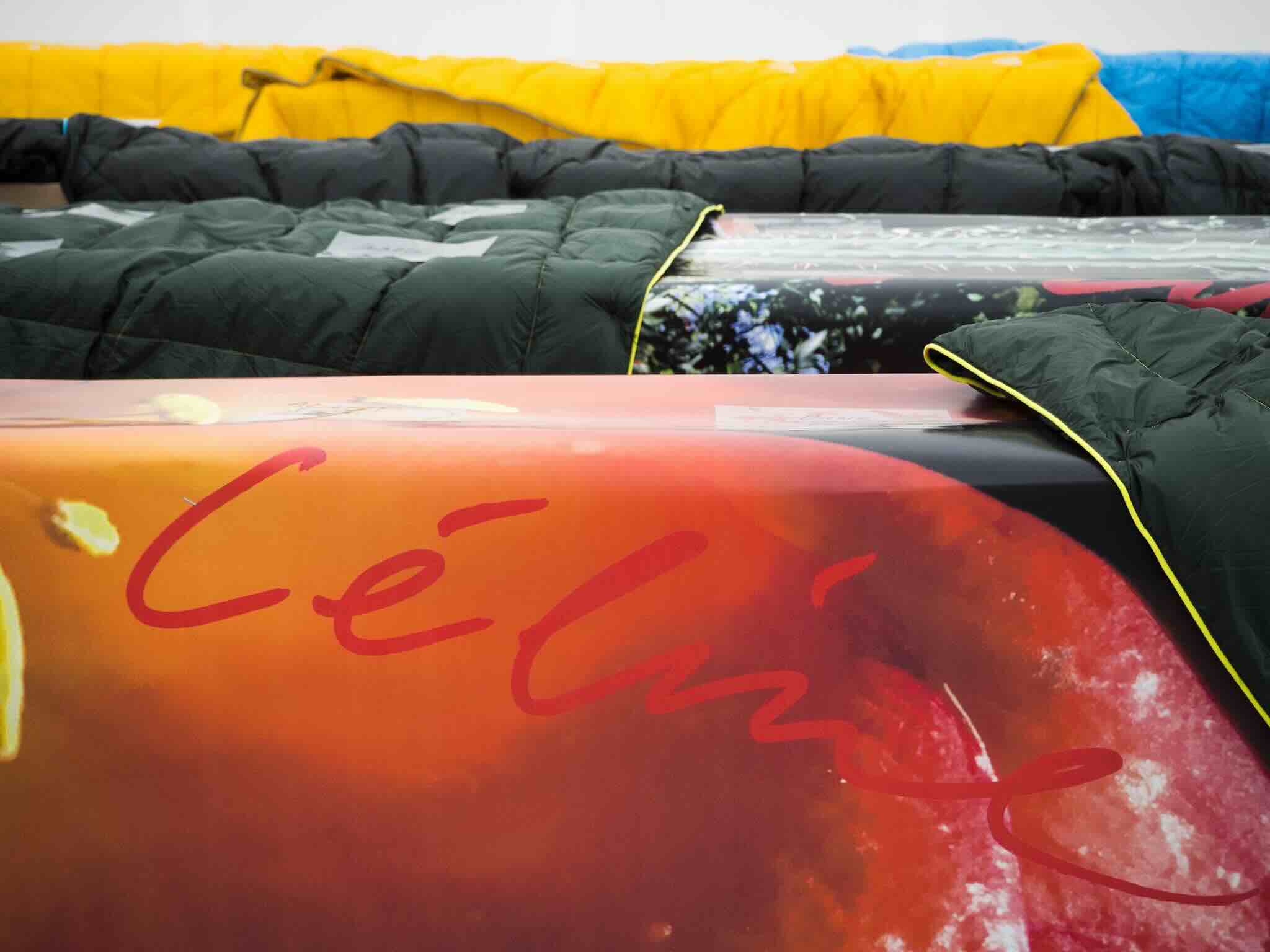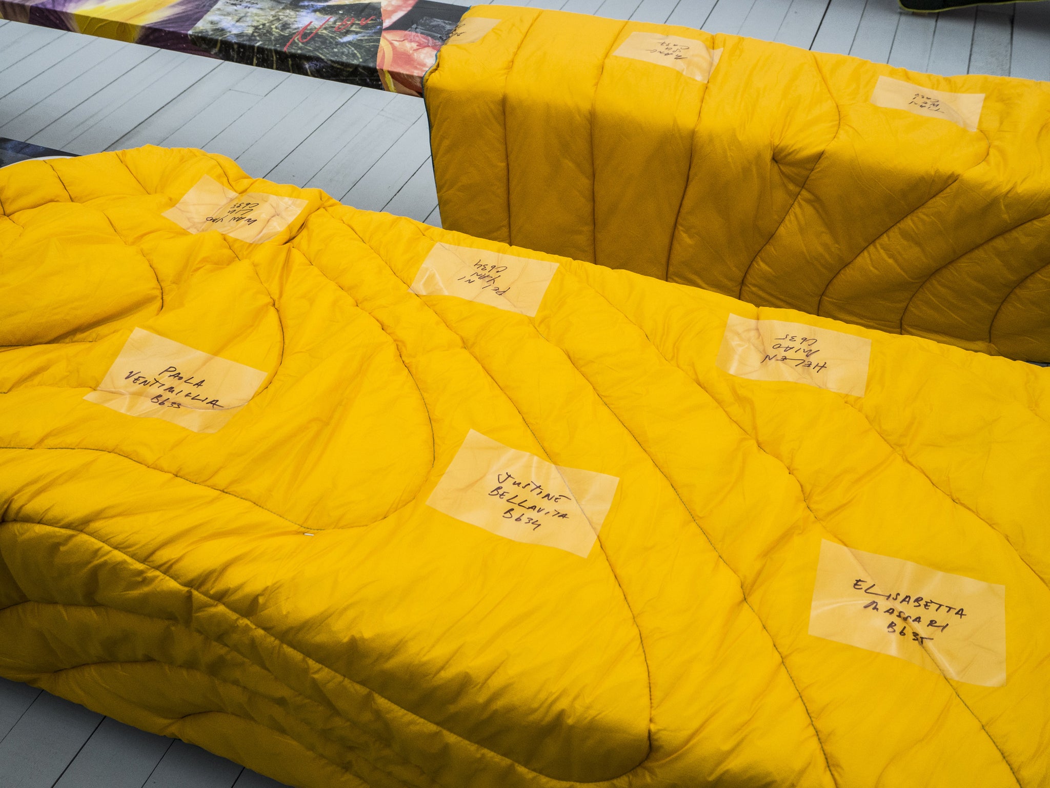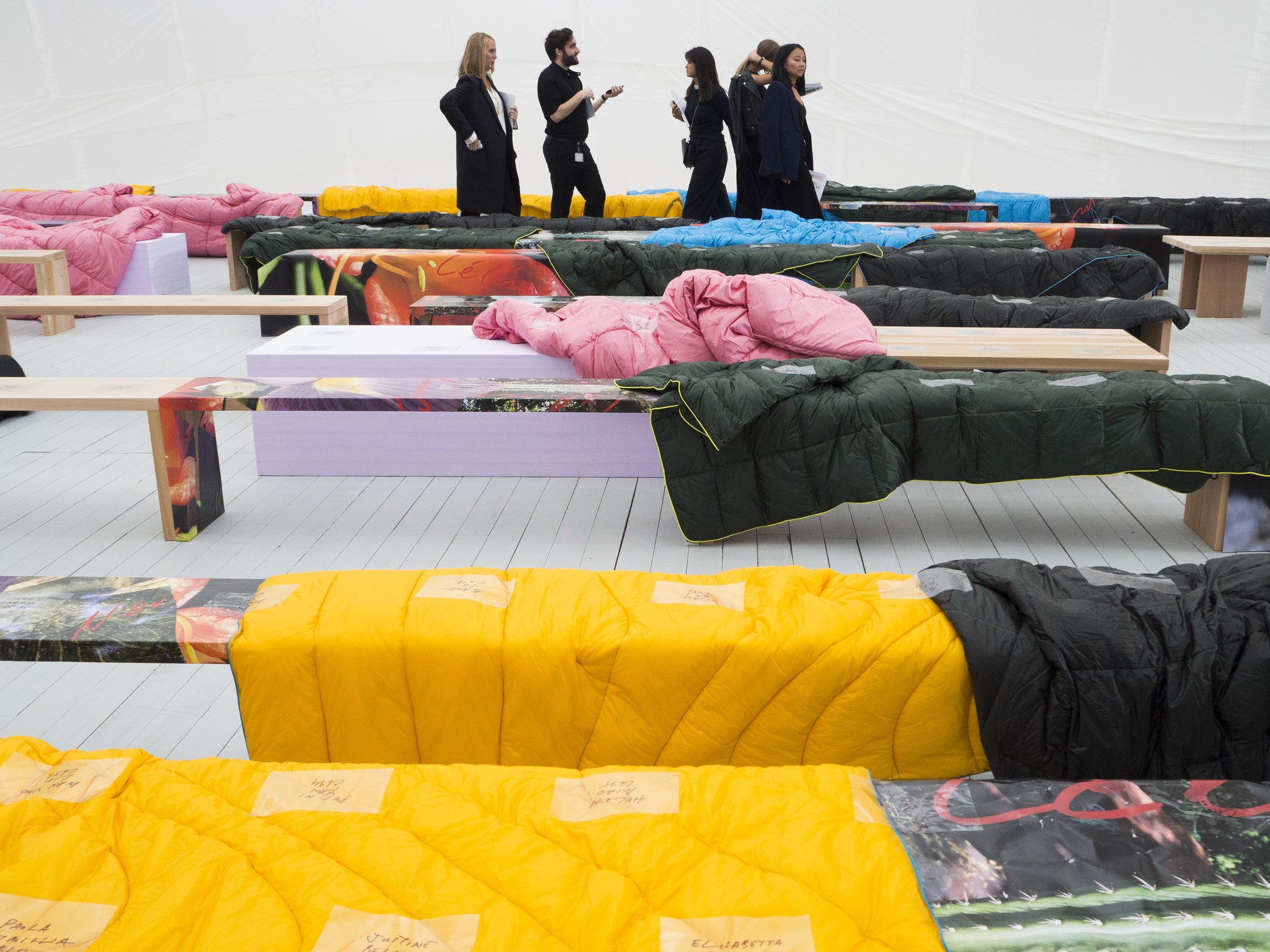 Prints and quilted blankets on benches at the Céline Spring/Summer 2018 womenswear show in Paris