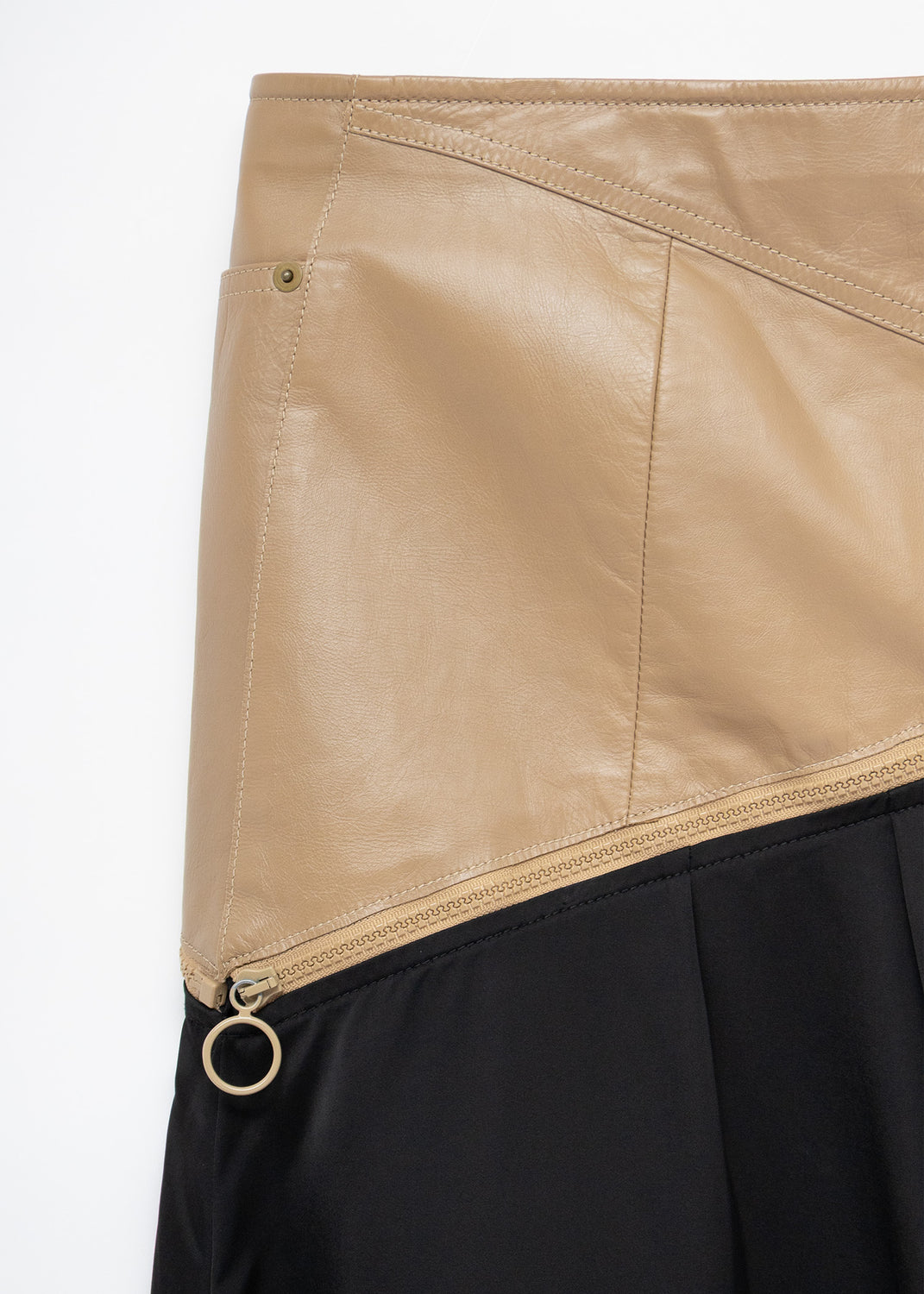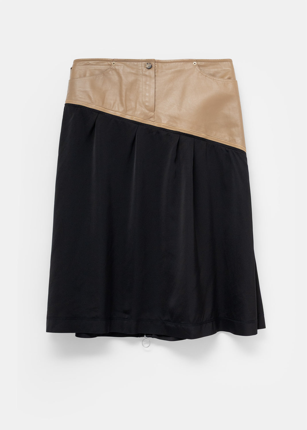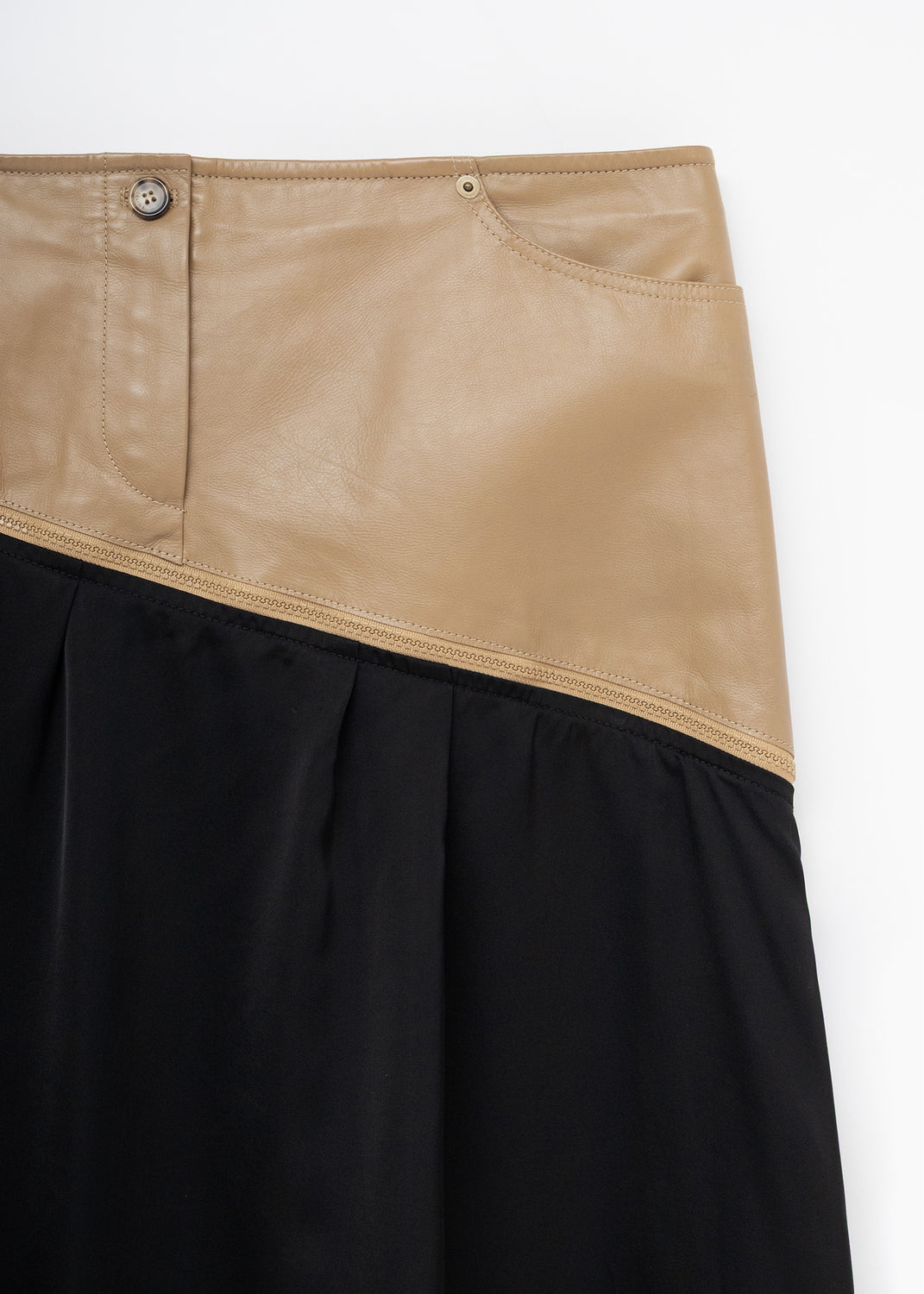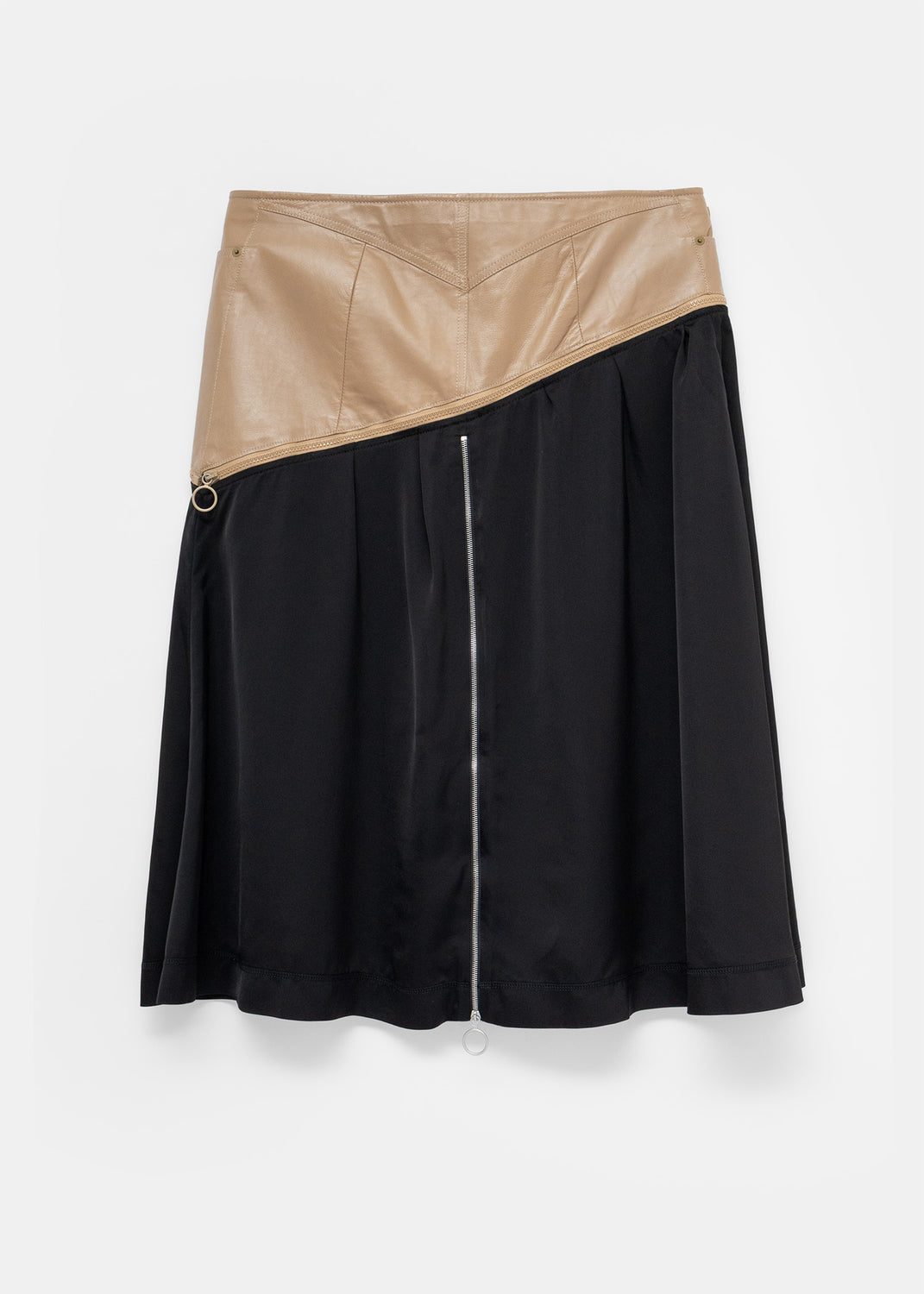 An angled calfskin yoke with working pockets sits high to define the waist, while a contrasting black satin skirt drops from the zippered diagonal seam. Once fully unzipped, the leather yoke turns into a standalone belt of sorts, which can be layered over bottoms or dresses for silhouette and utility. A zipper runs down the back of the skirt, which creates an adjustable vent for stride if preferred.