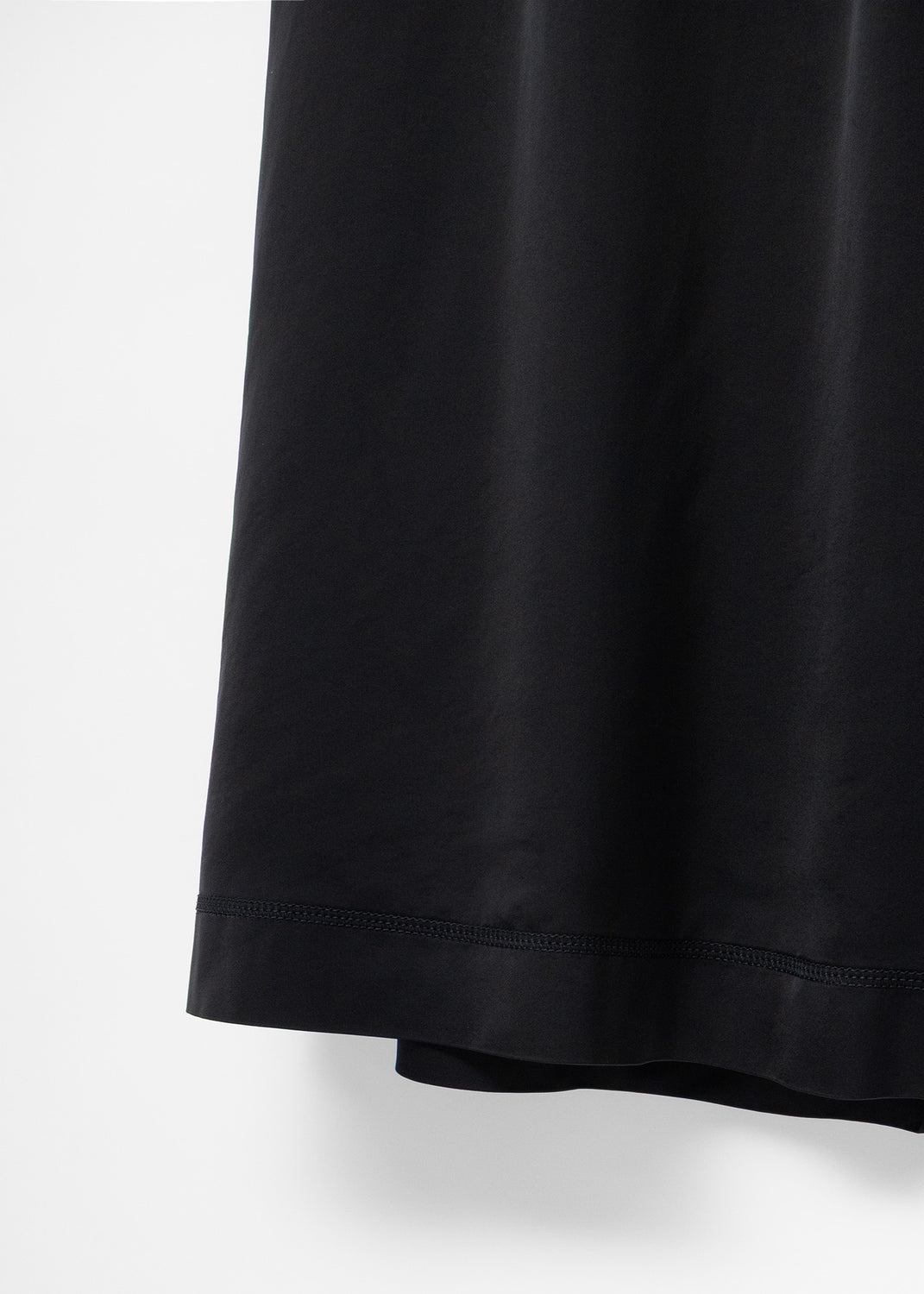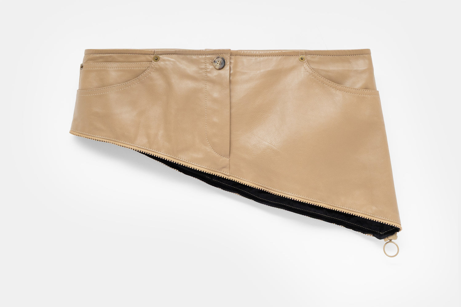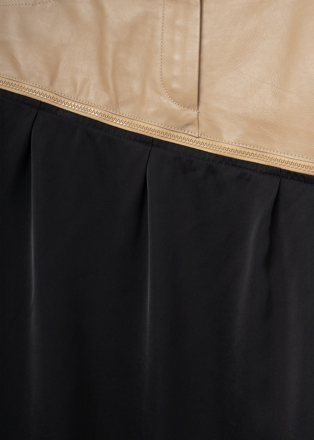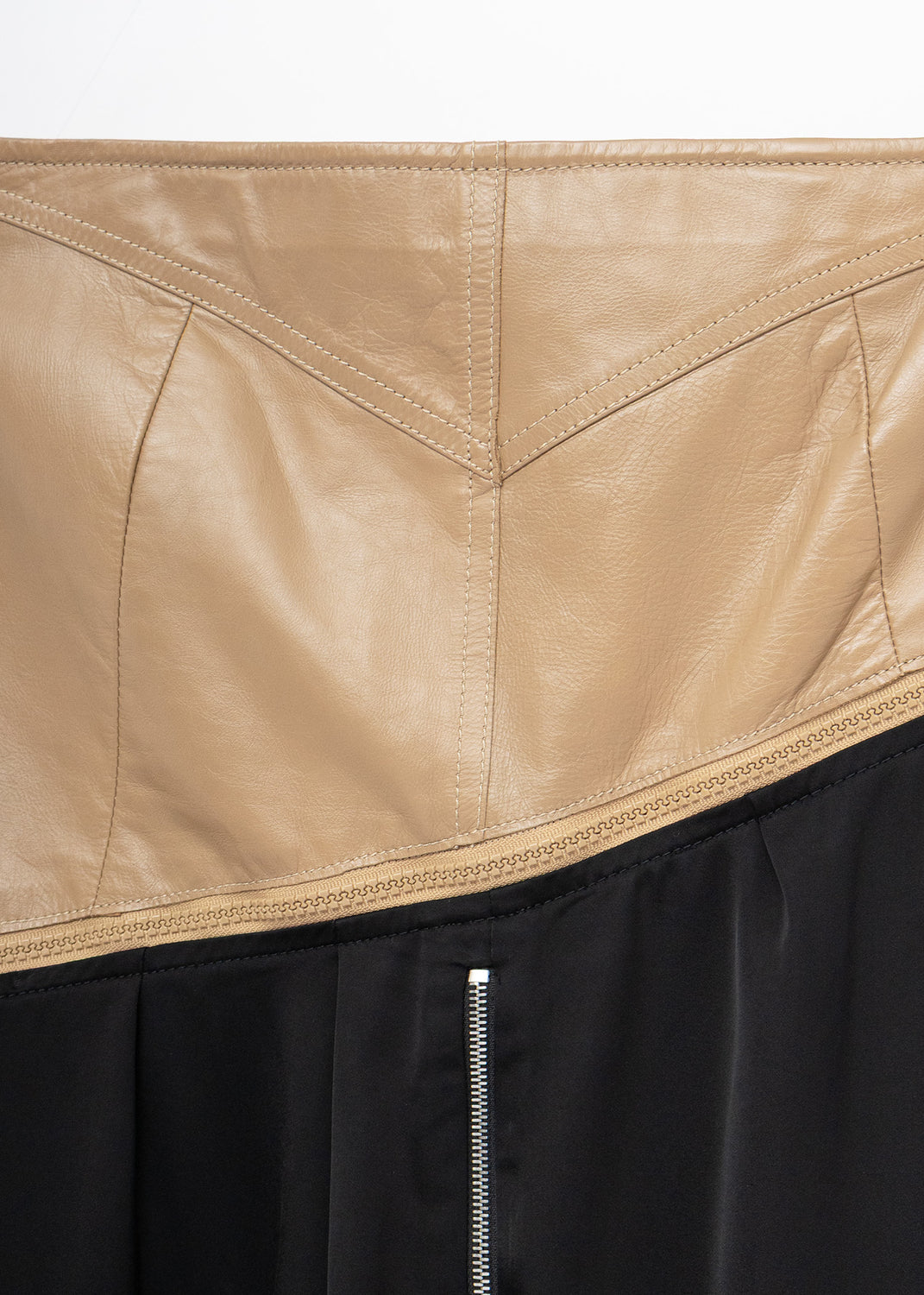 An angled calfskin yoke with working pockets sits high to define the waist, while a contrasting black satin skirt drops from the zippered diagonal seam. Once fully unzipped, the leather yoke turns into a standalone belt of sorts, which can be layered over bottoms or dresses for silhouette and utility. A zipper runs down the back of the skirt, which creates an adjustable vent for stride if preferred.