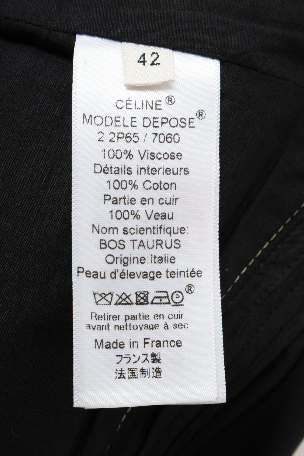 Yoke Calfskin leather Composition 100% Calfskin Handle Smooth, supple, structured Weight Midweight Transparency No Stretch No Sheen No Skirt Viscose satin Composition 100% Viscose Handle Soft, flat, fluid Weight Midweight Transparency No Stretch No Sheen Yes Lining Cotton lining Composition 100% Cotton InscriptionsLabel marked "CÉLINE"