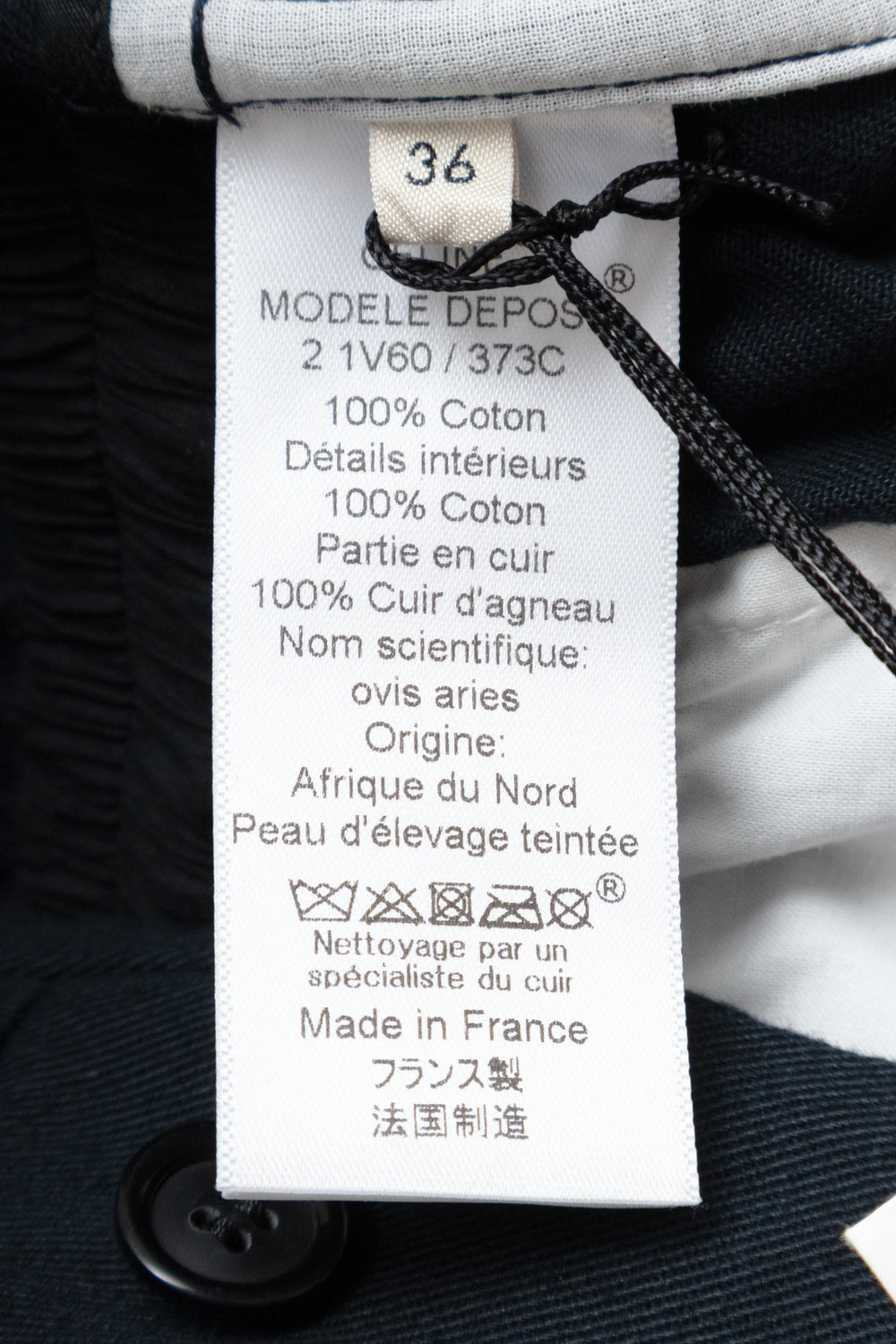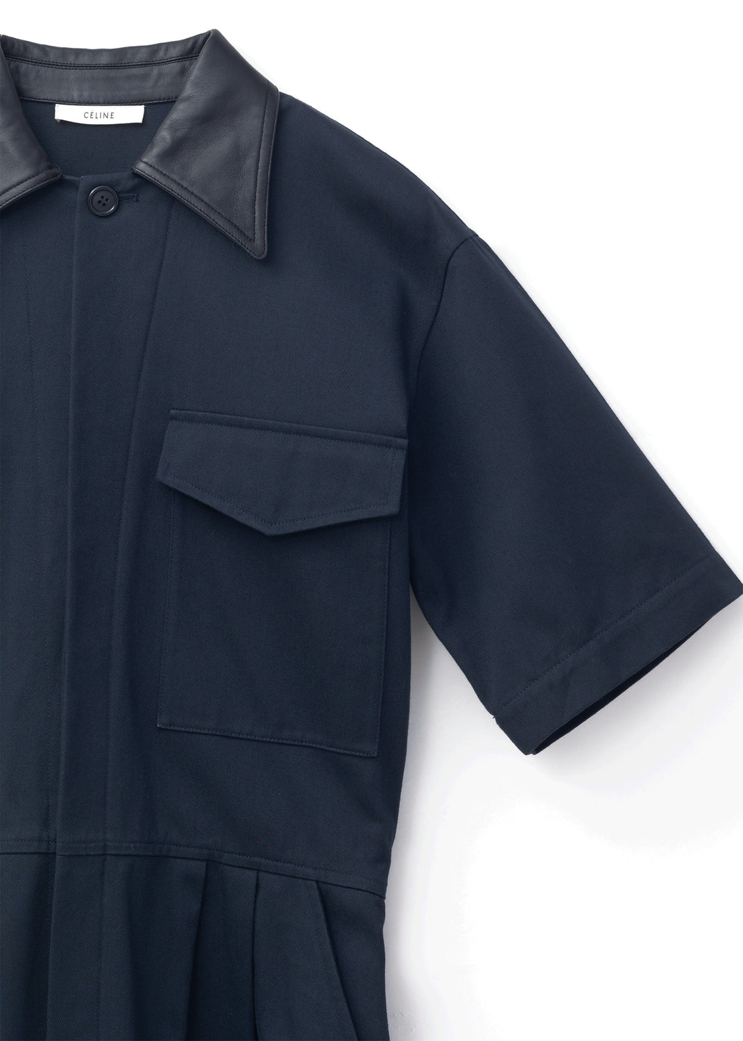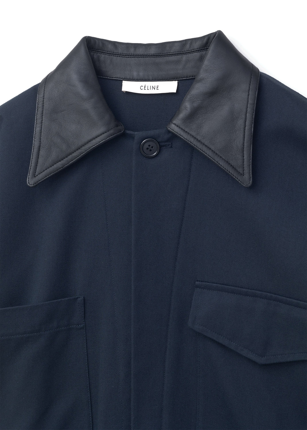 Material Cotton twill Composition 100% Cotton Handle Soft, dry, compact Weight Midweight Transparency No Stretch No Sheen No Collar Leather Composition 100% Lambskin leather InscriptionsLabel marked "CÉLINE"