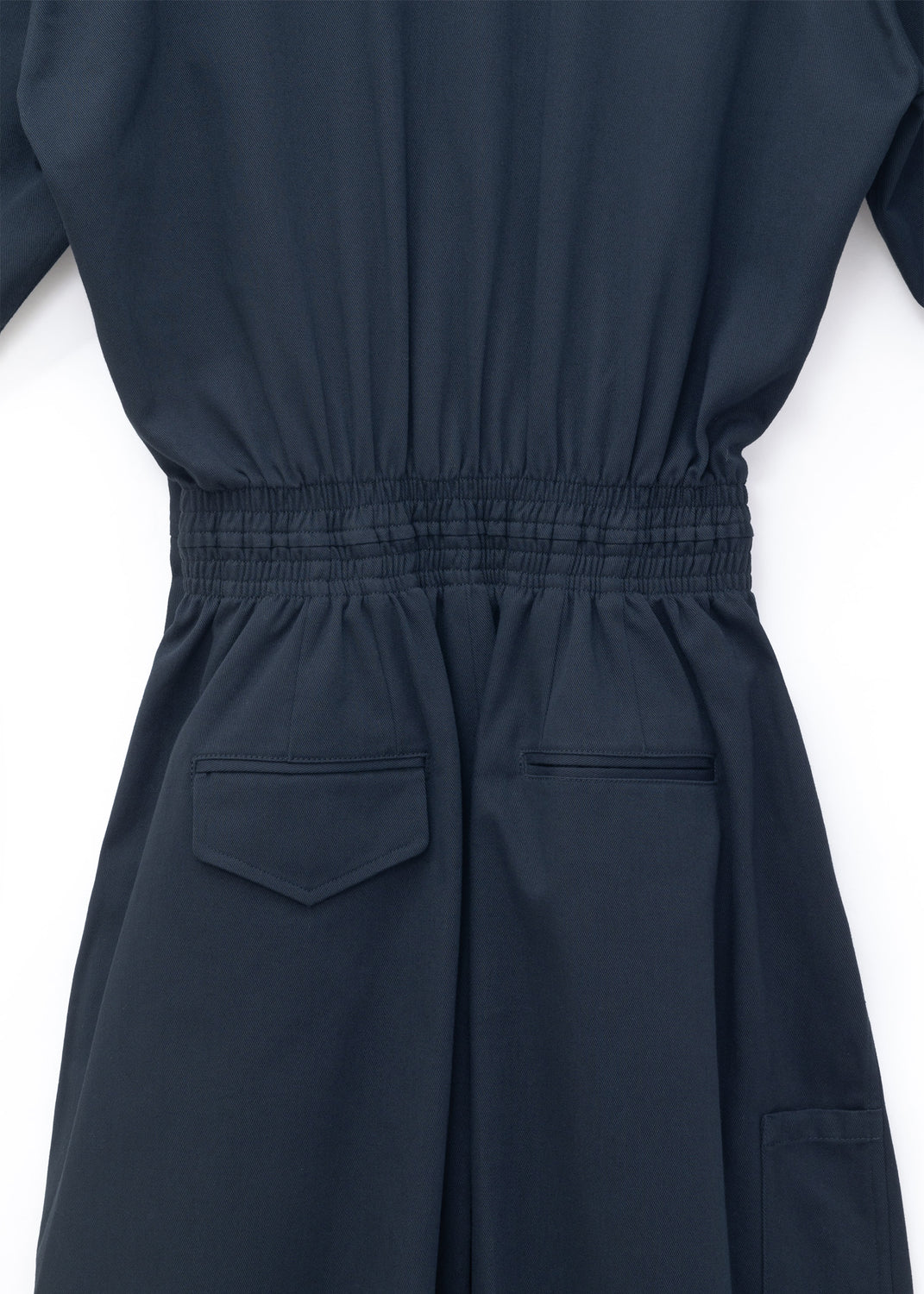 Elasticated waist on back; asymmetric back pockets