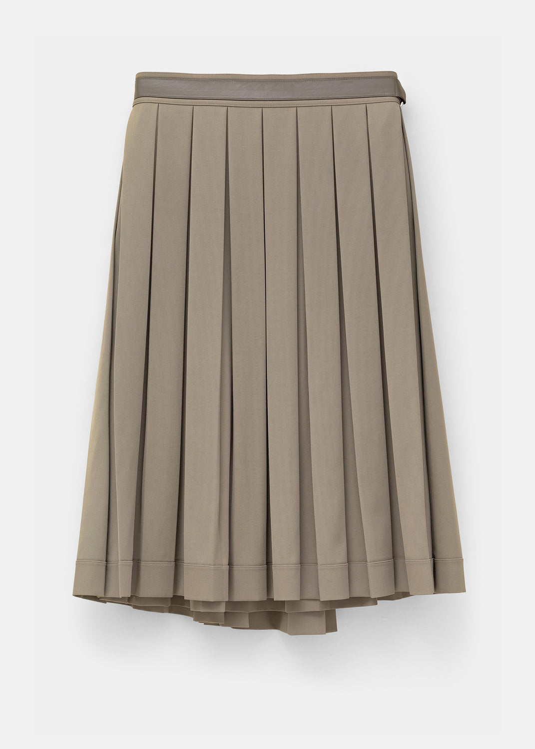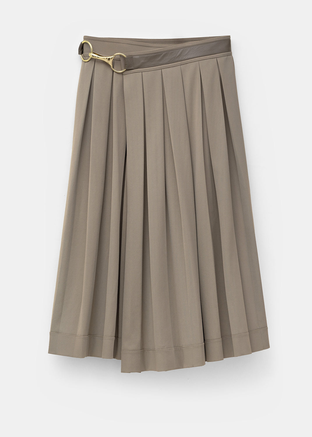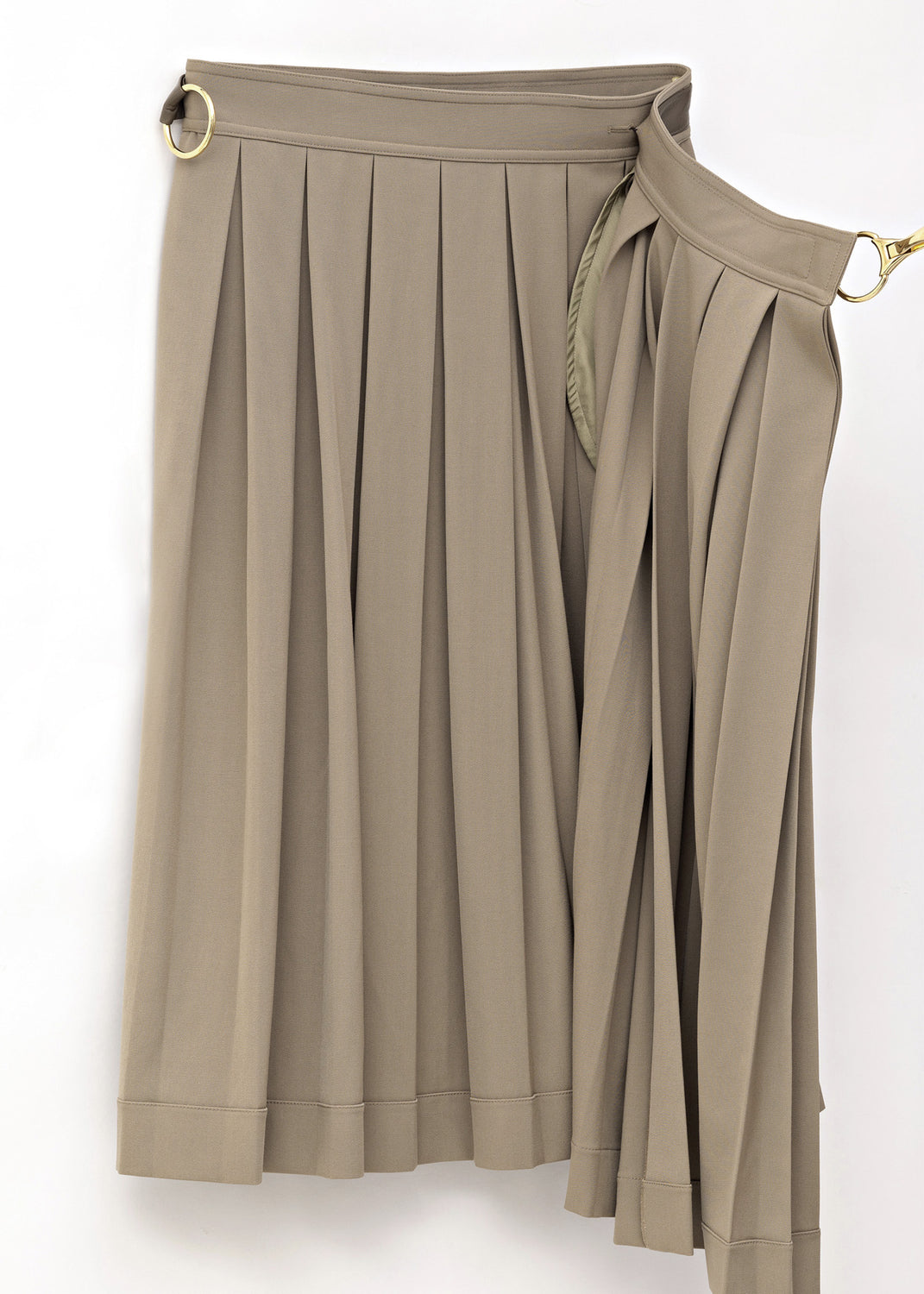 Cut in box-pleated wool gabardine, the skirt has a wrap front that creates a double layer of pleats, and a slight asymmetry at the hem.
