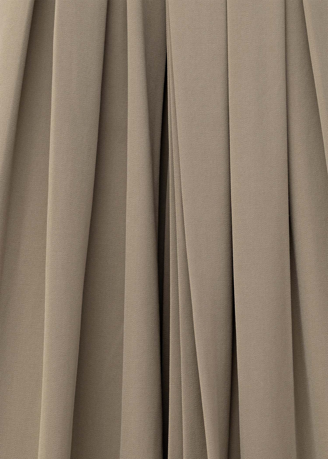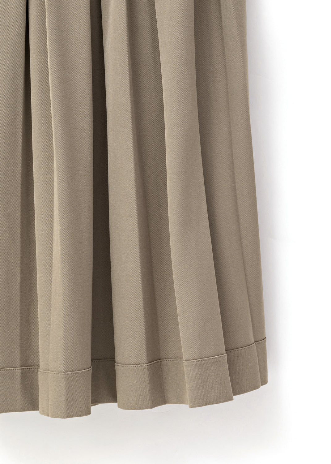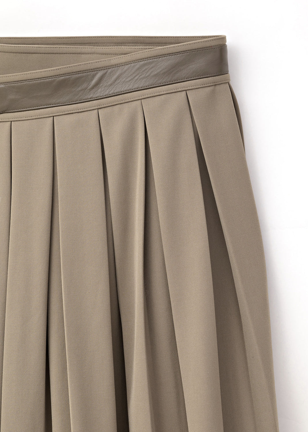Cut in box-pleated wool gabardine, the skirt has a wrap front that creates a double layer of pleats, and a slight asymmetry at the hem.