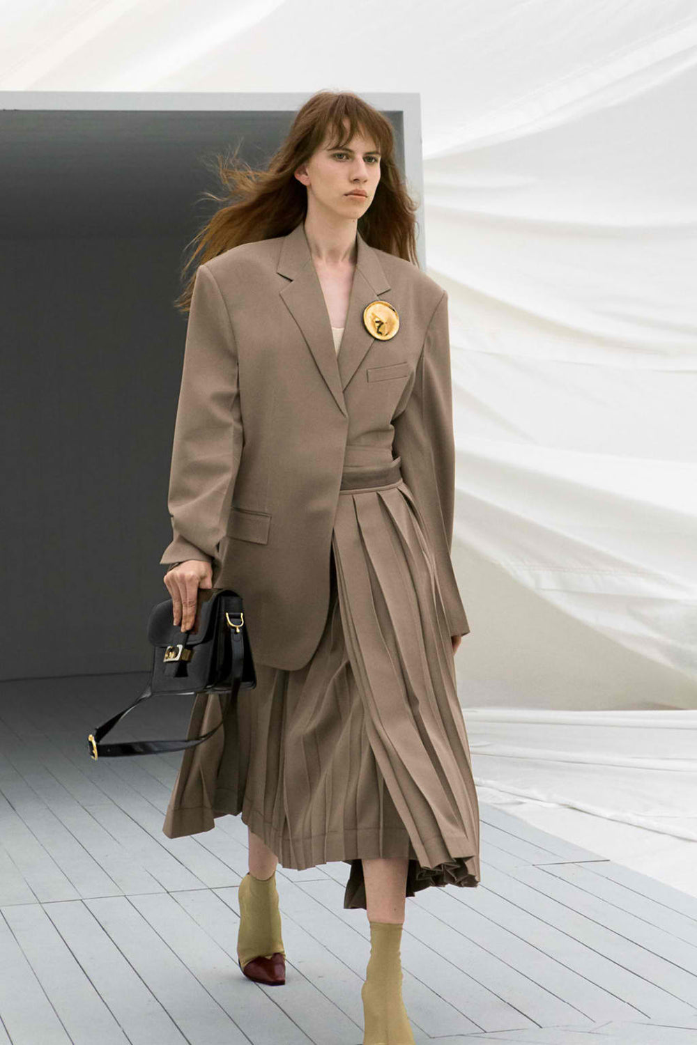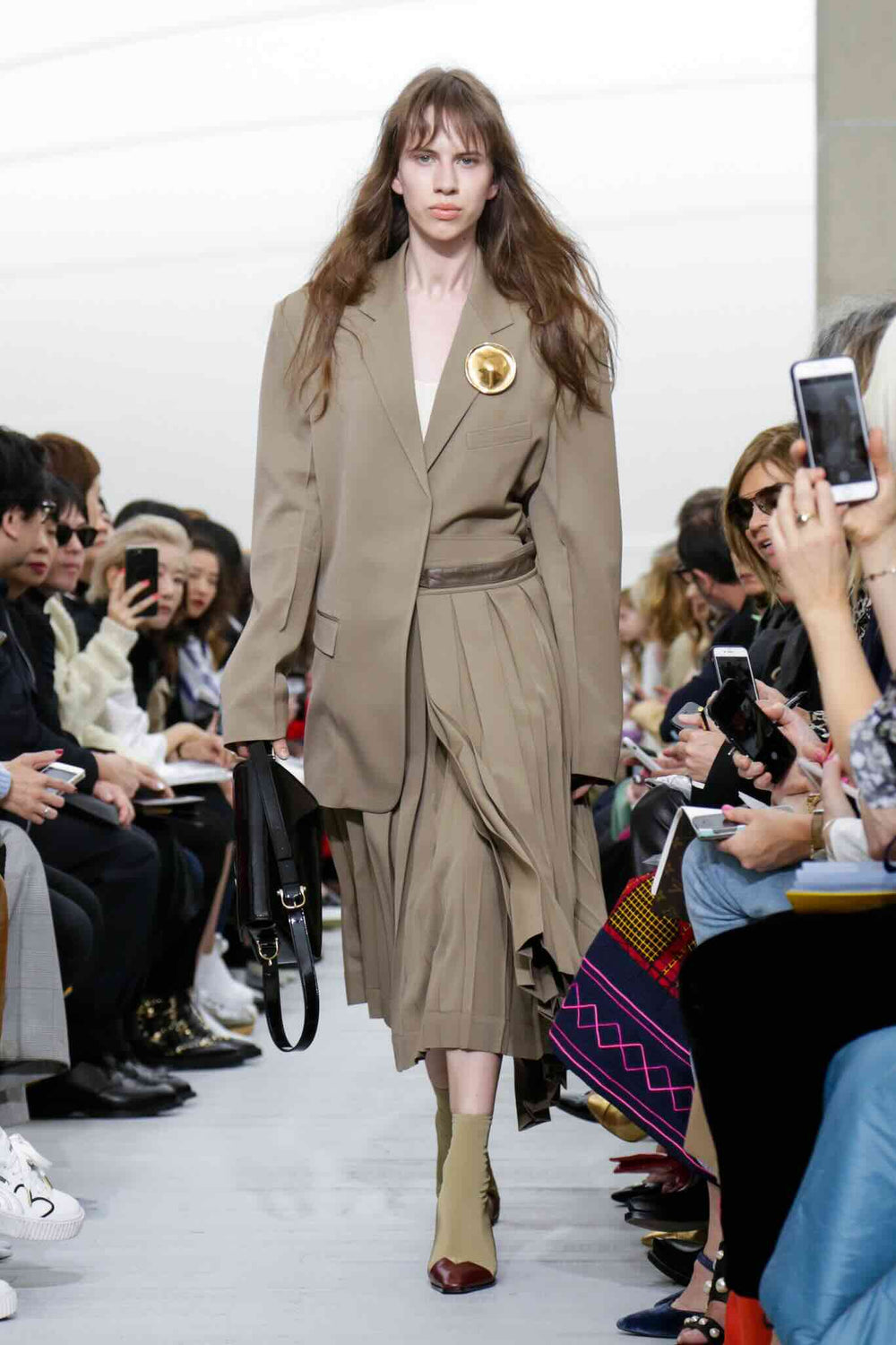 For Spring/Summer 2018, Phoebe Philo looked back to the late-’70s and early-’80s Céline woman on Avenue Foch: pleated skirts, grown-up glamour, a sense of ease and pride in getting dressed. Those ideas came through in the collection’s opening skirt suits: oversized tailored blazers paired with pleated skirts like this one.