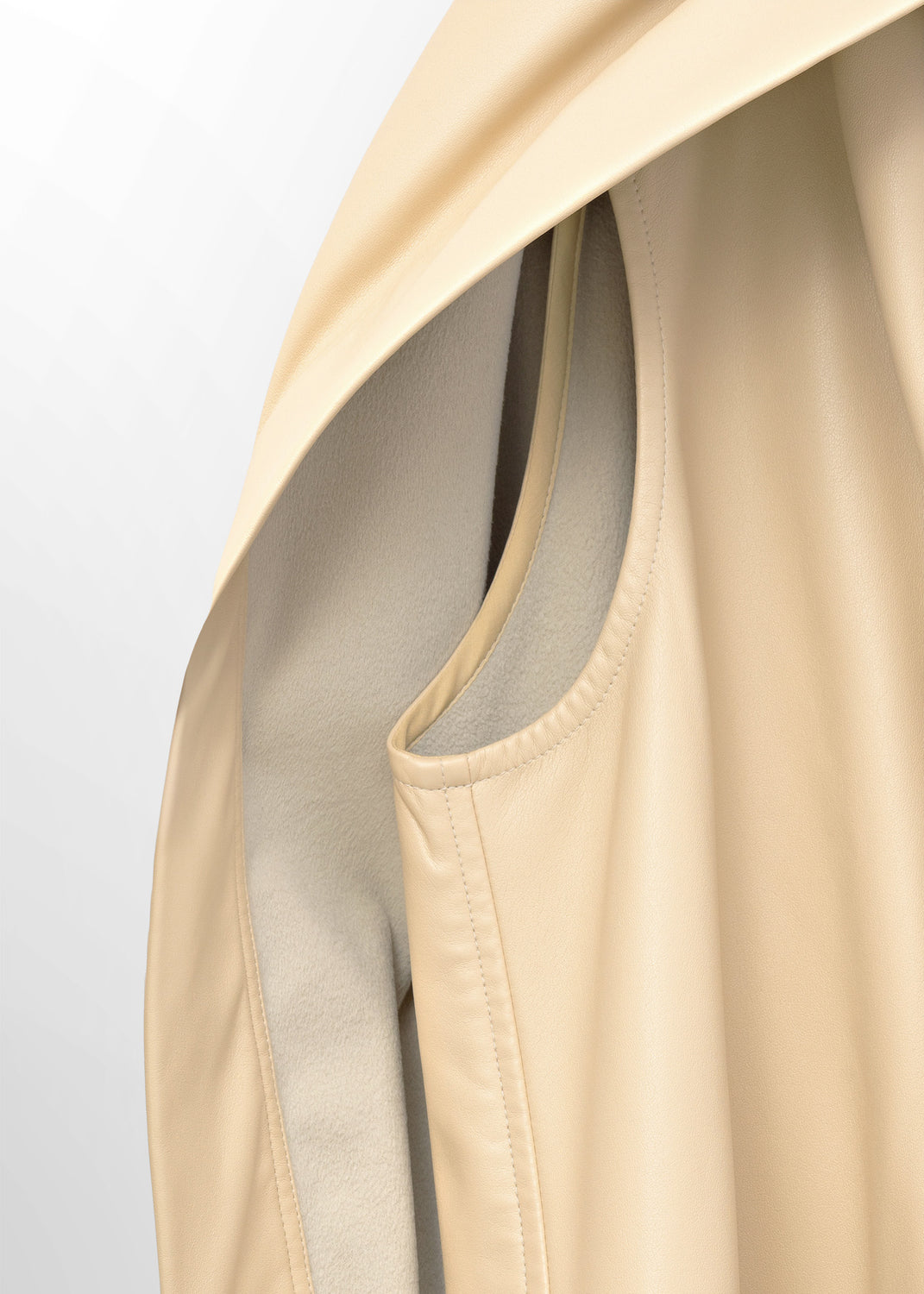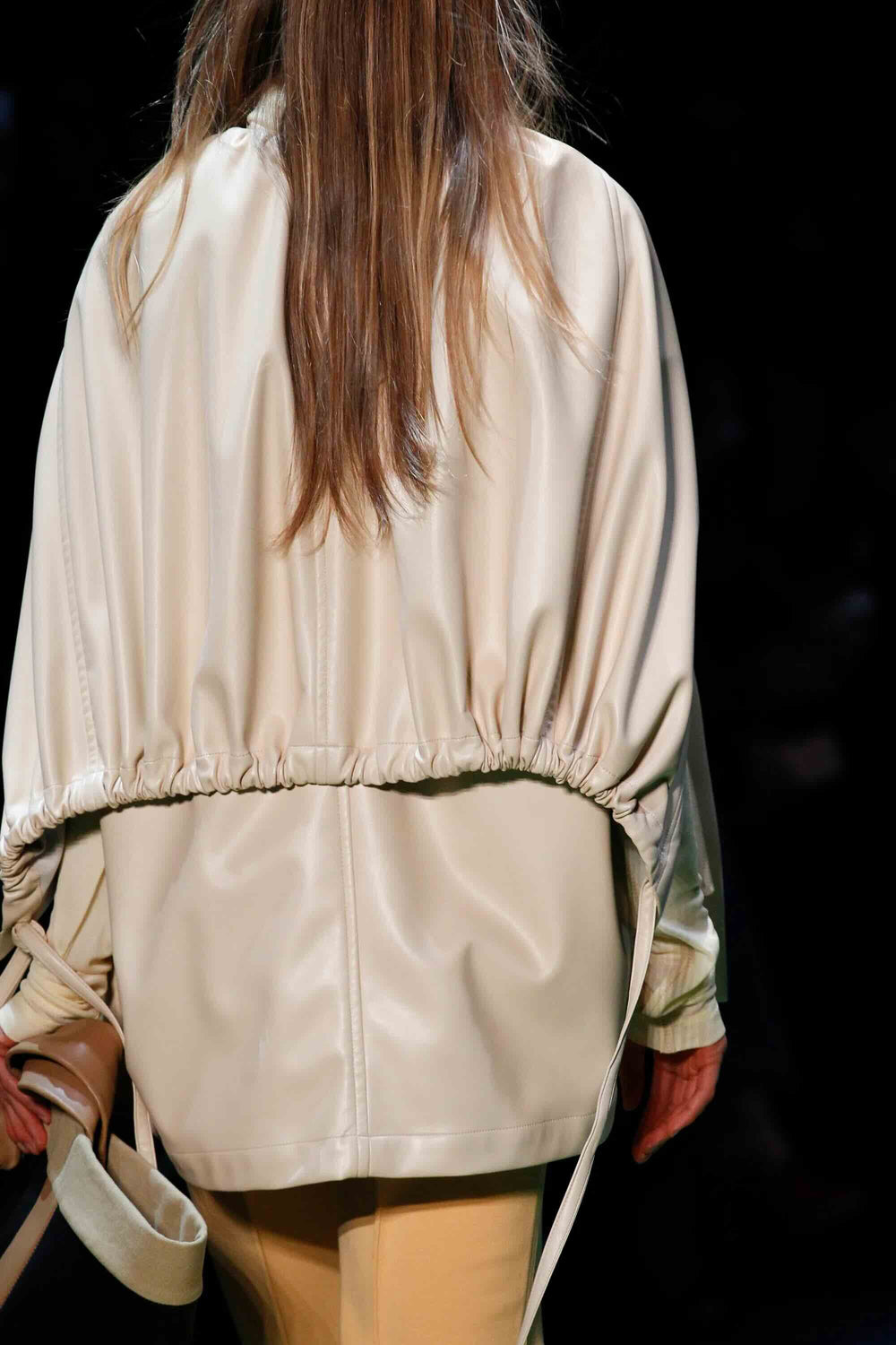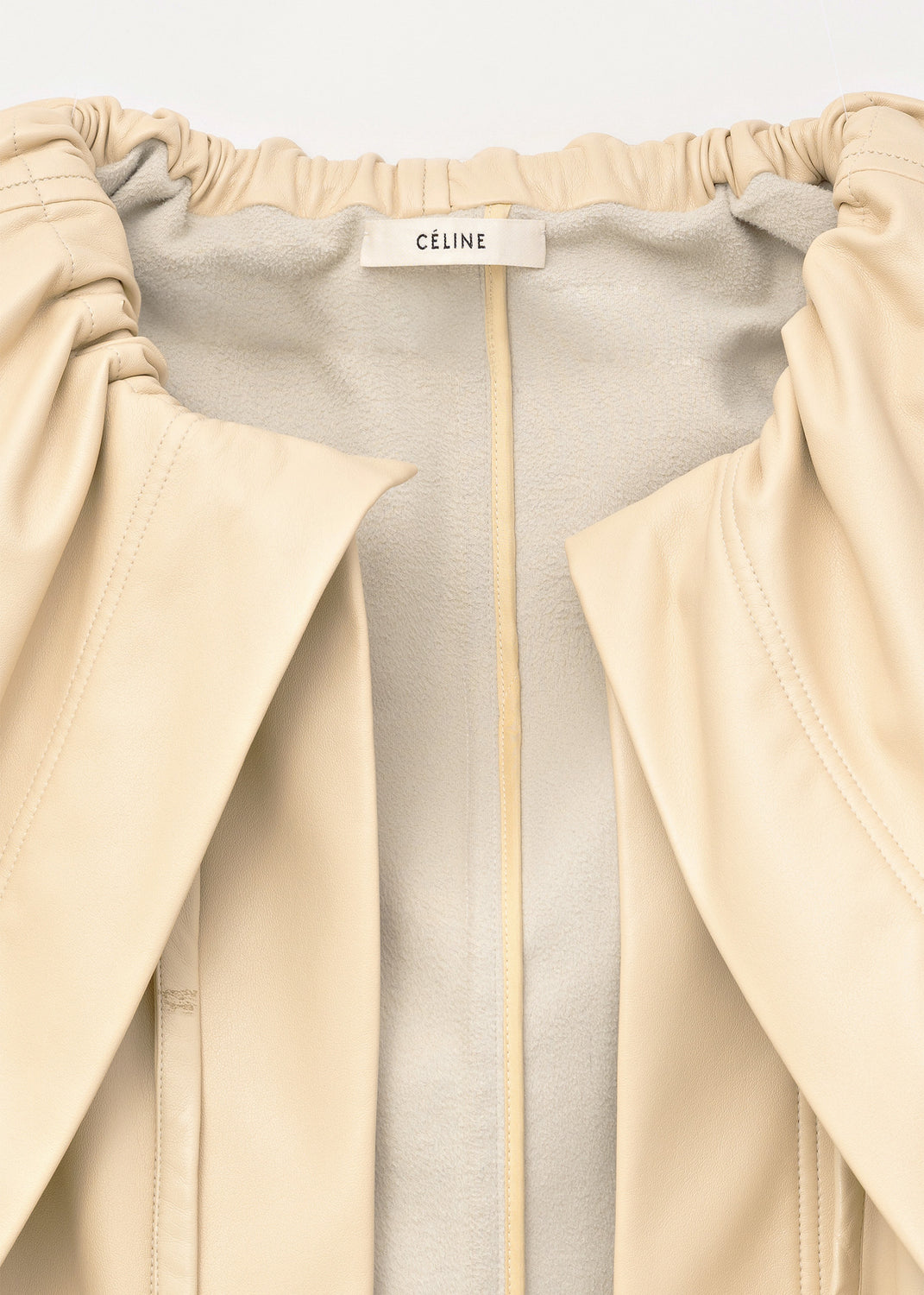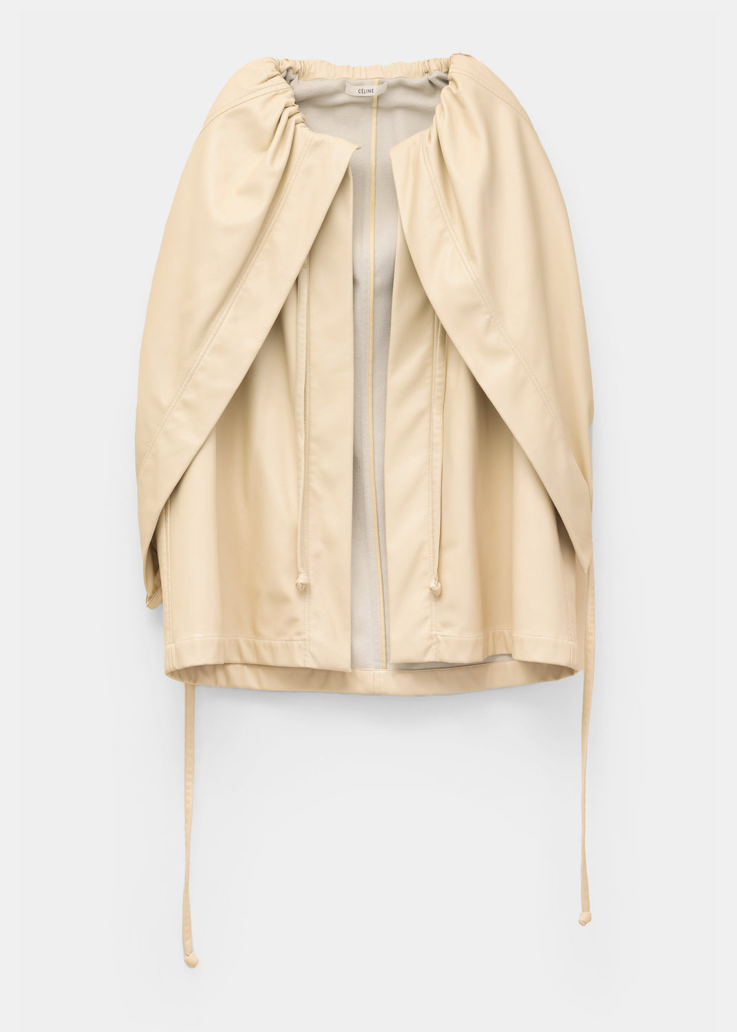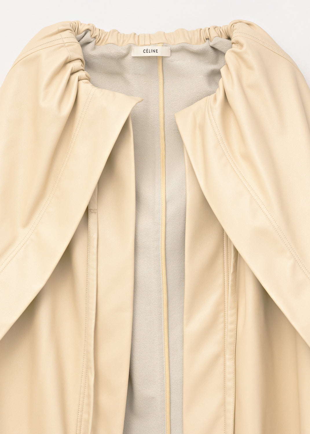 The fluid, soft-structured outerwear shown for Céline’s Fall/Winter 2016 collection included this jacket, made in a cream-colored matte vinyl leather; similar in hand and drape to nappa lambskin, with a soft, napped microsuede lining.