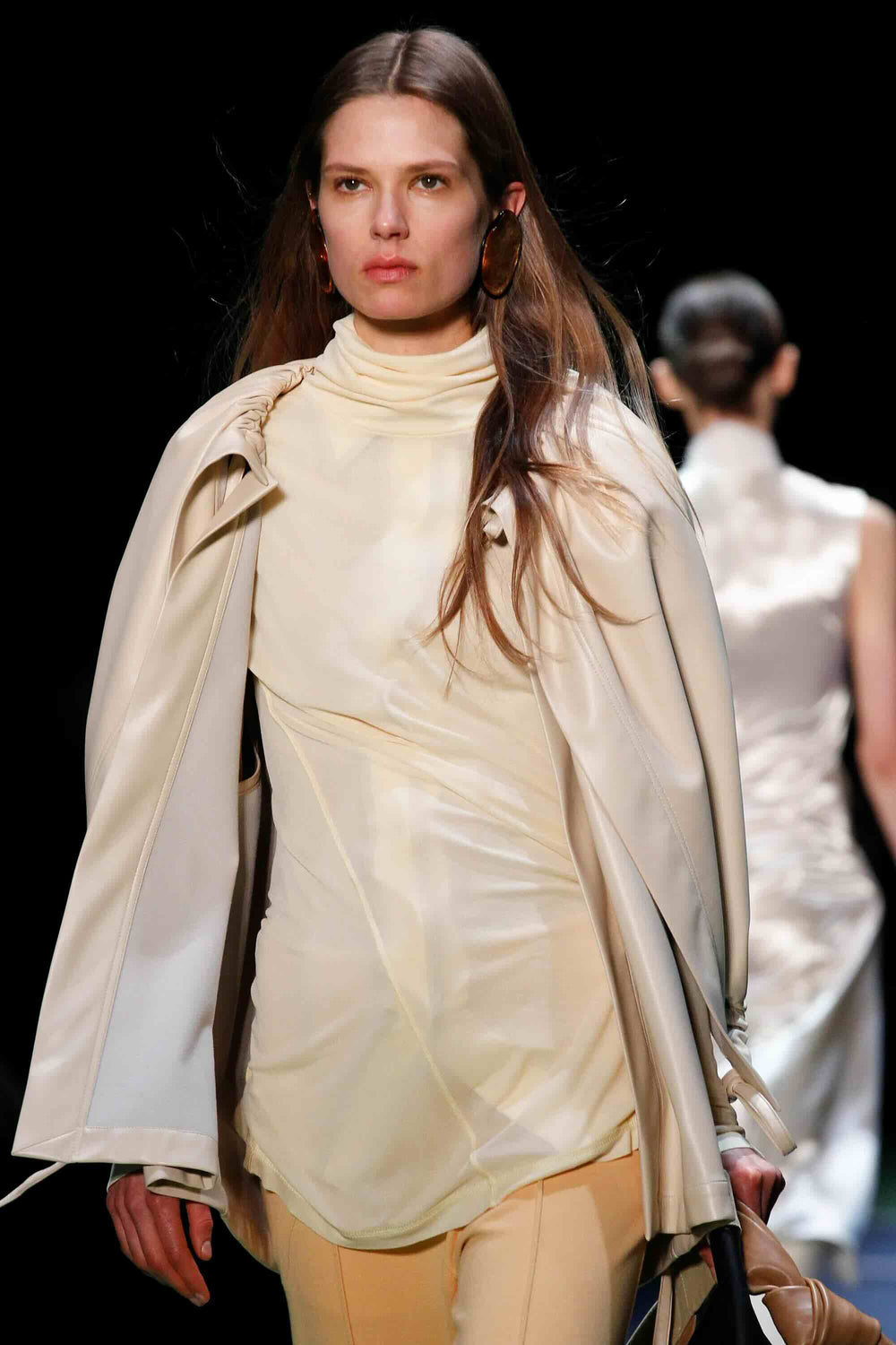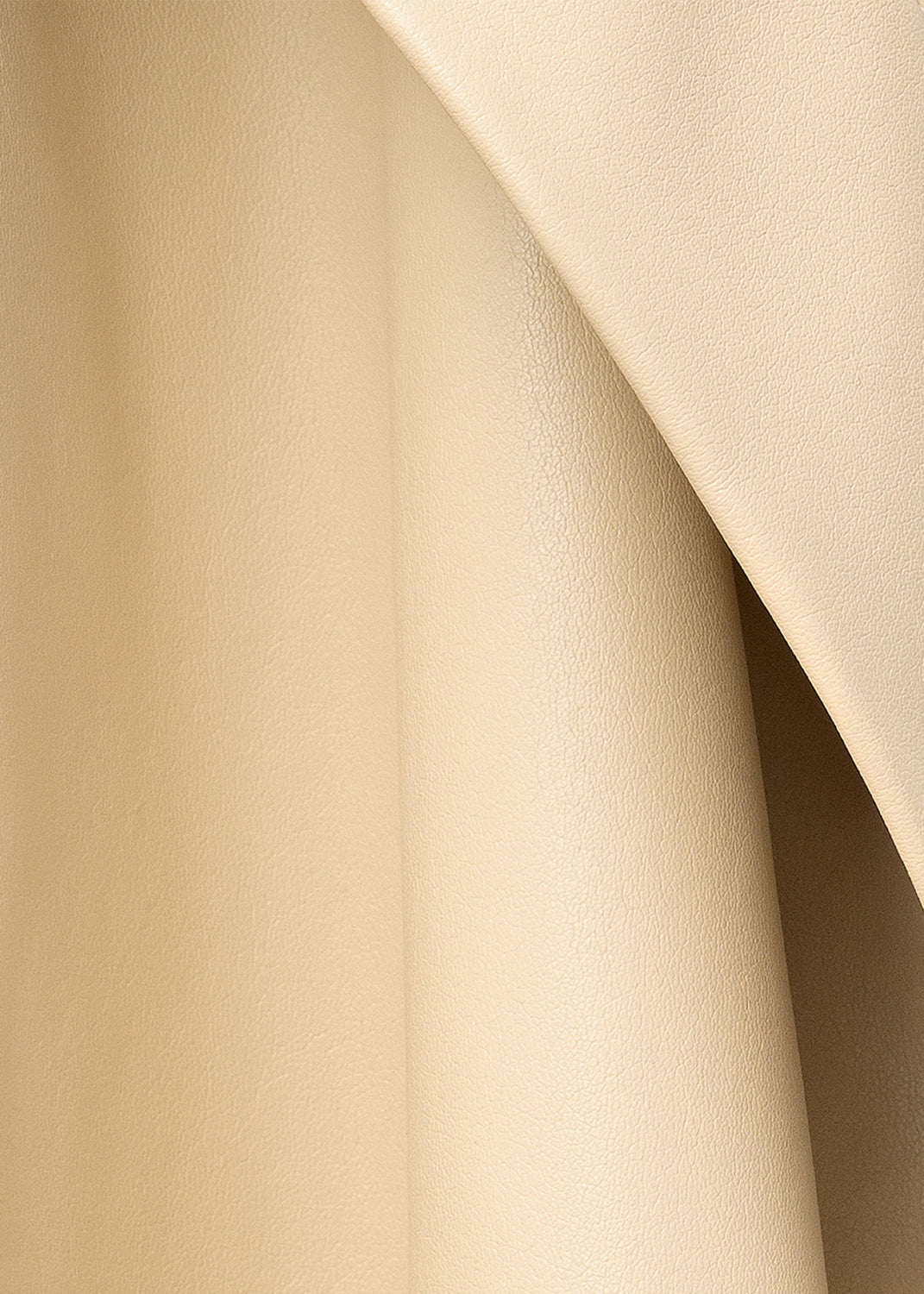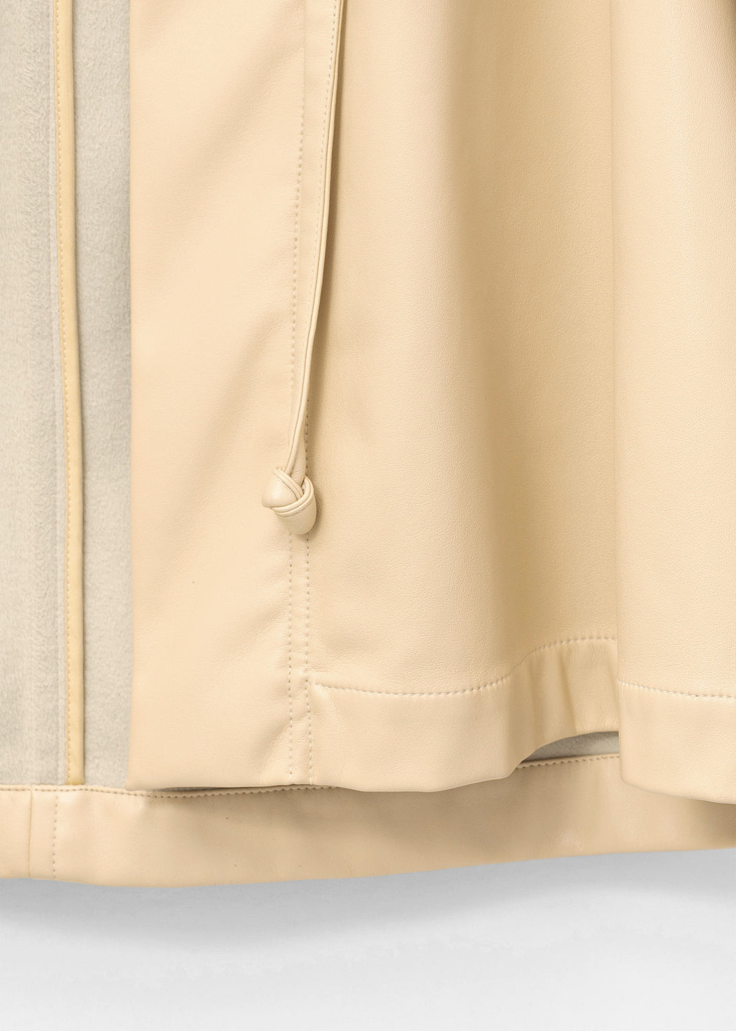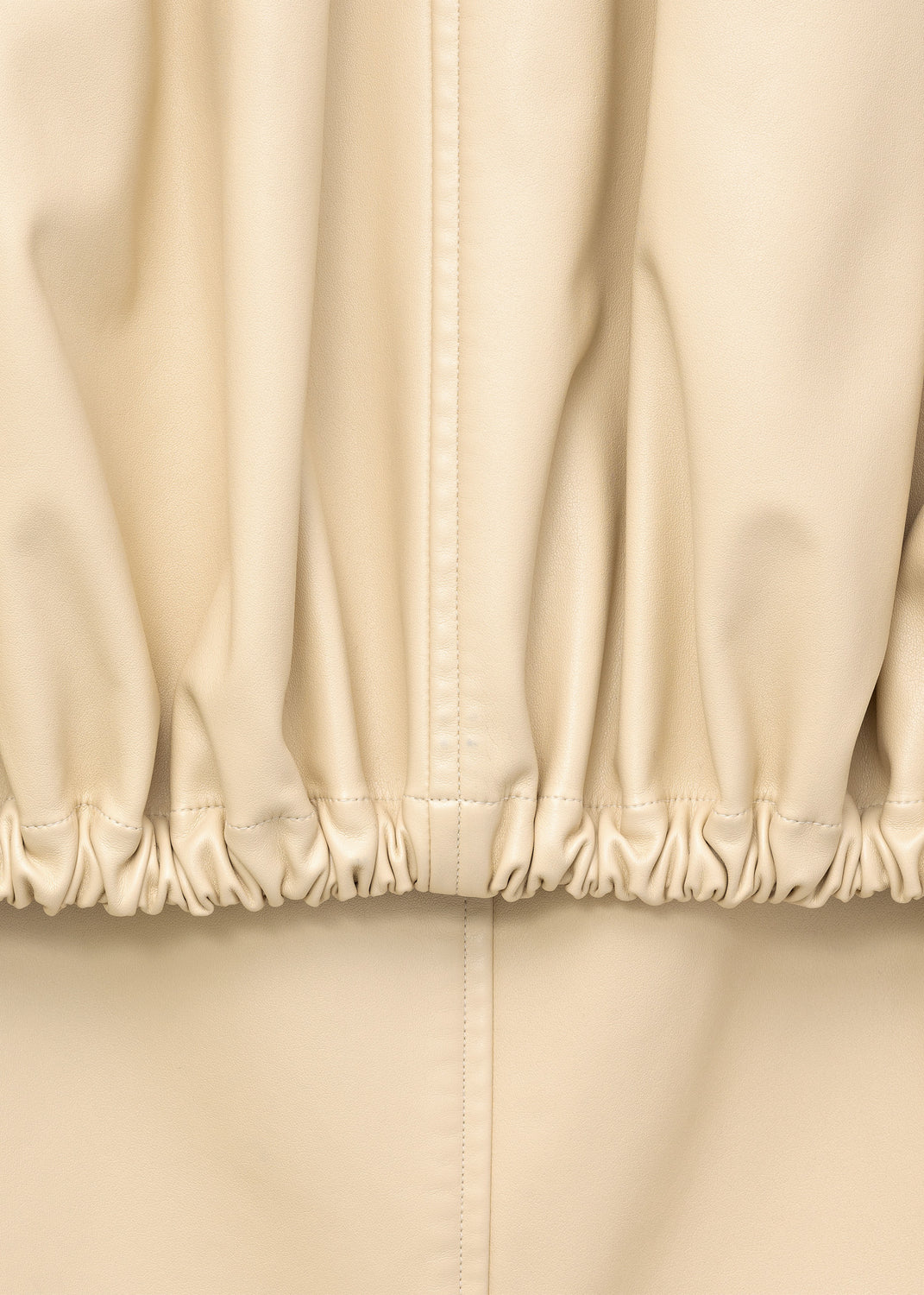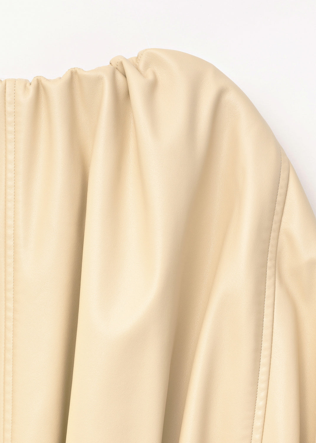 The fluid, soft-structured outerwear shown for Céline’s Fall/Winter 2016 collection included this jacket, made in a cream-colored matte vinyl leather; similar in hand and drape to nappa lambskin, with a soft, napped microsuede lining.