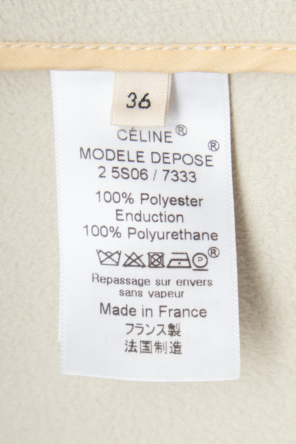 Base material Microsuede Composition 100% Polyester Handle Smooth, supple (exterior); Brushed, soft, napped (interior) Weight Midweight Transparency No Stretch No Sheen No Outer coating Vinyl leather Composition 100% Polyurethane InscriptionsLabel marked "CÉLINE"