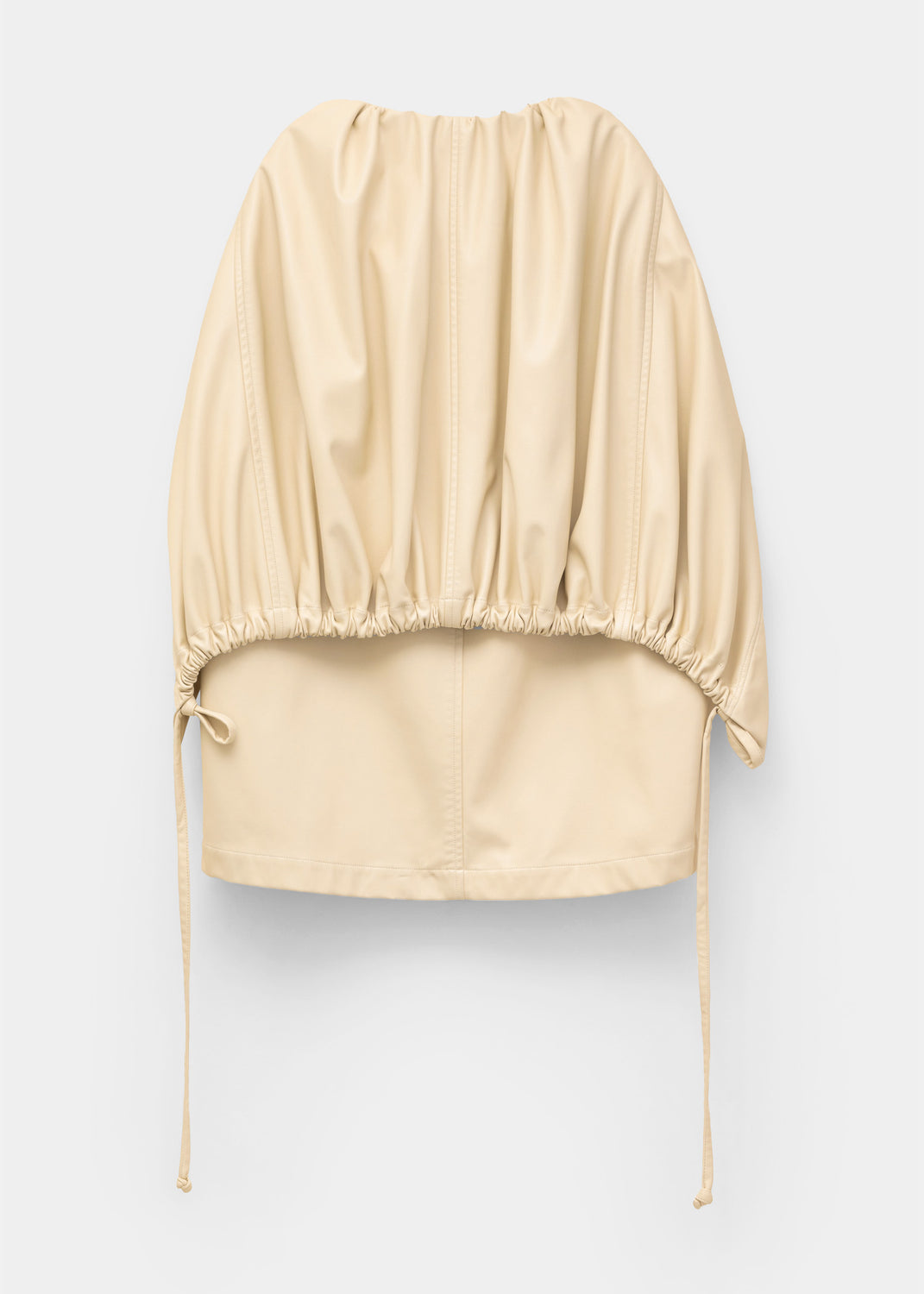 This layered jacket consists of a sleeveless inner vest and an outer cape with long drawstring ties at the hem. Both cape and vest are joined at the gathered collar, which also features long drawstring ties. Adjusting either drawstring changes the amount of gathering on the cape, and with it, the shape of the jacket as a whole.