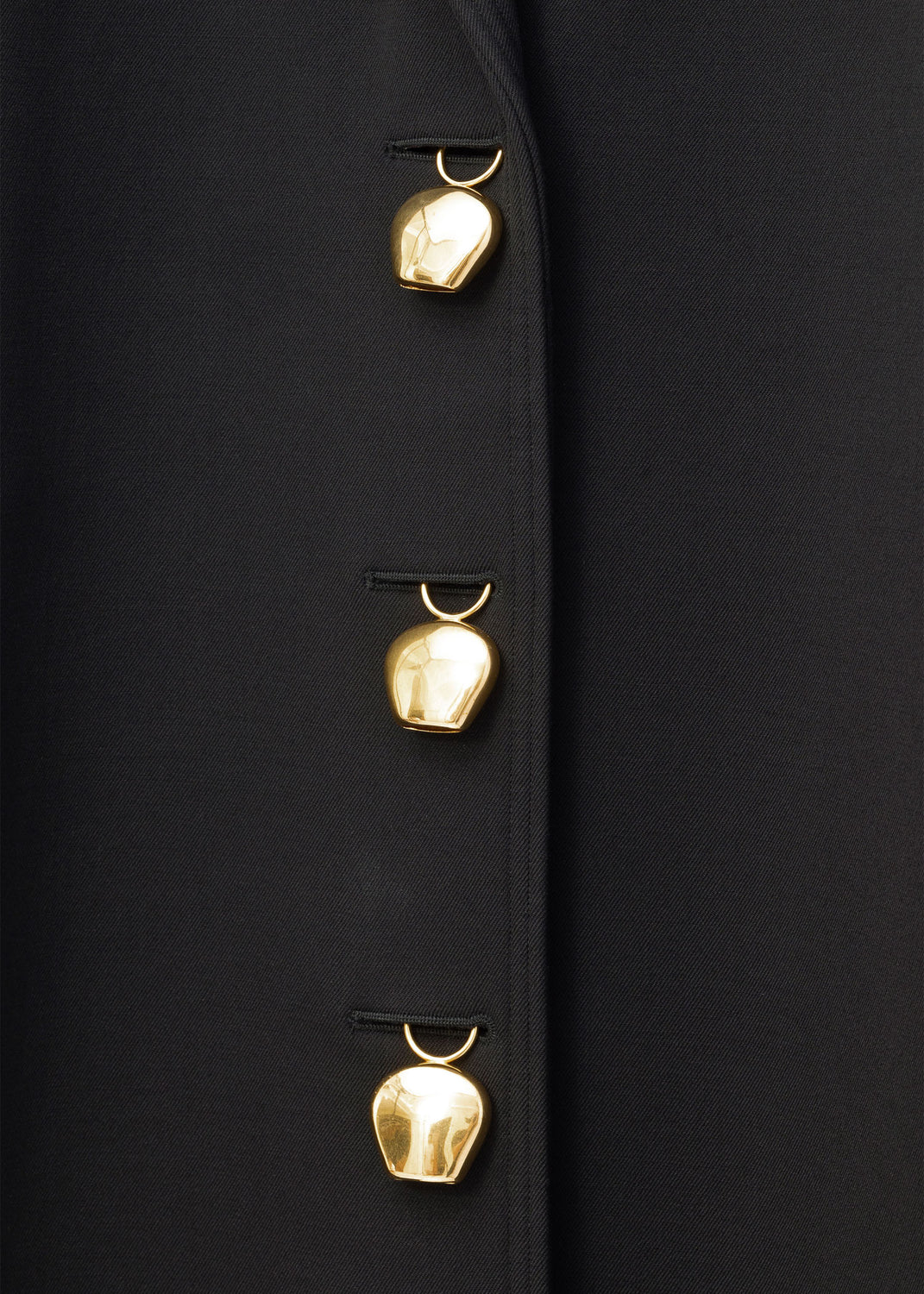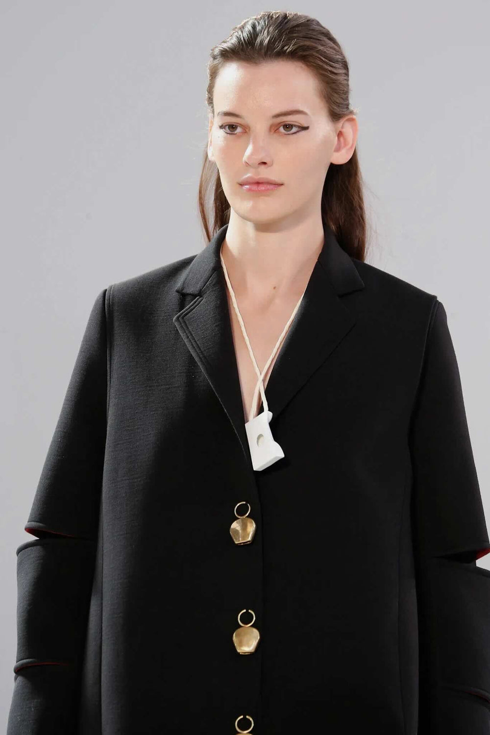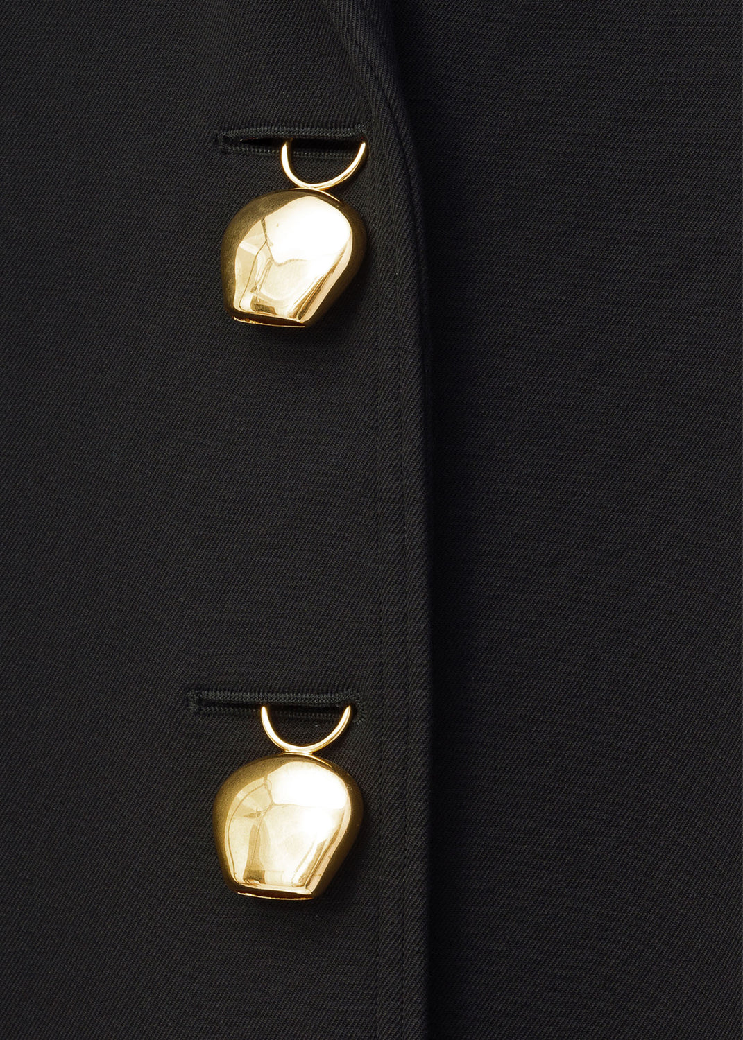 Instead of standard buttons, gold brass cowbell pendants close the front, functioning somewhere between fastening and ornament, and echoing the collection’s idea of “borrowed,” collected objects.