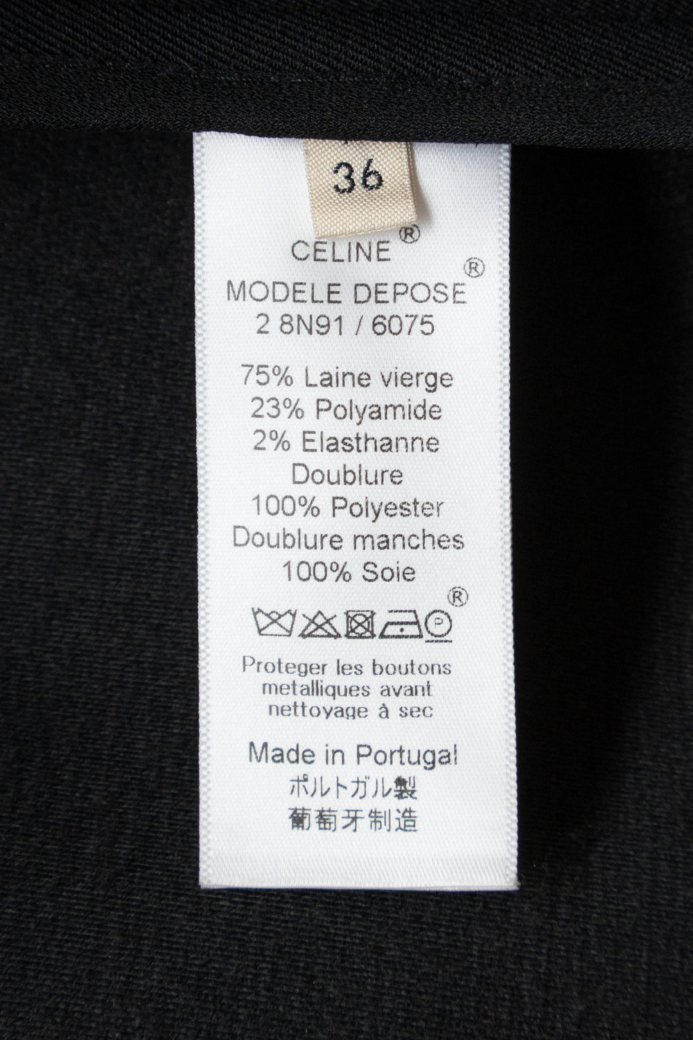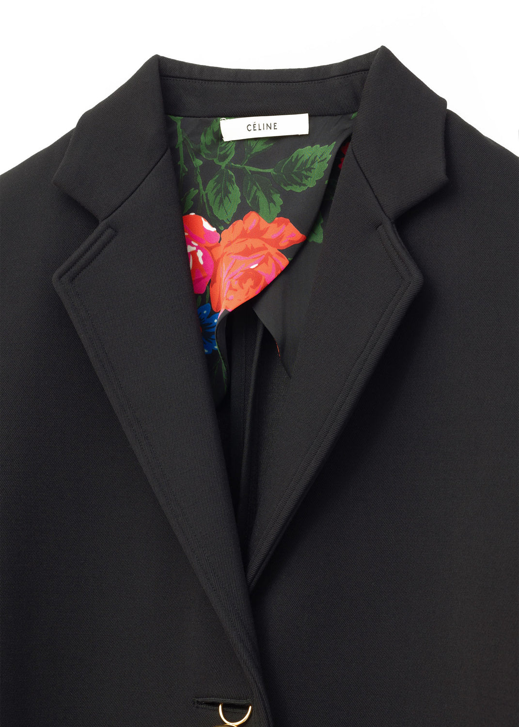 Material Stretch wool Composition 75% Virgin wool, 23% Polyamide, 2% Elastane Handle Soft, compact, weighty Weight Heavyweight Transparency No Stretch No Sheen No Lining Floral-print satin Composition 100% Polyester Sleeve lining Silk georgette Composition 100% Silk Buttons Gold-plated brass Composition 100% Brass InscriptionsLabel marked "CÉLINE"