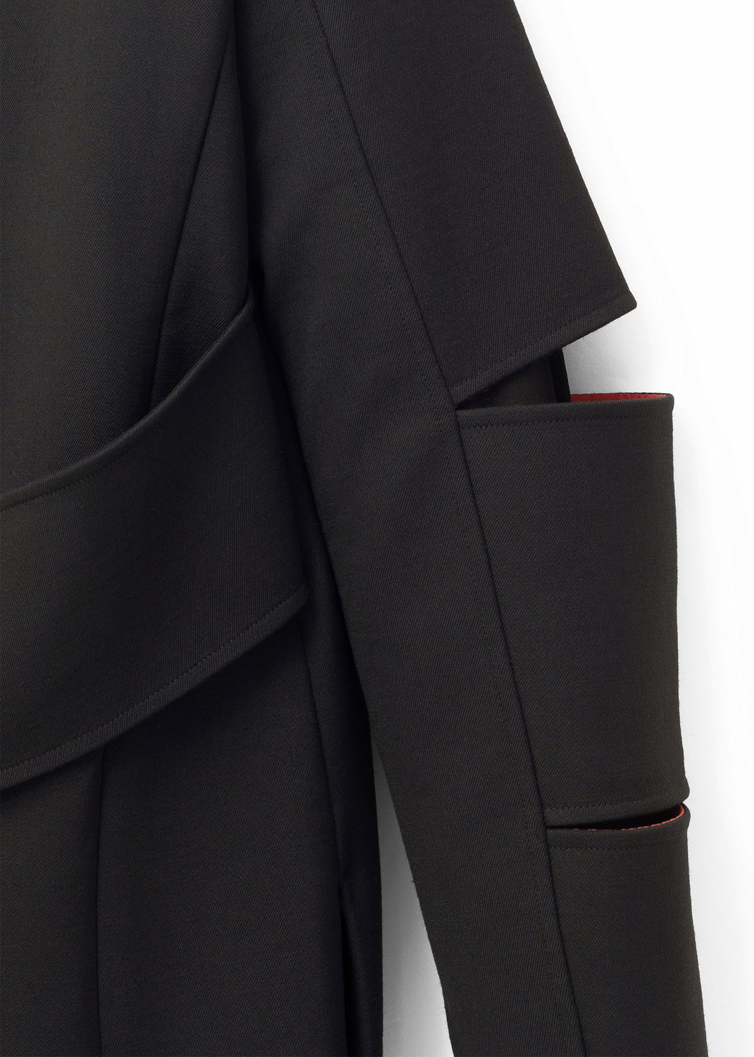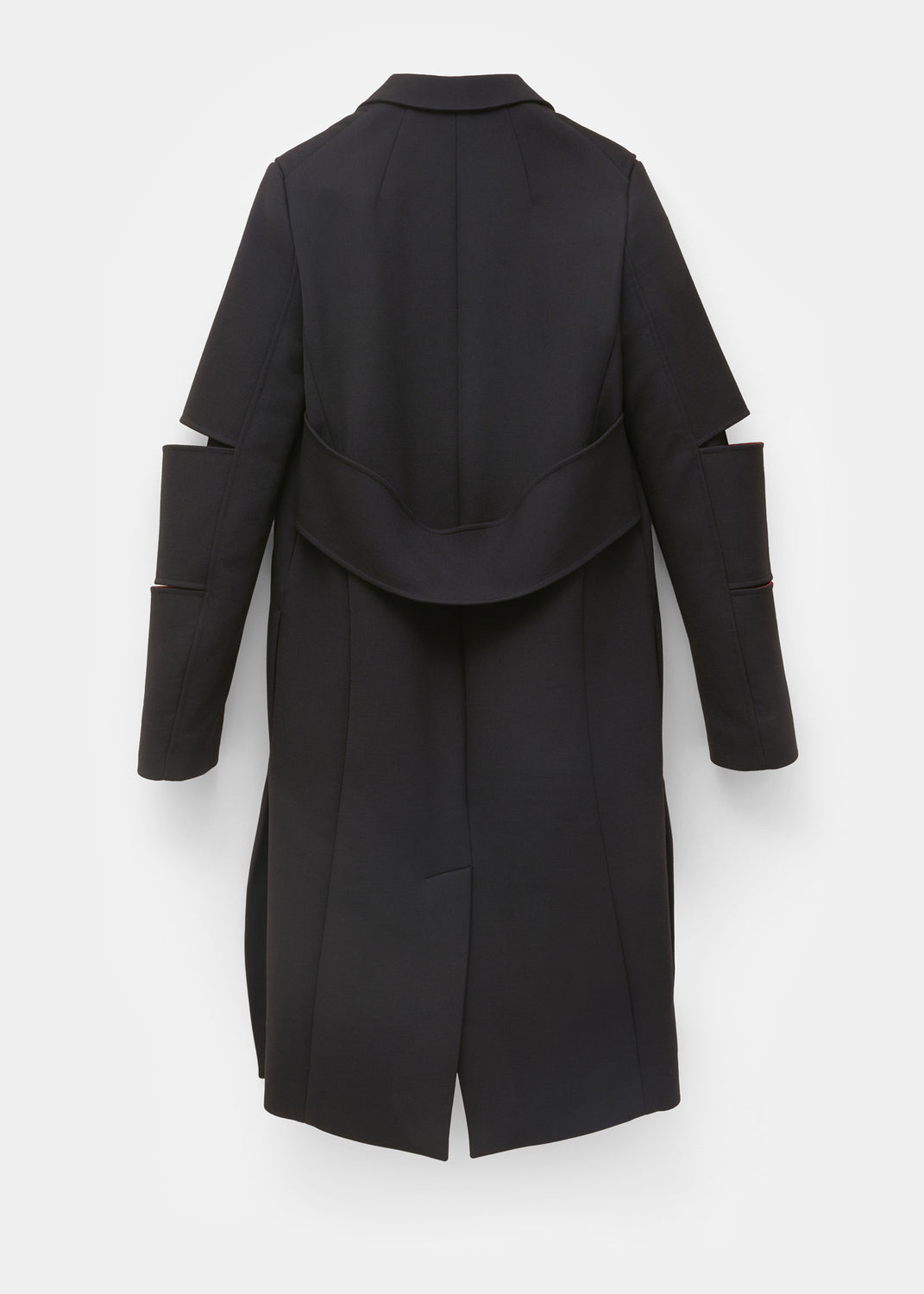 Cut in stretch wool, the coat features all the expected elements: a single-breasted front with notched lapels, a martingale belt at the back, and side pockets. Yet as a result of Philo’s approach, key details interrupt the familiarity, turning the coat into something quietly unconventional.