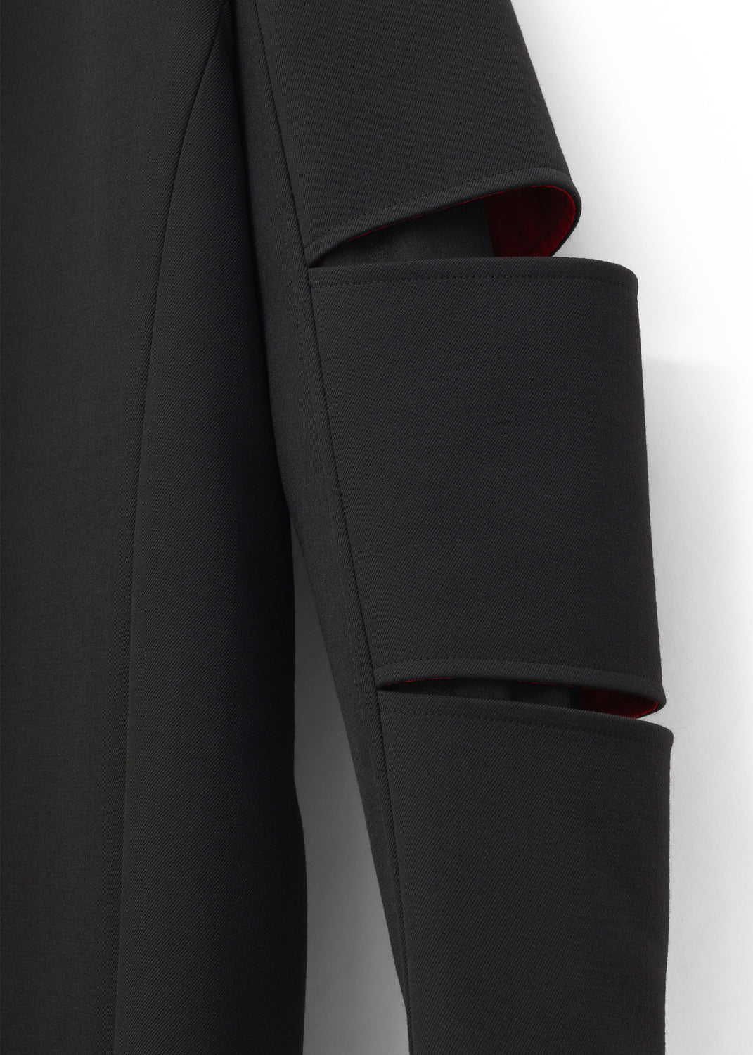 The sleeves are sliced at the elbow, revealing flashes of a bright red reverse side and a black silk georgette lining that faintly shows the arms. The sleeve heads are detached at the front of the shoulder, exposing hints of a floral satin lining. These interventions turn a straightforward sleeve into one designed for movement and visual interest.
