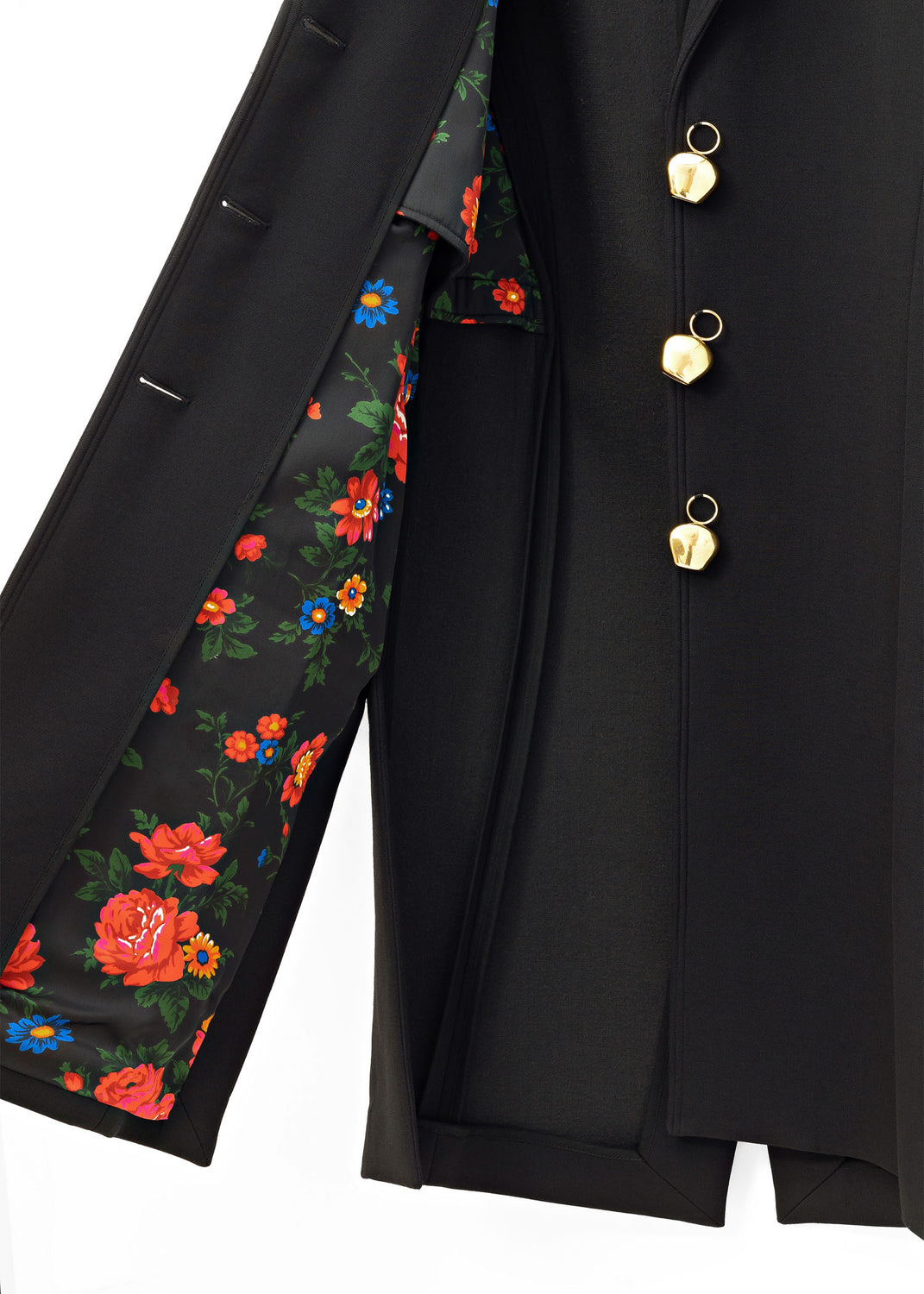 Inside, the same floral satin lines the front and the yoke of the coat—a bourgeois print that adds a vintage, sentimental note to the piece, and a feminine counterpoint to the monochrome exterior.