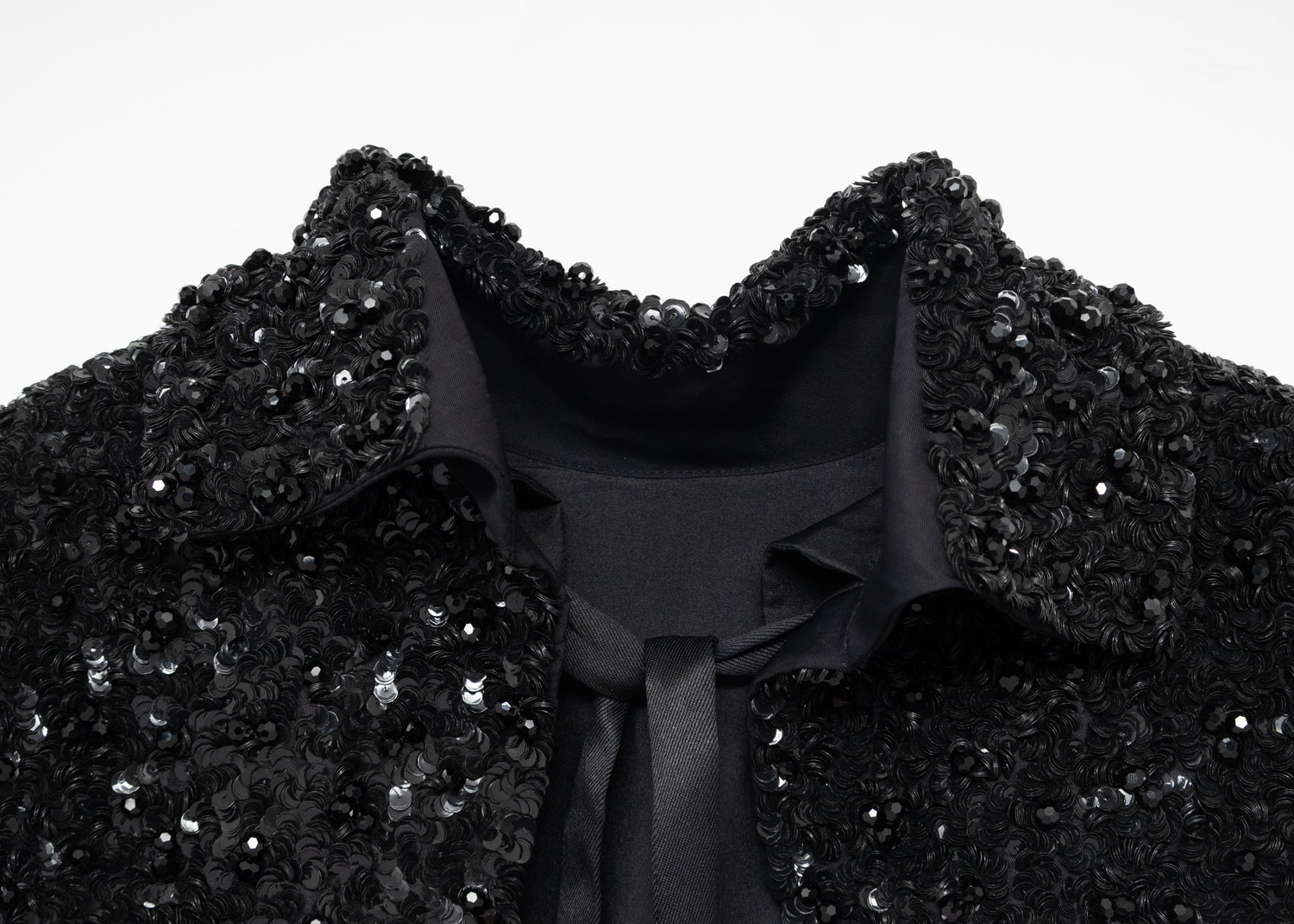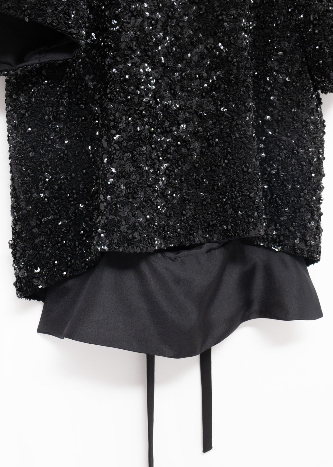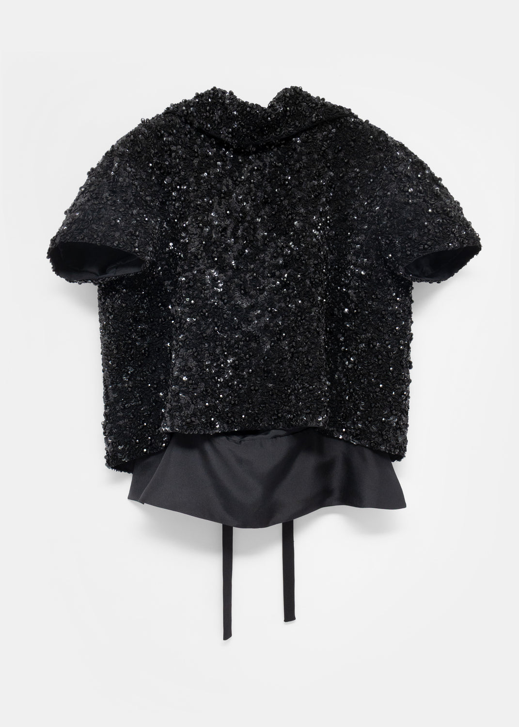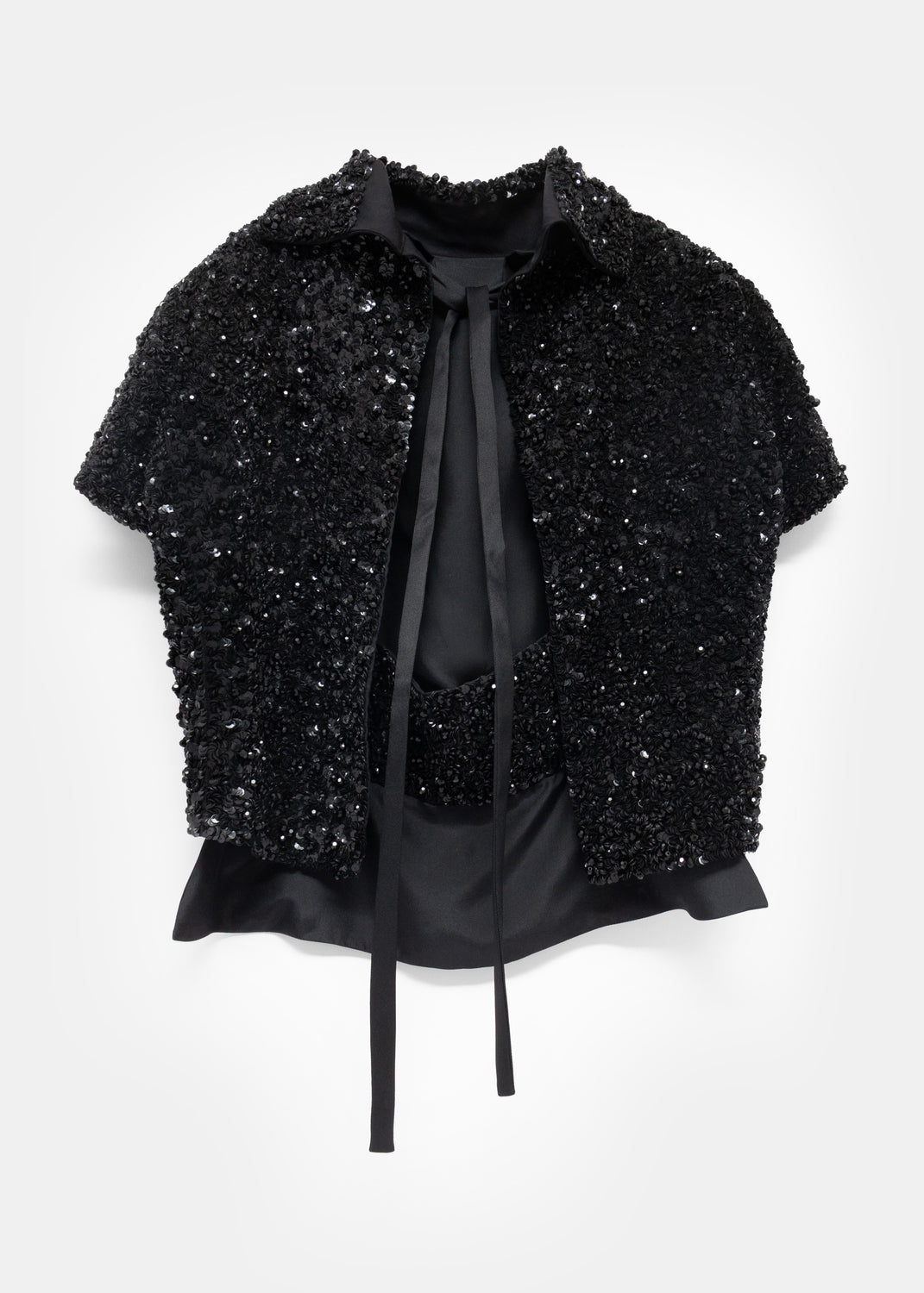 Cut like a loose bolero worn back to front, it is embellished with dense clusters of shiny black sequins, and further dotted with faceted black beads. A foldover collar and short sleeves frame the front, while the open back features long ties for closure.