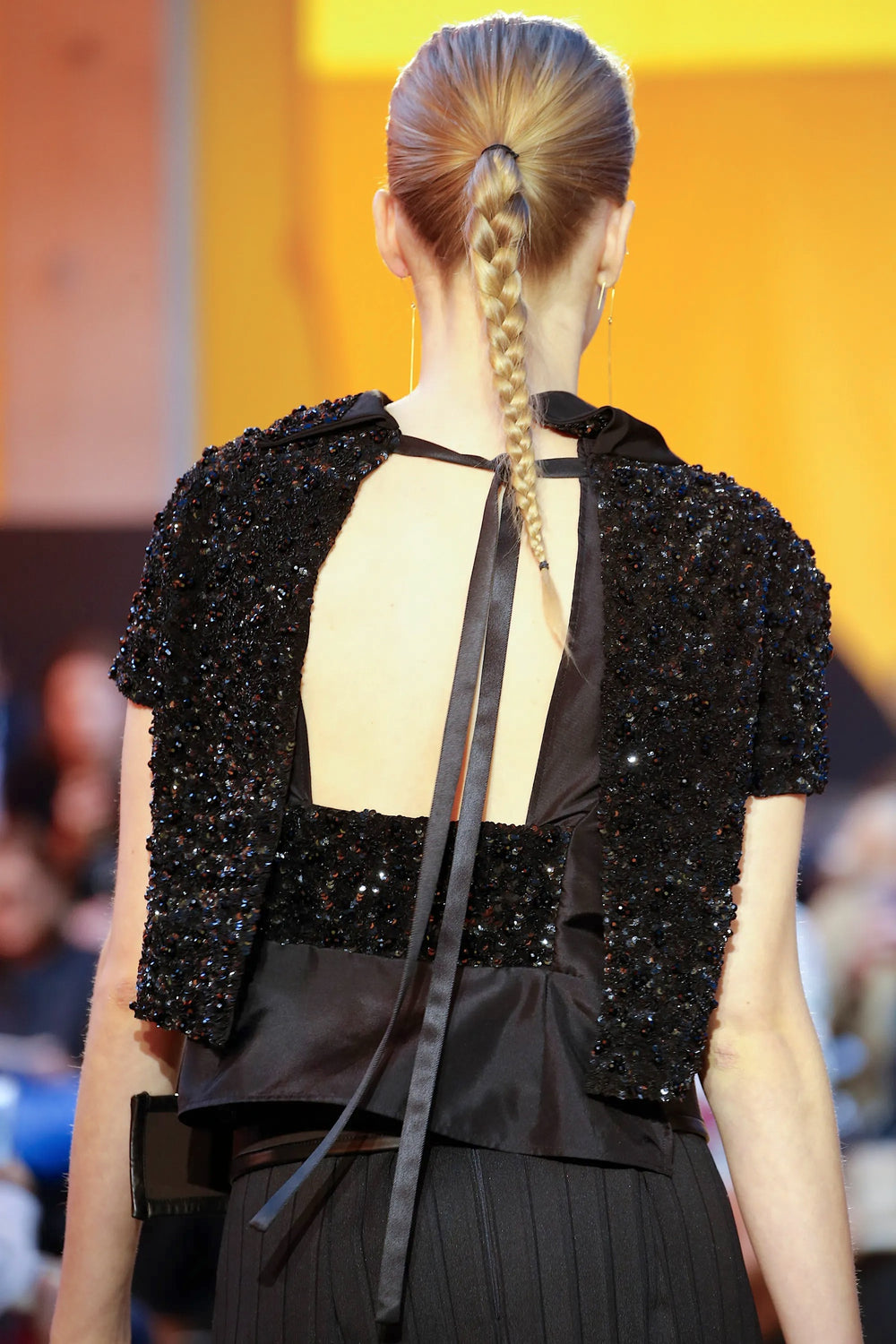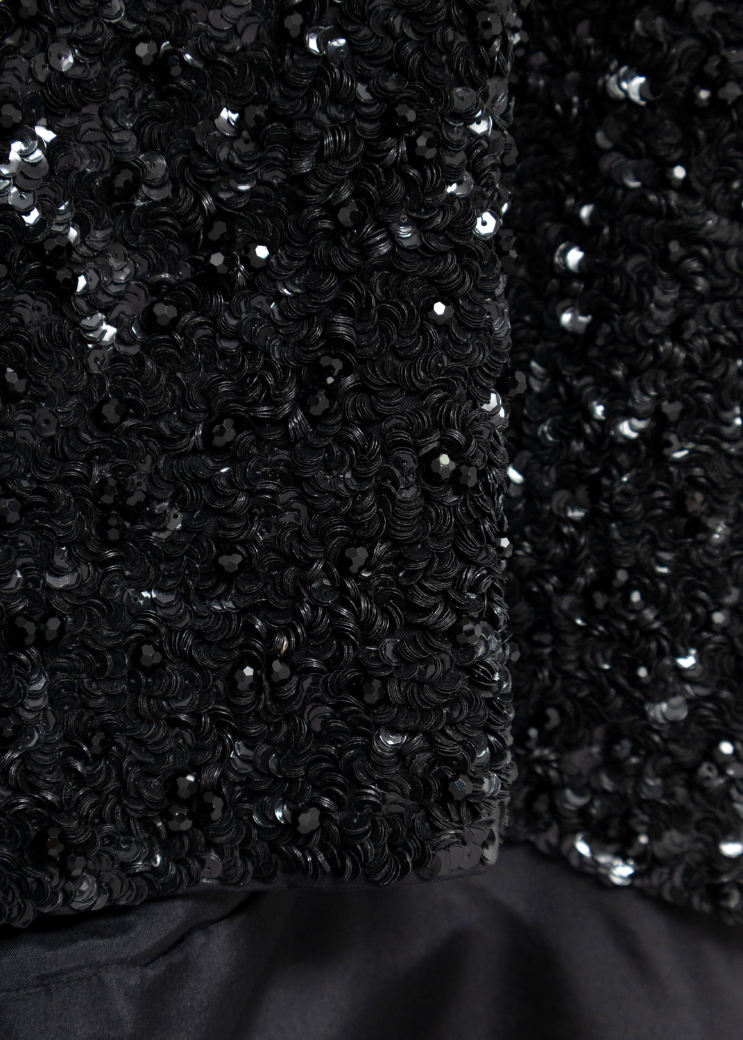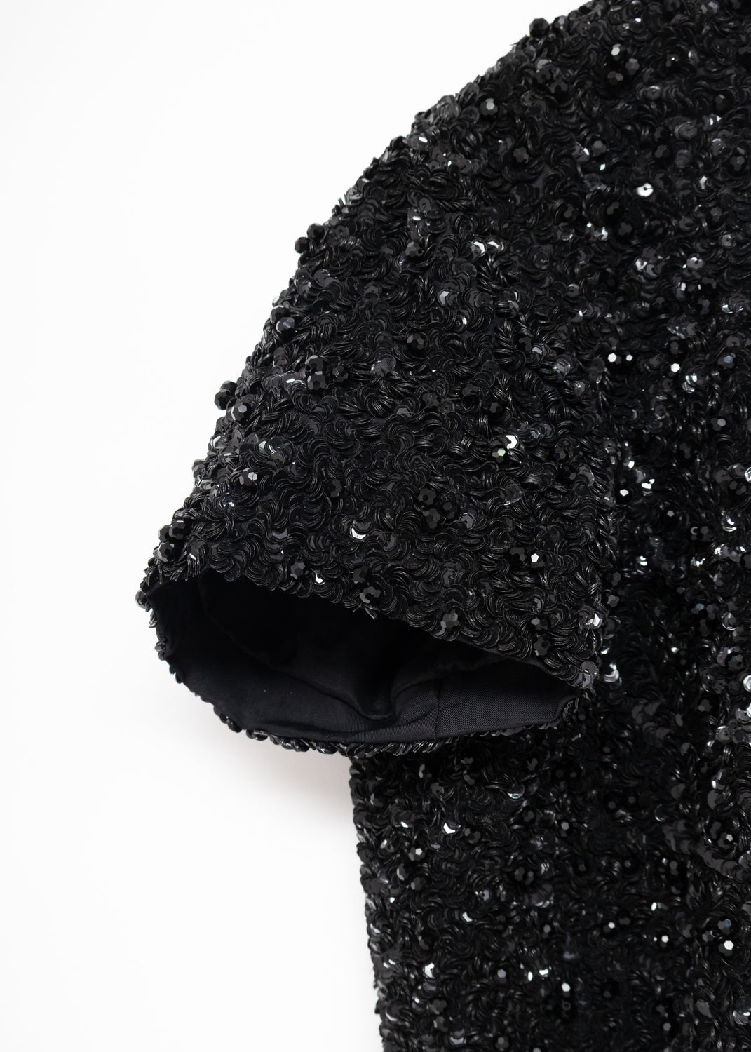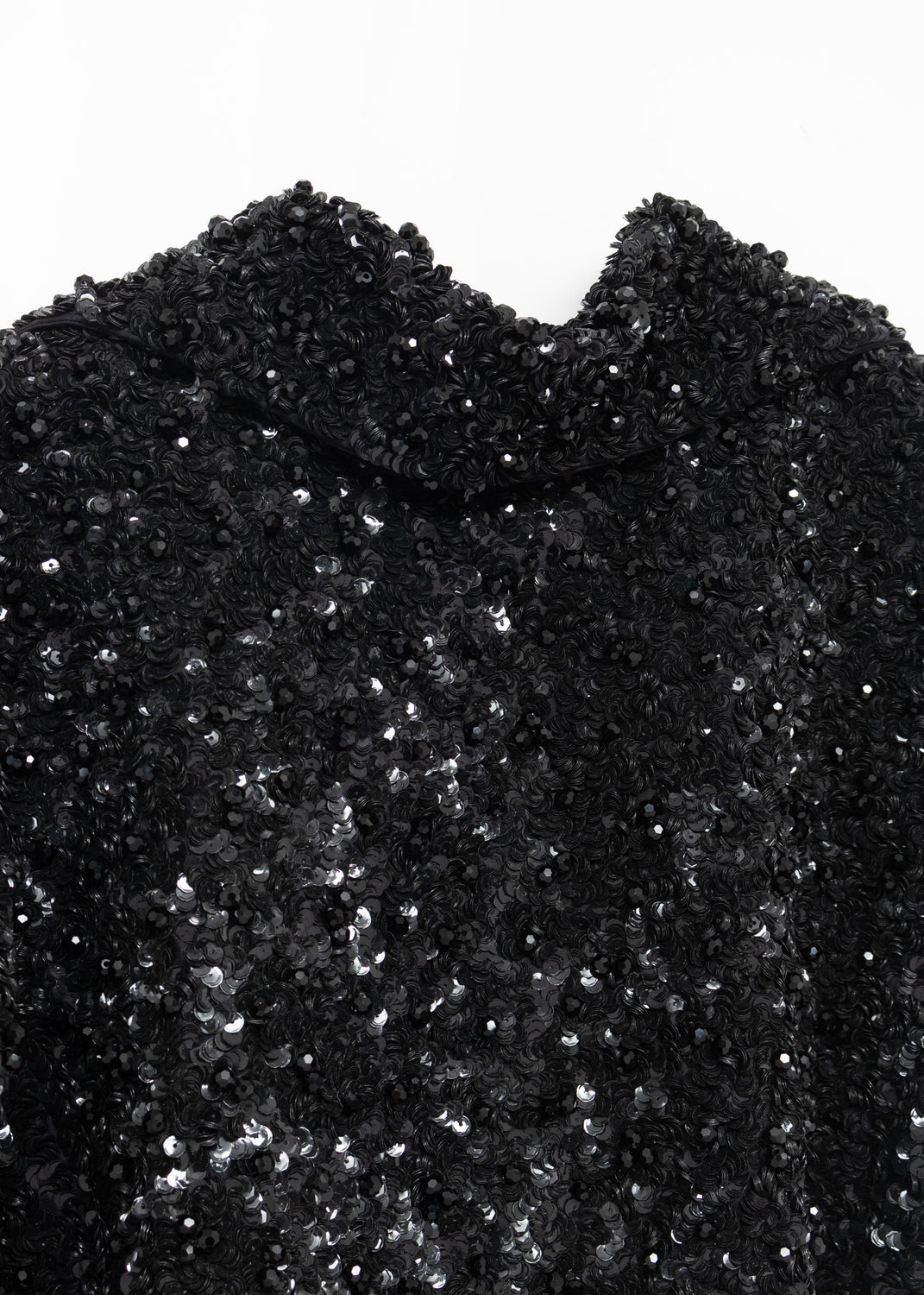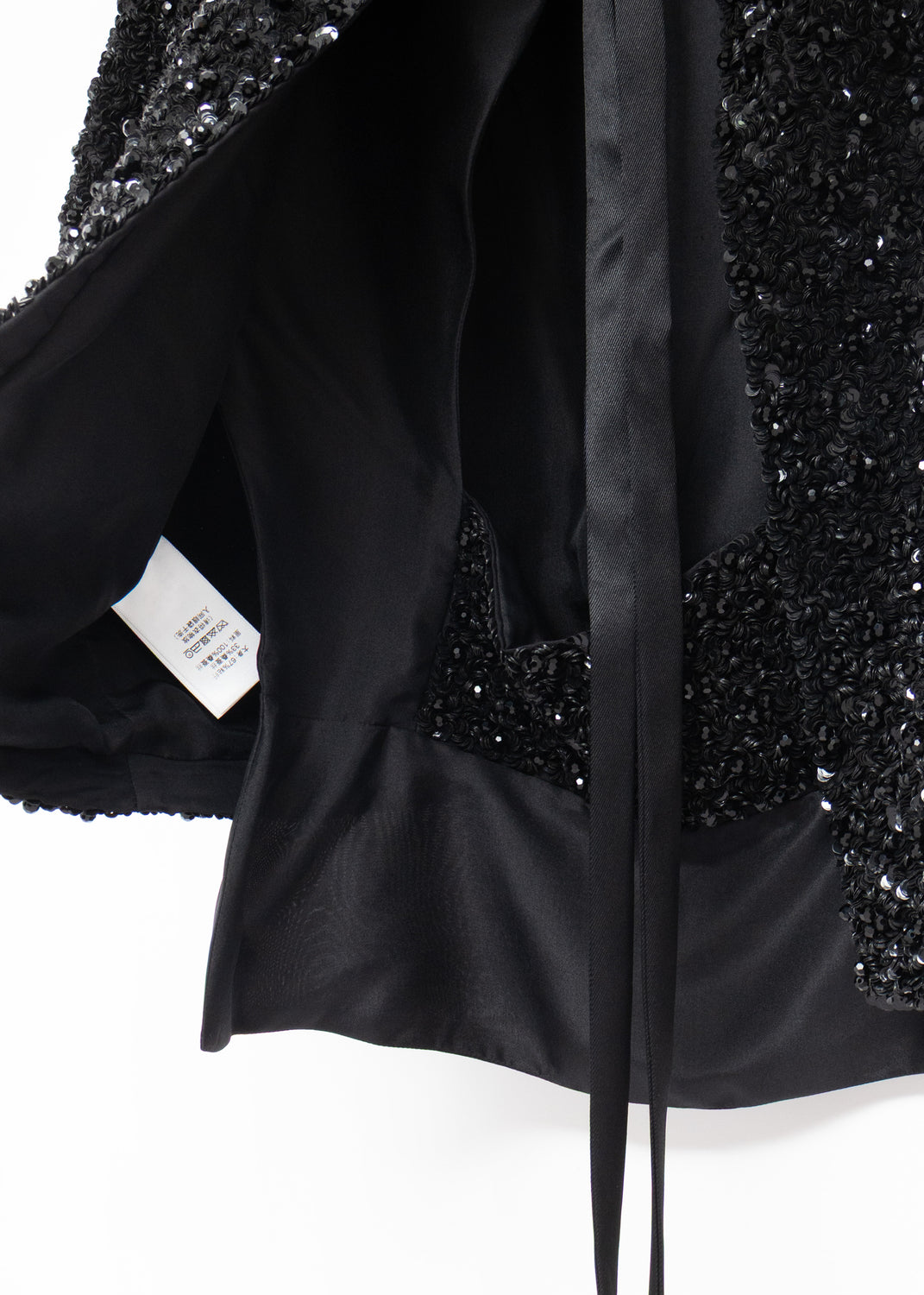 Cut like a loose bolero worn back to front, it is embellished with dense clusters of shiny black sequins, and further dotted with faceted black beads. A foldover collar and short sleeves frame the front, while the open back features long ties for closure.