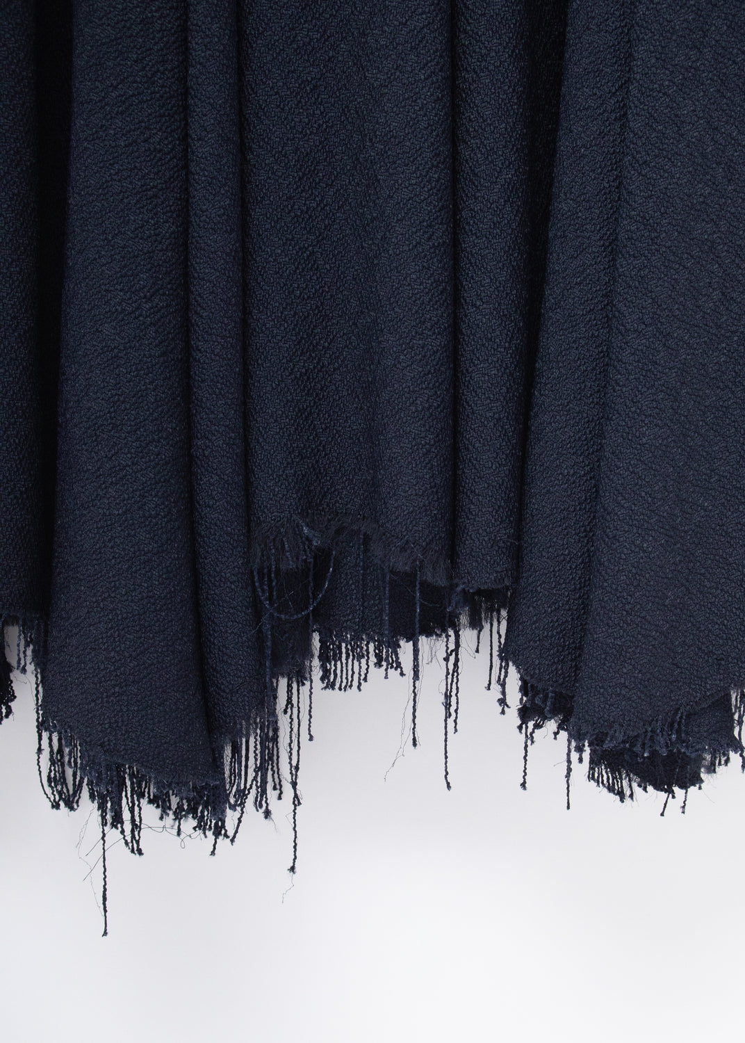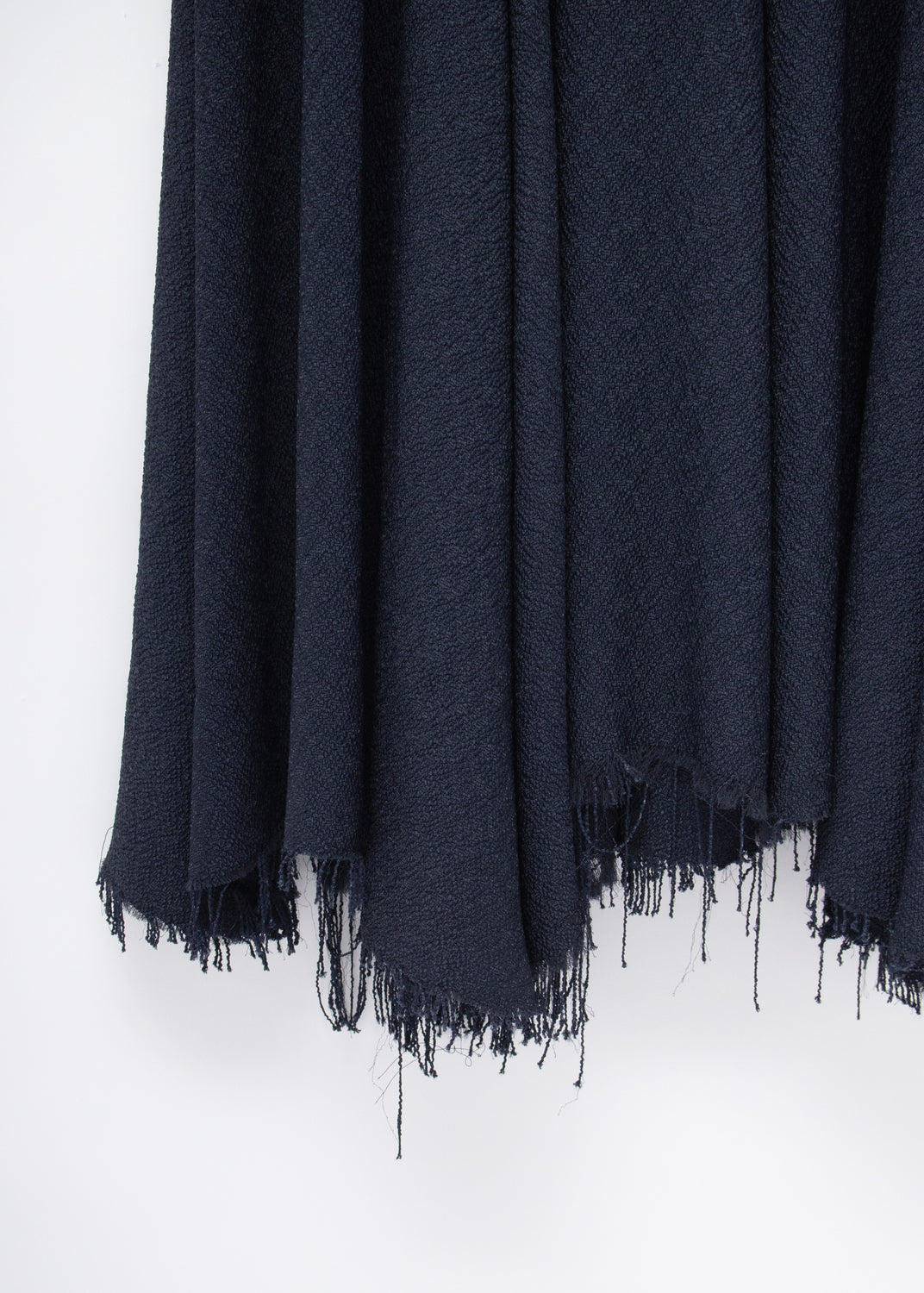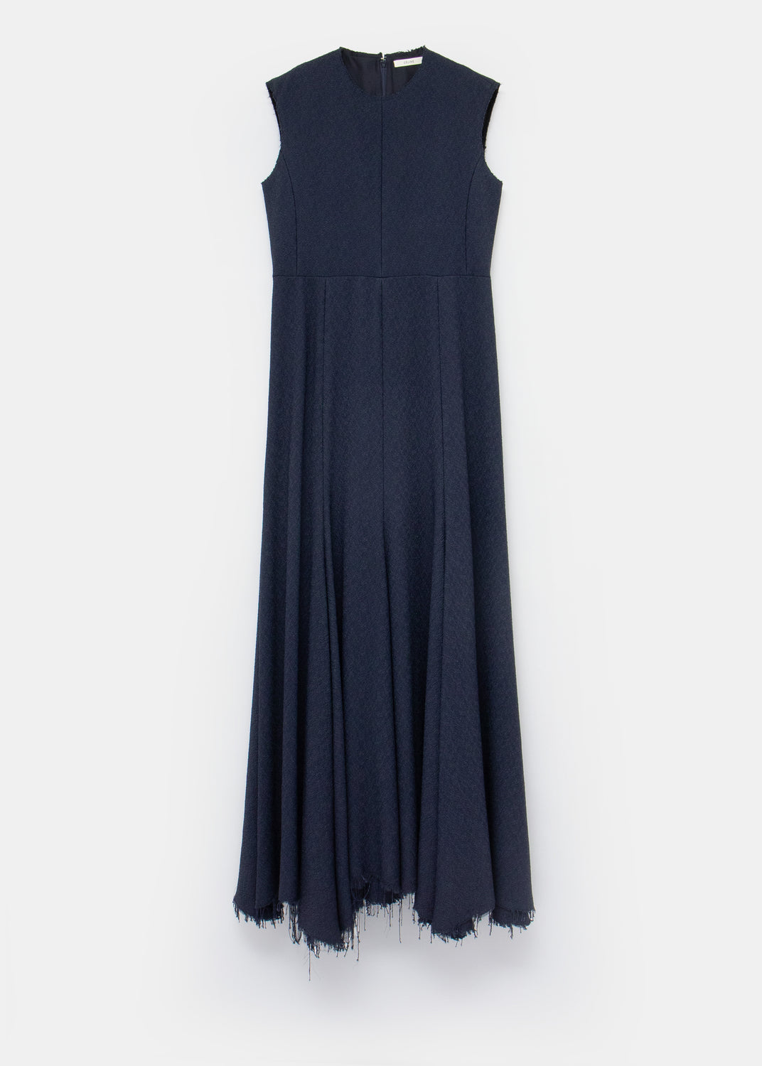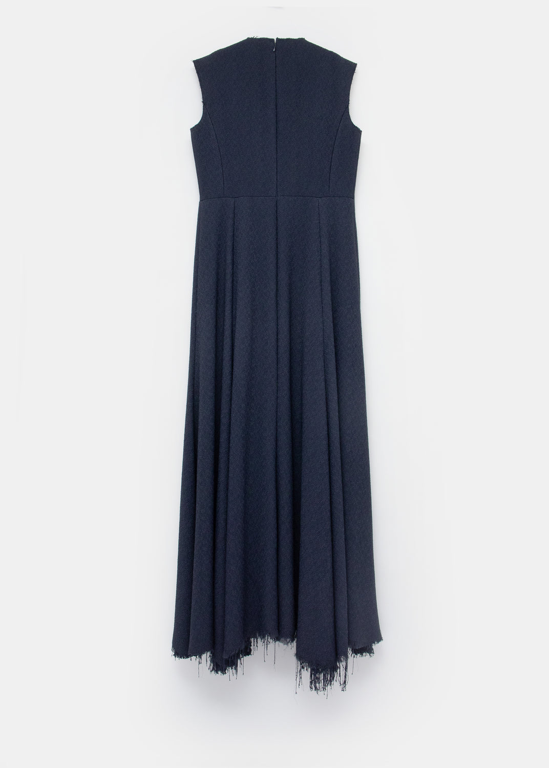 Cut in textured viscose sablé, its slightly cap-shouldered bodice fits close on the body and comes finished with raw edges on the armscyes and collar. The waist seam is placed high against the long, ankle-length, flared skirt for an elongating effect. The skirt is generously cut with wide panels that flare out as one moves in it, ending in thread-heavy, fringed hems.