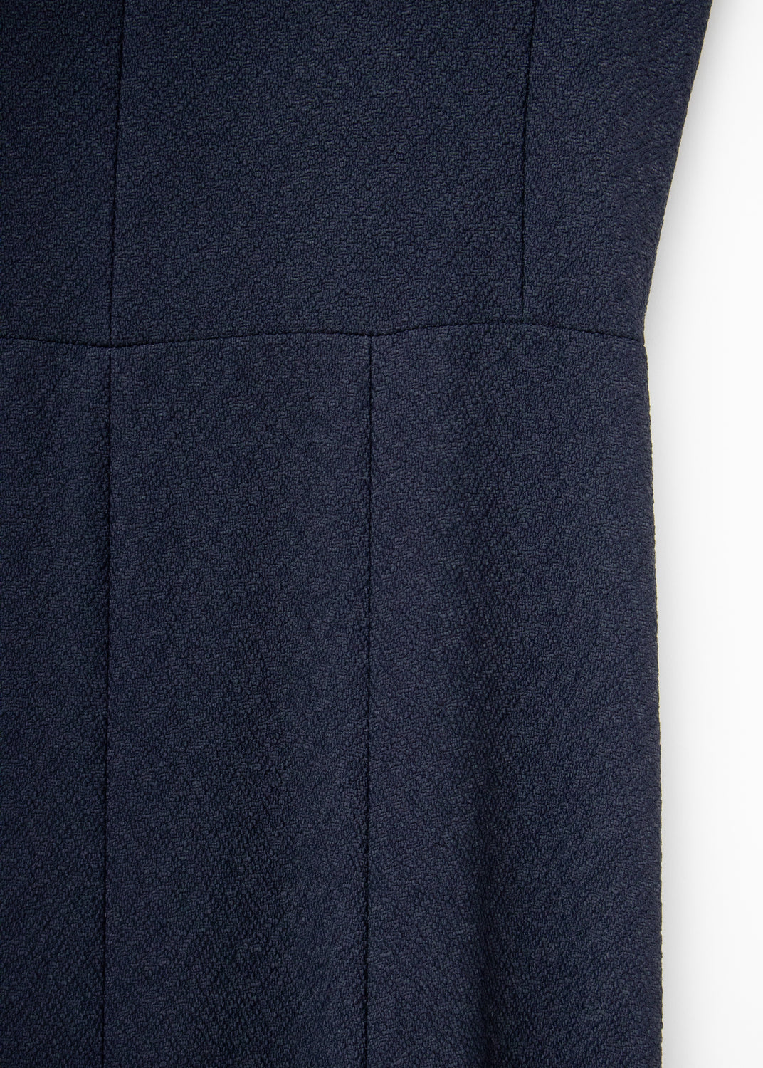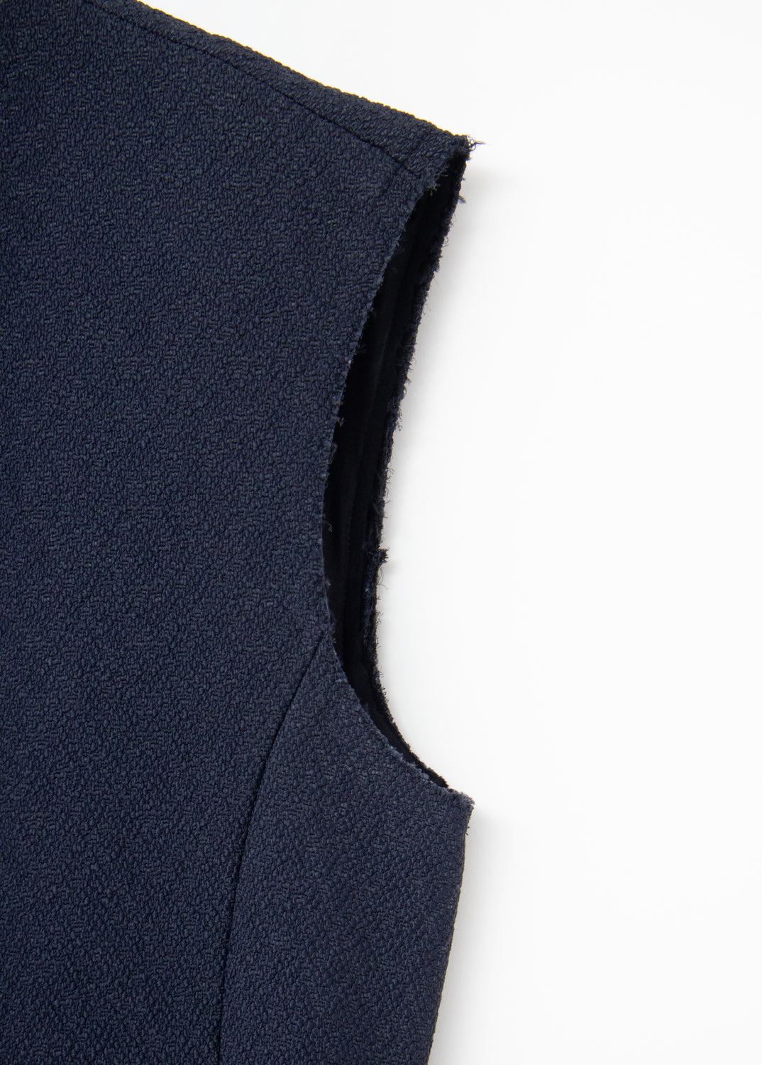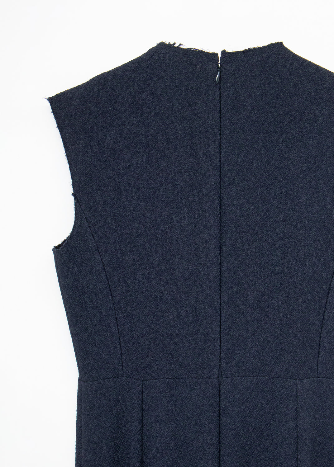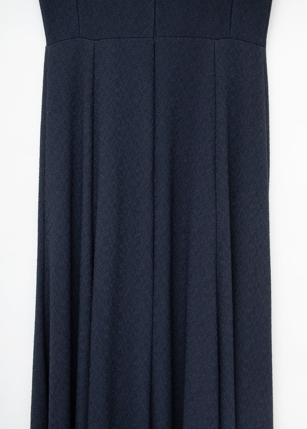 Cut in textured viscose sablé, its slightly cap-shouldered bodice fits close on the body and comes finished with raw edges on the armscyes and collar. The waist seam is placed high against the long, ankle-length, flared skirt for an elongating effect. The skirt is generously cut with wide panels that flare out as one moves in it, ending in thread-heavy, fringed hems.