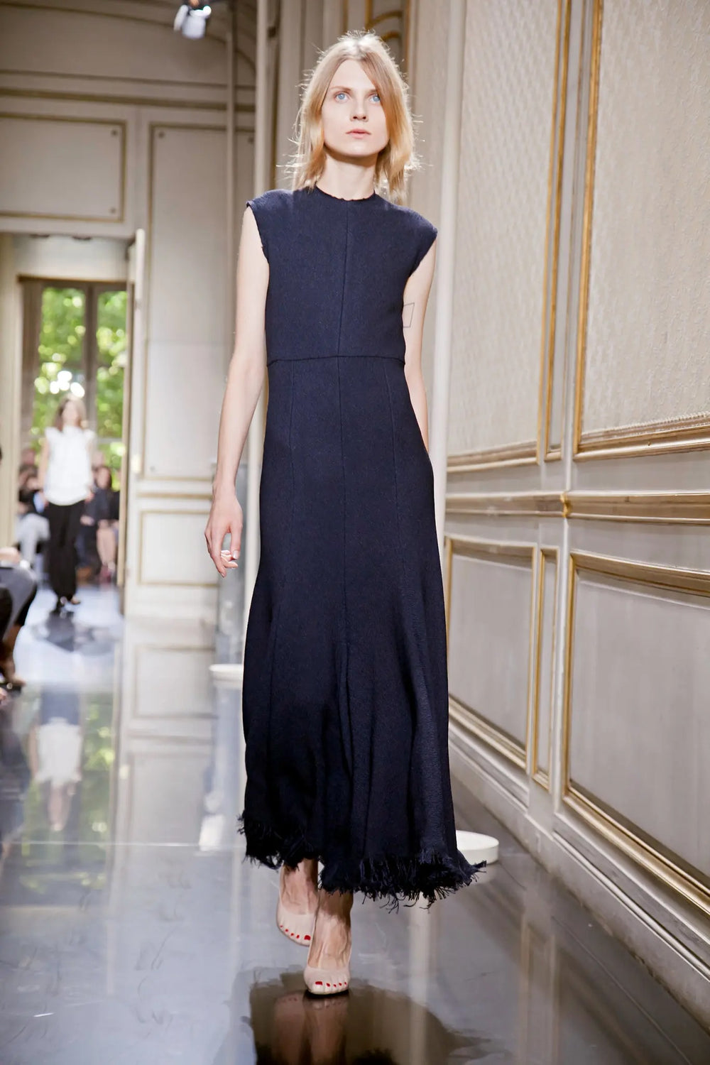 For Spring 2013, Phoebe Philo eased the rigor of Céline, loosening the rigid and linear silhouettes into more fluid, relaxed shapes, with frayed edges and fabric twists that evoked a sense of refined nonchalance. Shown in Look 15, this deep navy dress captures just that.