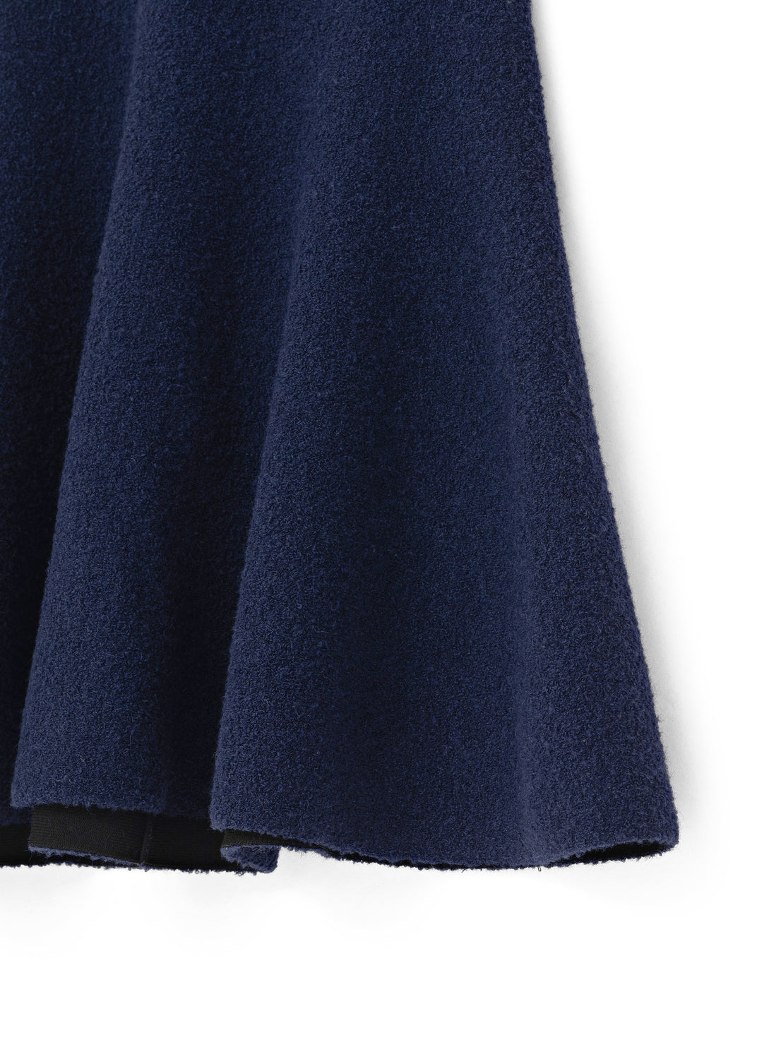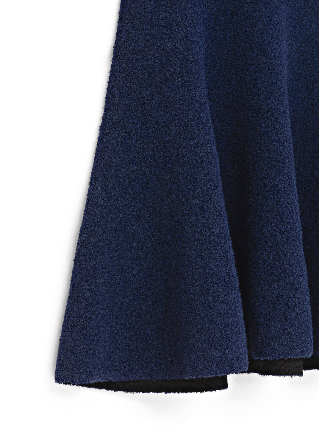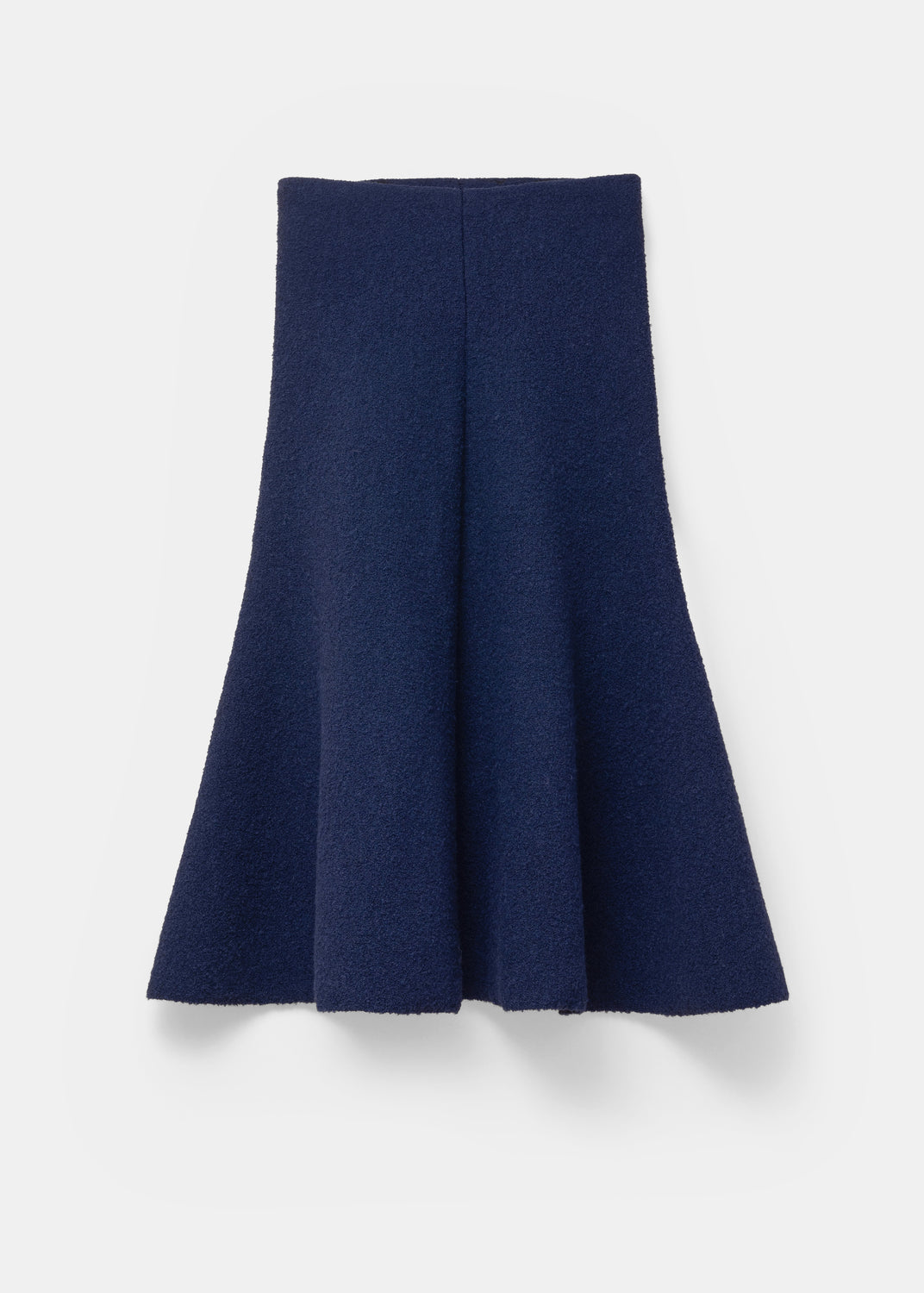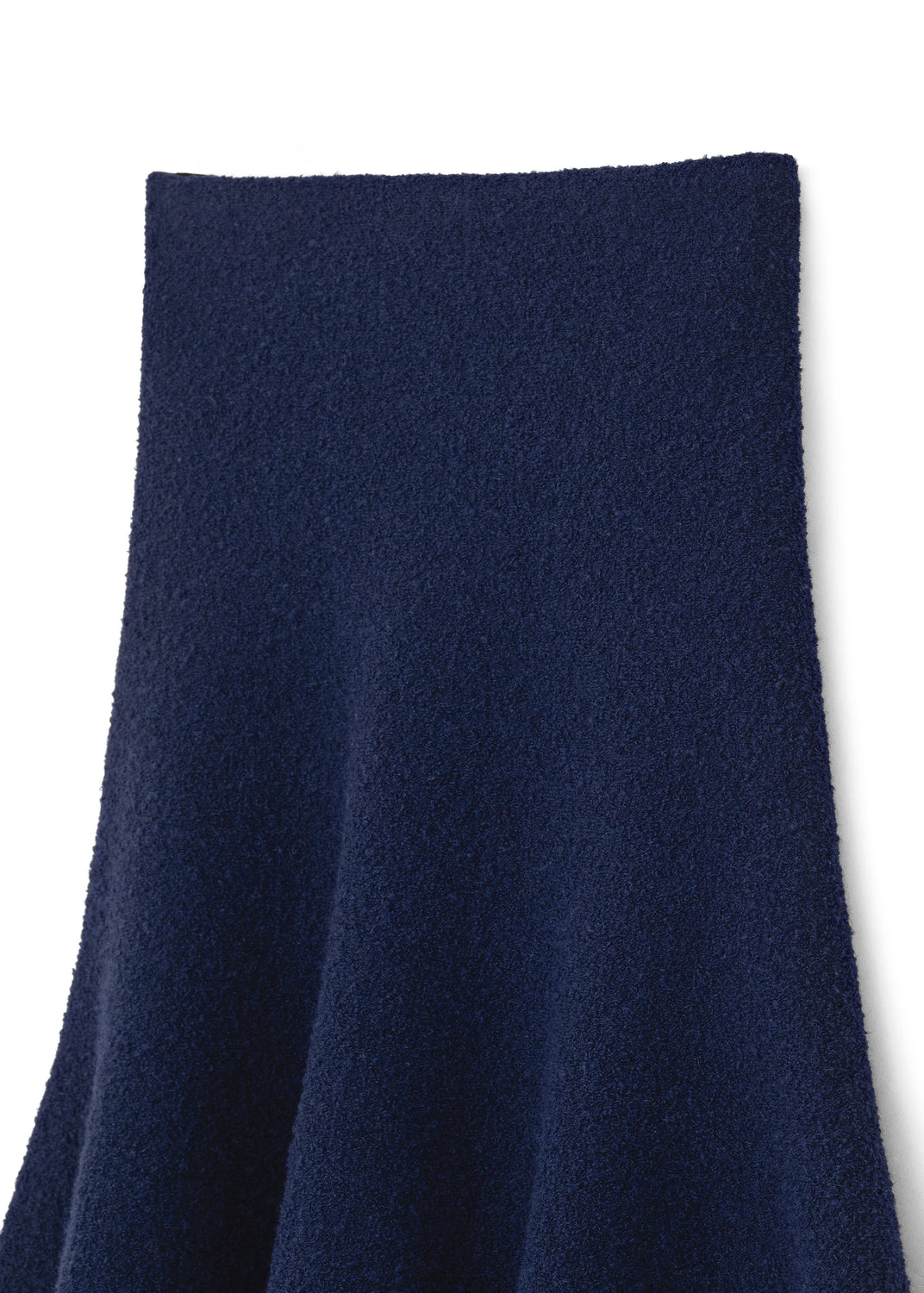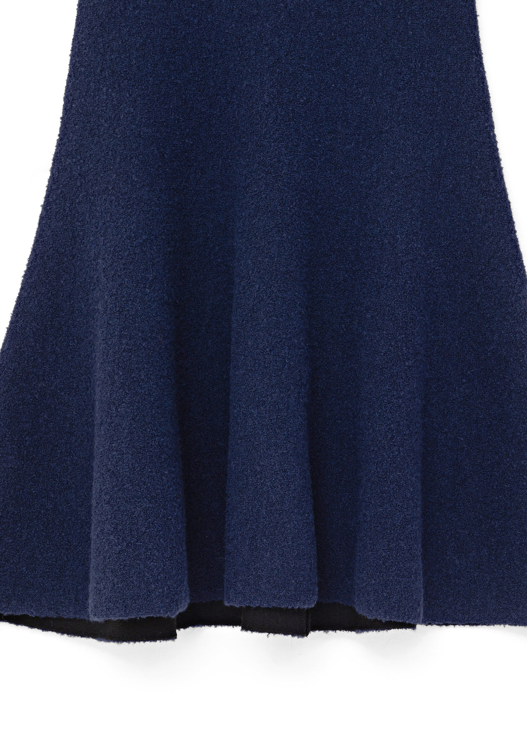 This trumpet skirt showcases that approach: made in dense navy alpaca-wool stretch bouclé, a single, precisely cut panel is looped to meet onto one seam at the center back for clean, minimal line.