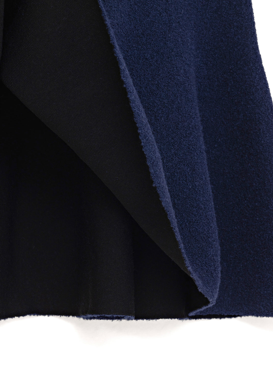It fits smoothly through the waist and hip, and opens into a flared hem that falls in gentle folds, giving the skirt a subtle swing in motion. The full knit construction and pull-on waist reinforce the idea of ease, while the deep navy pile lends a soft, fuzzy hand.