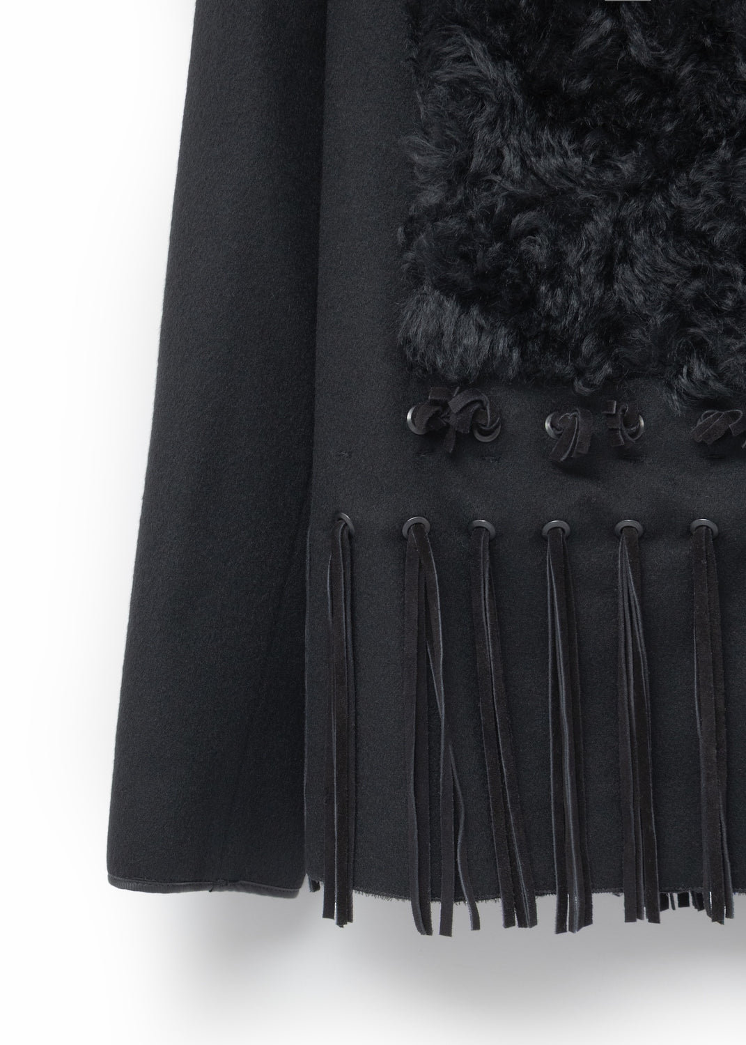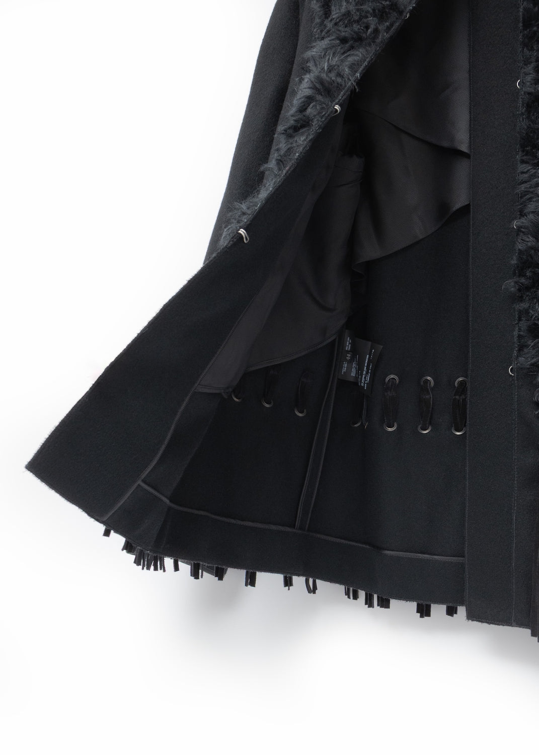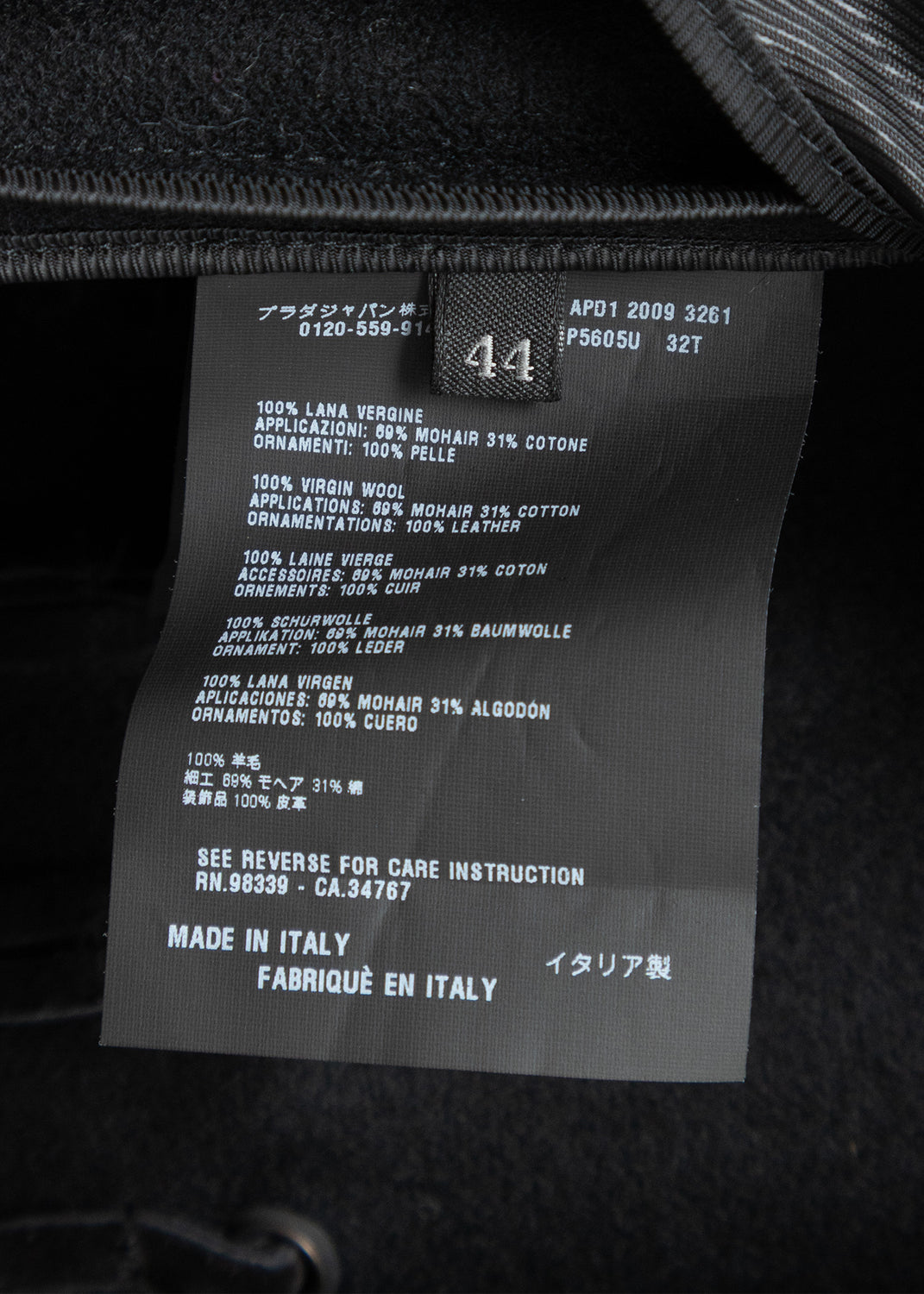 Material Double-face wool Composition 100% Wool Handle Soft, brushed, smooth Weight Midweight Transparency No Stretch No Sheen No Front panels Curly mohair Composition 69% Mohair, 31% Cotton Fringes Suede Composition 100% Leather InscriptionsLabel marked "PRADA Made in Italy"