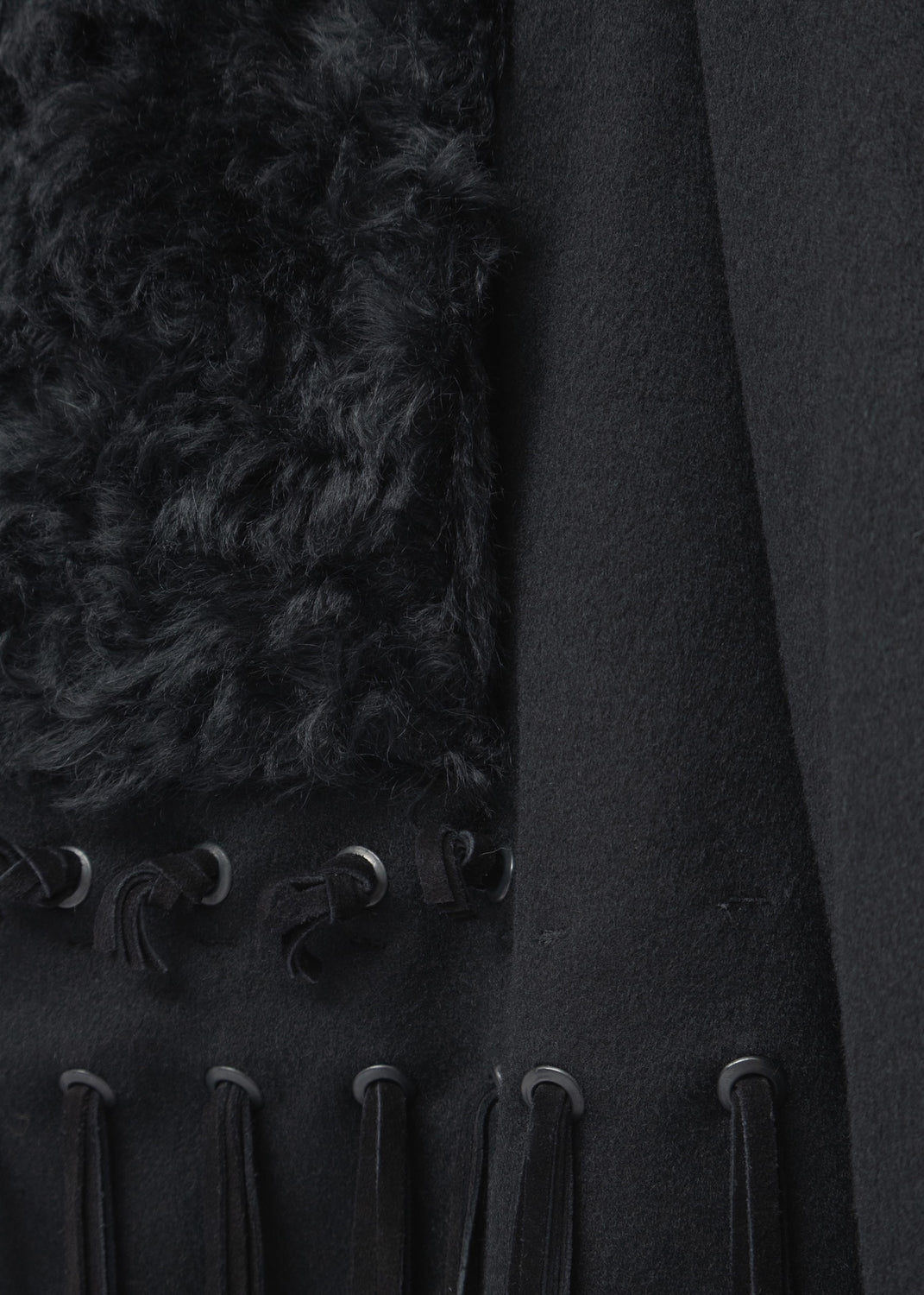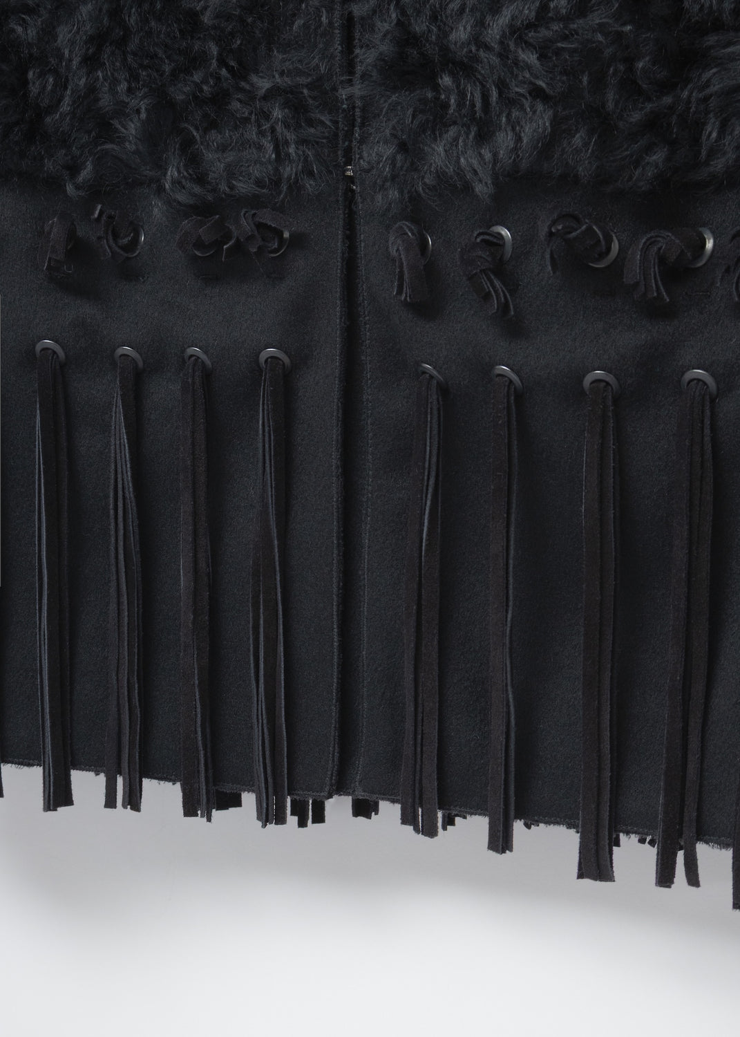 Suede fringes knotted on metal eyelets