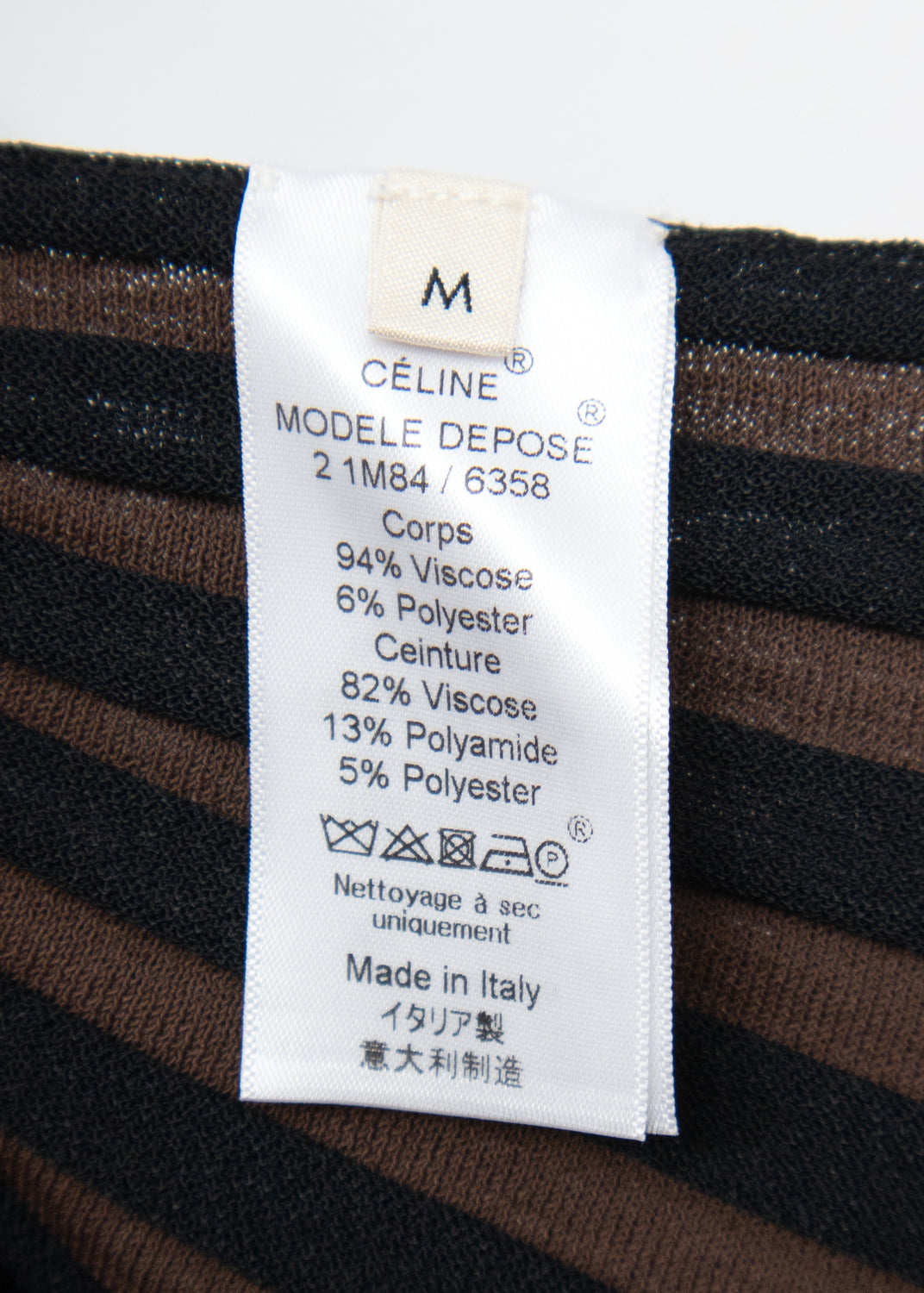 Material Fluid viscose rib-knit Composition 94% Viscose, 8% Polyester Handle Soft, fluid, stretchy, weighty Weight Heavyweight Transparency Yes Stretch Yes Sheen No InscriptionsLabel marked "CÉLINE"