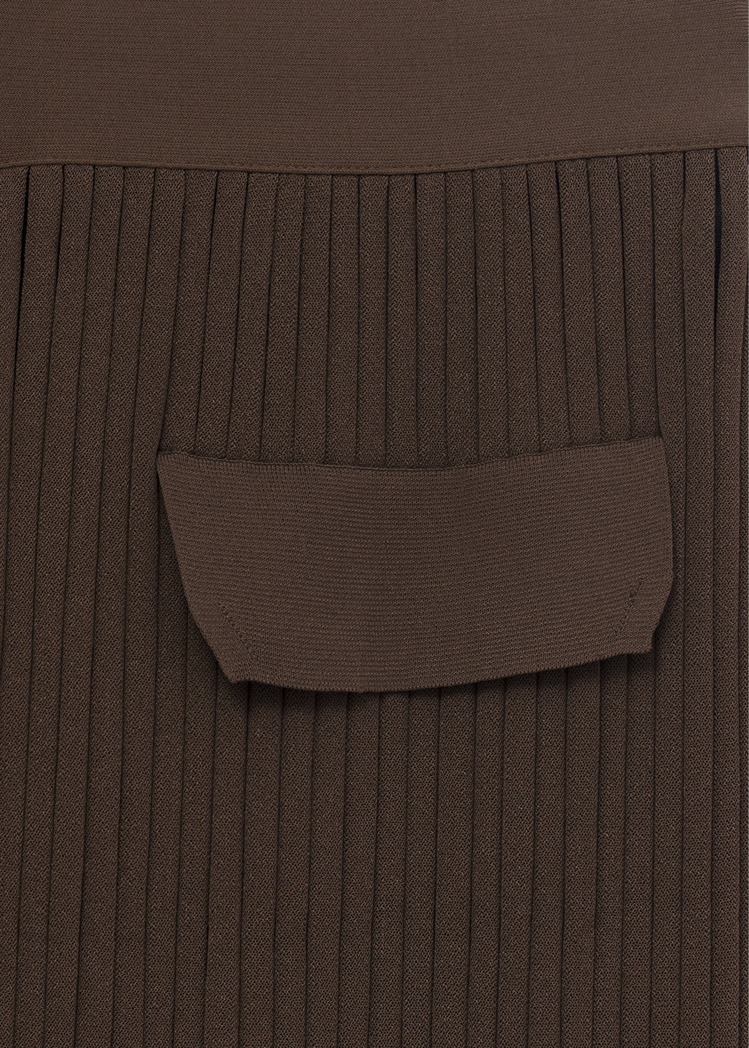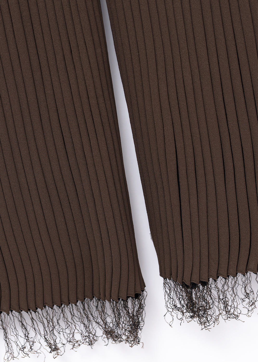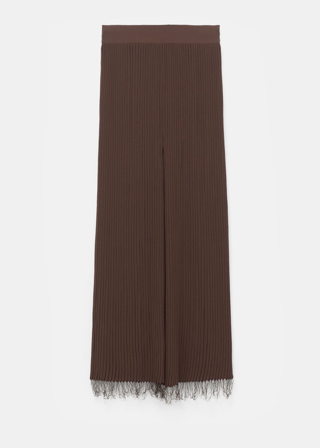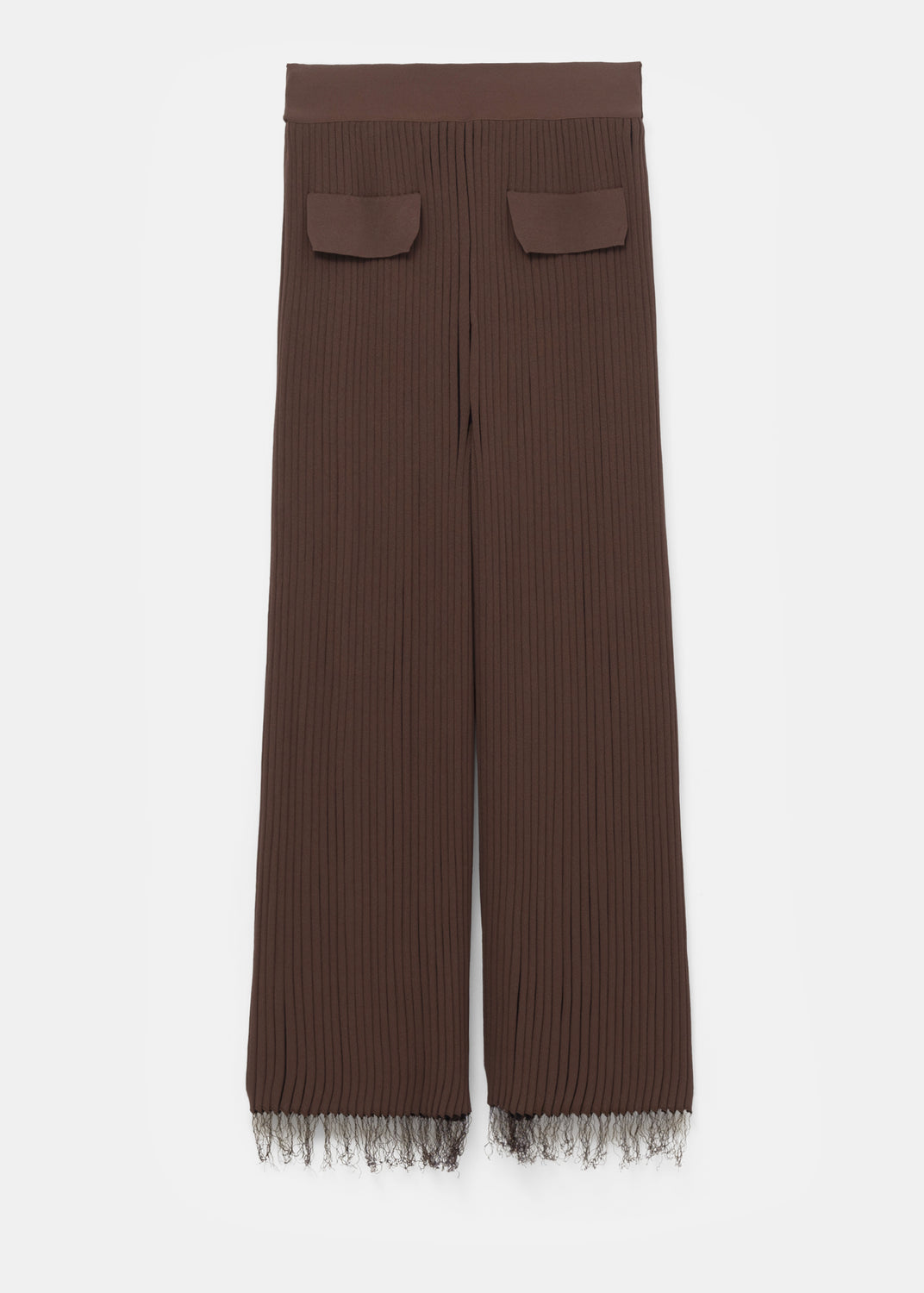 Shown in Céline’s Pre-Fall 2015 lookbook, these fringed pants are made in Italy from a brown viscose rib knit that is fluid, weighty, and generously stretchy. In movement, they reveal a two-tone knit construction, with black ribs visible between the brown.