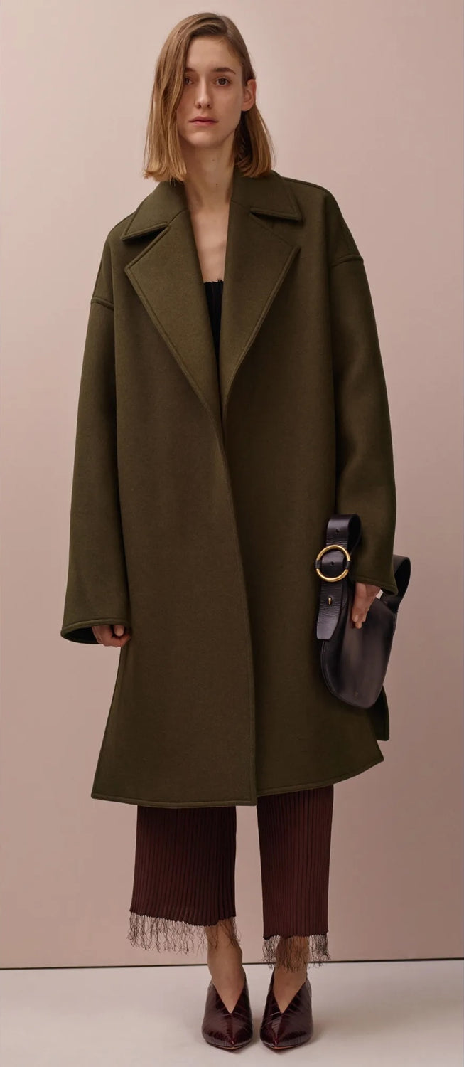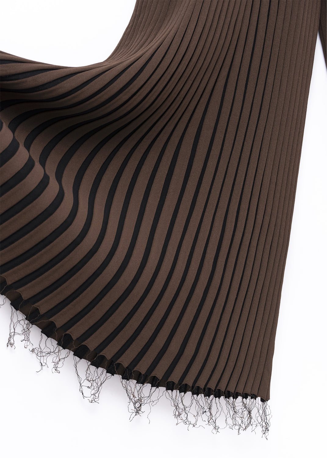 The hems are finished with fringes, which are the loose threads left at the end of the machine-knitting process. They are kept untrimmed and turned into embellishment—a form of decoration that results directly from the way the fabric is made.