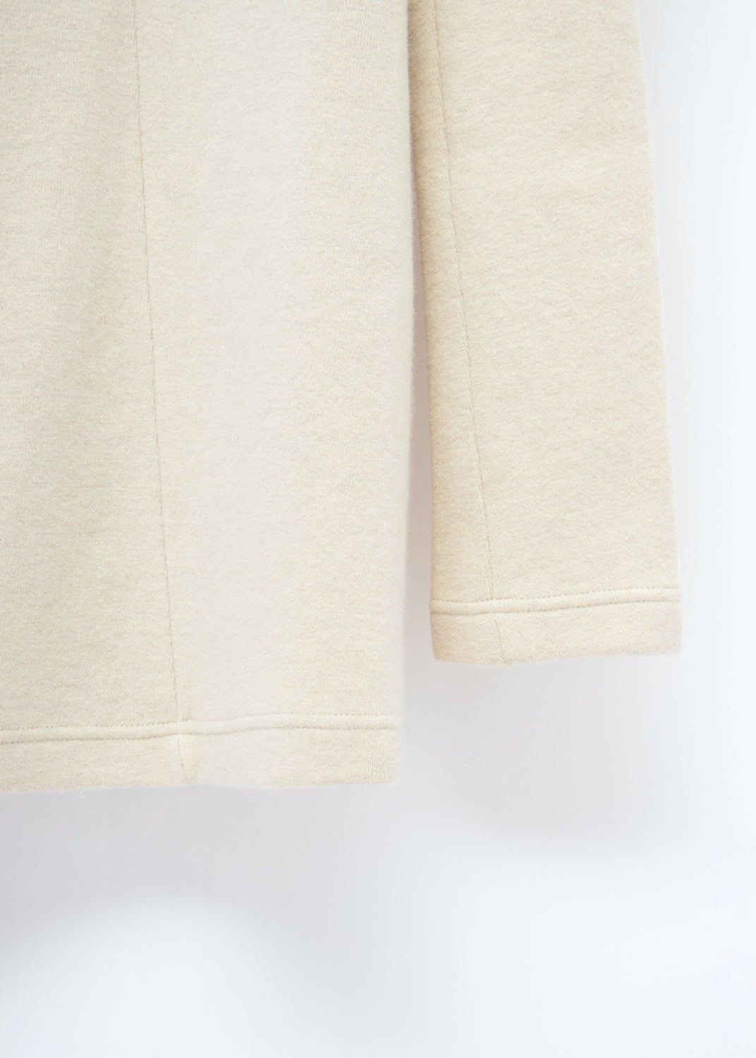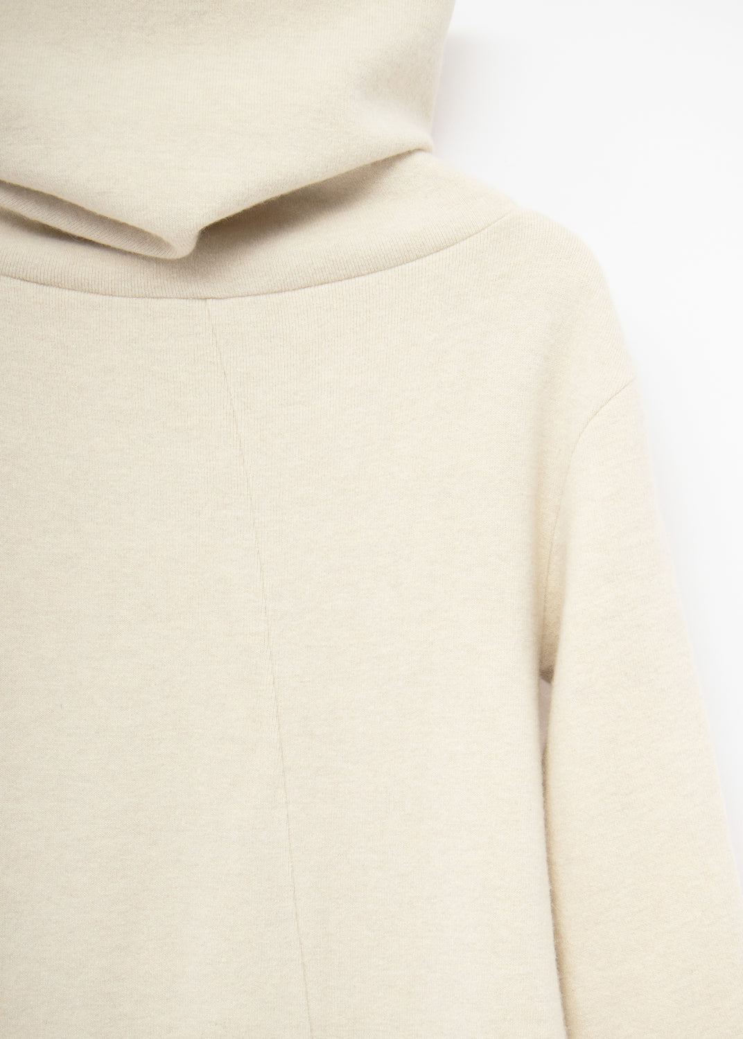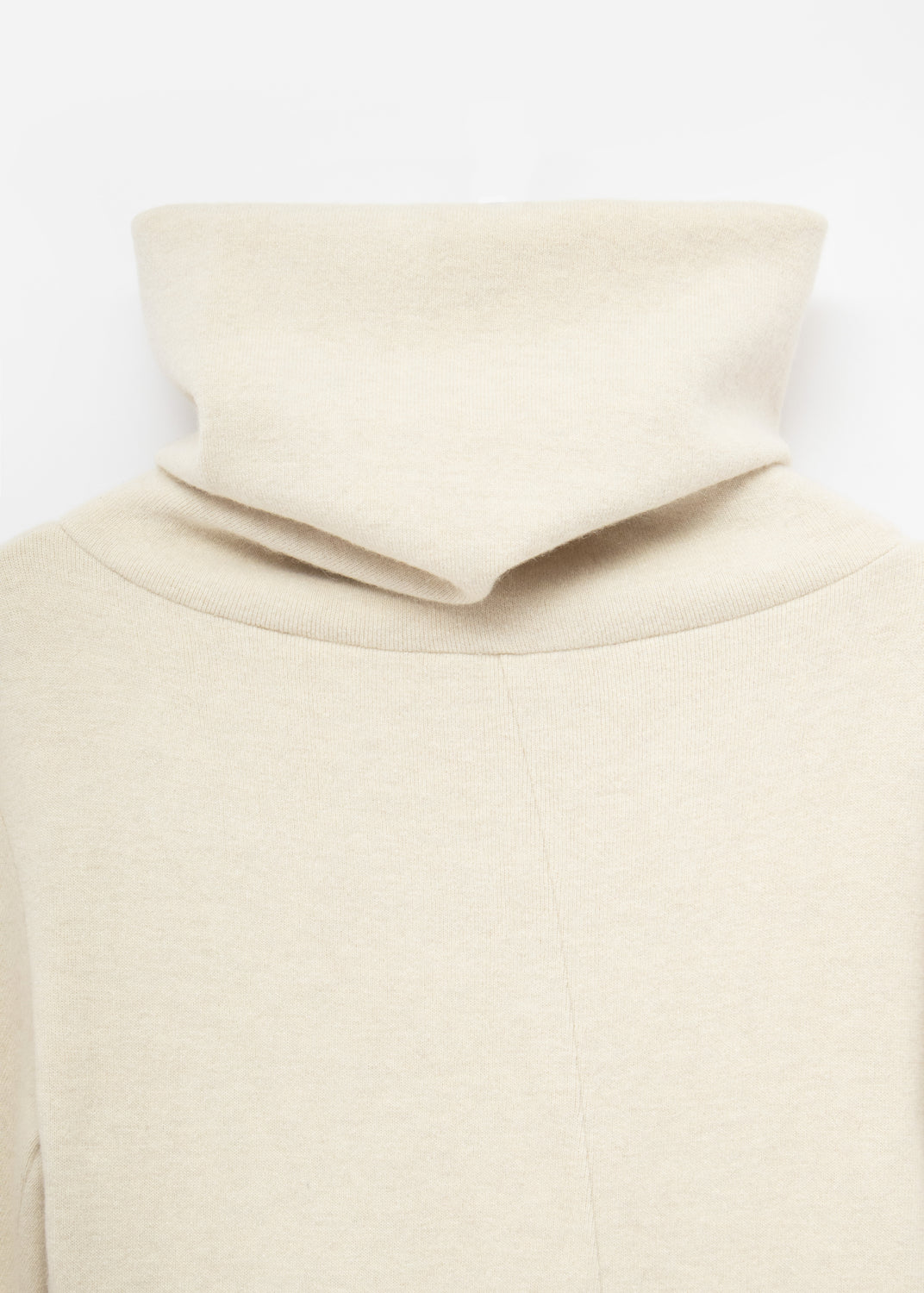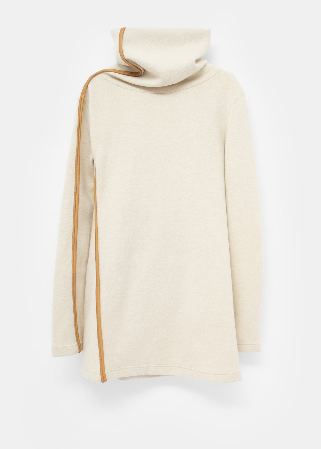 The sweater is cut as a tunic dress, with elongated sleeves and an exaggerated funnel neck that is cut long and wide to slouch onto itself.