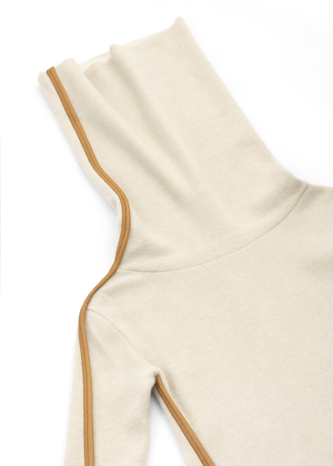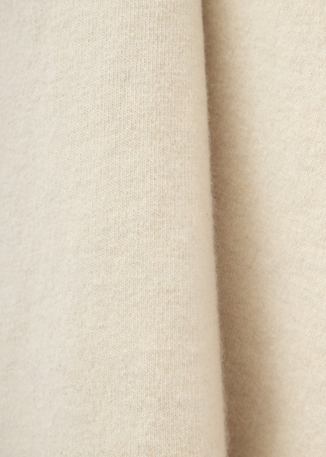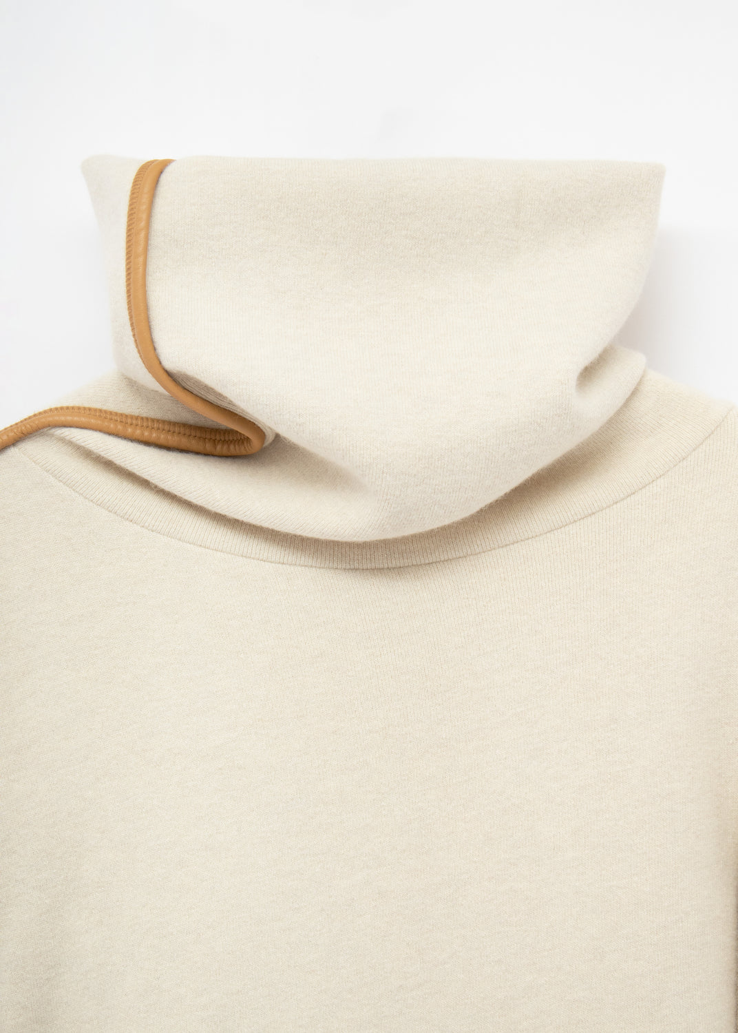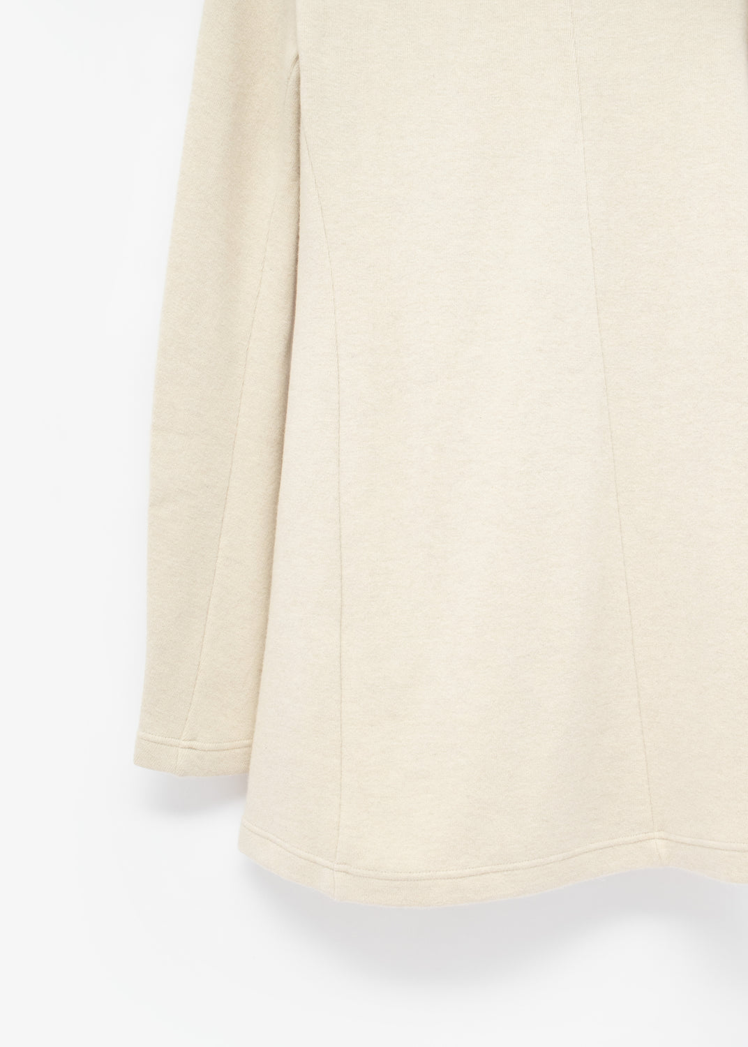 The sweater is cut as a tunic dress, with elongated sleeves and an exaggerated funnel neck that is cut long and wide to slouch onto itself.