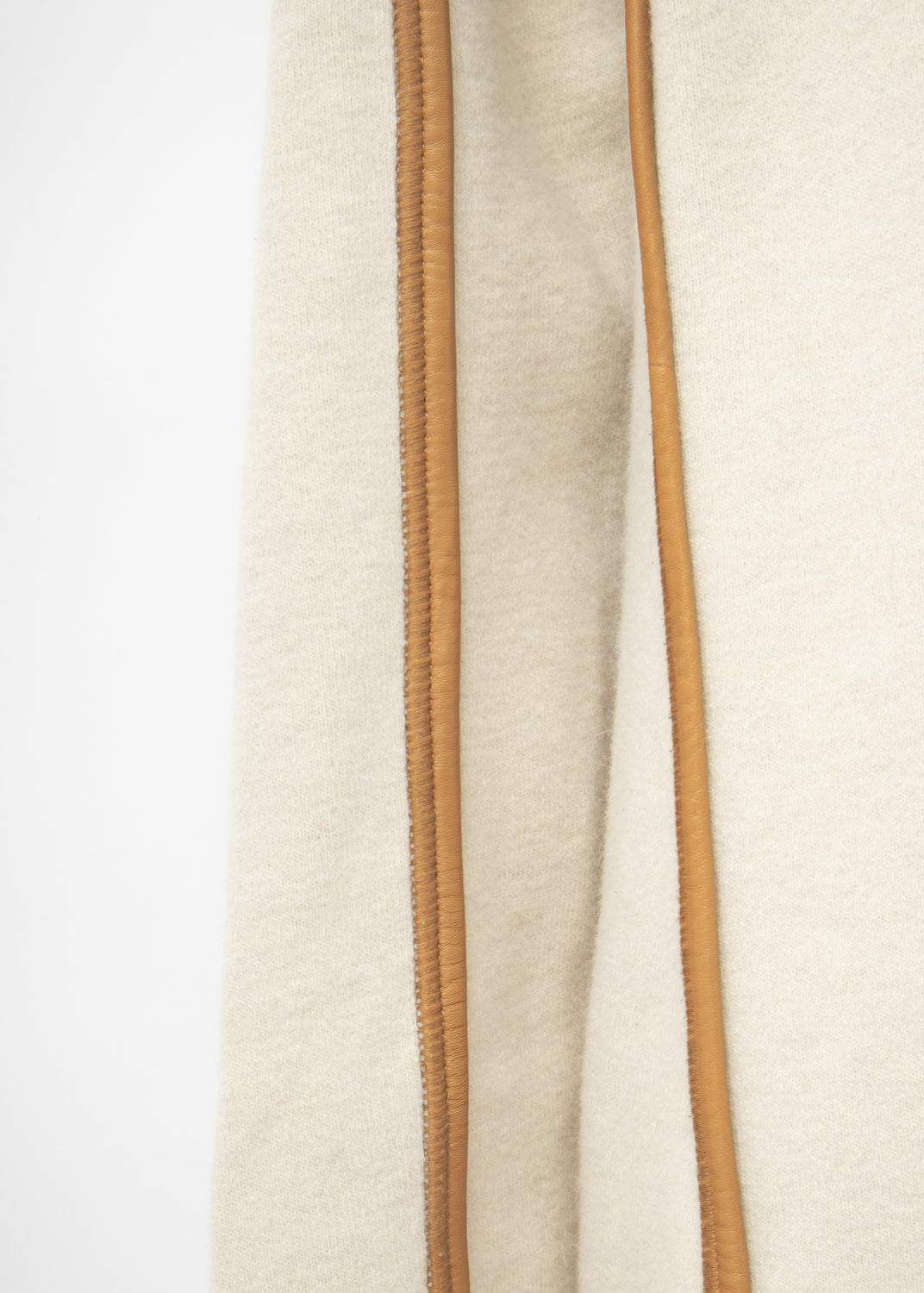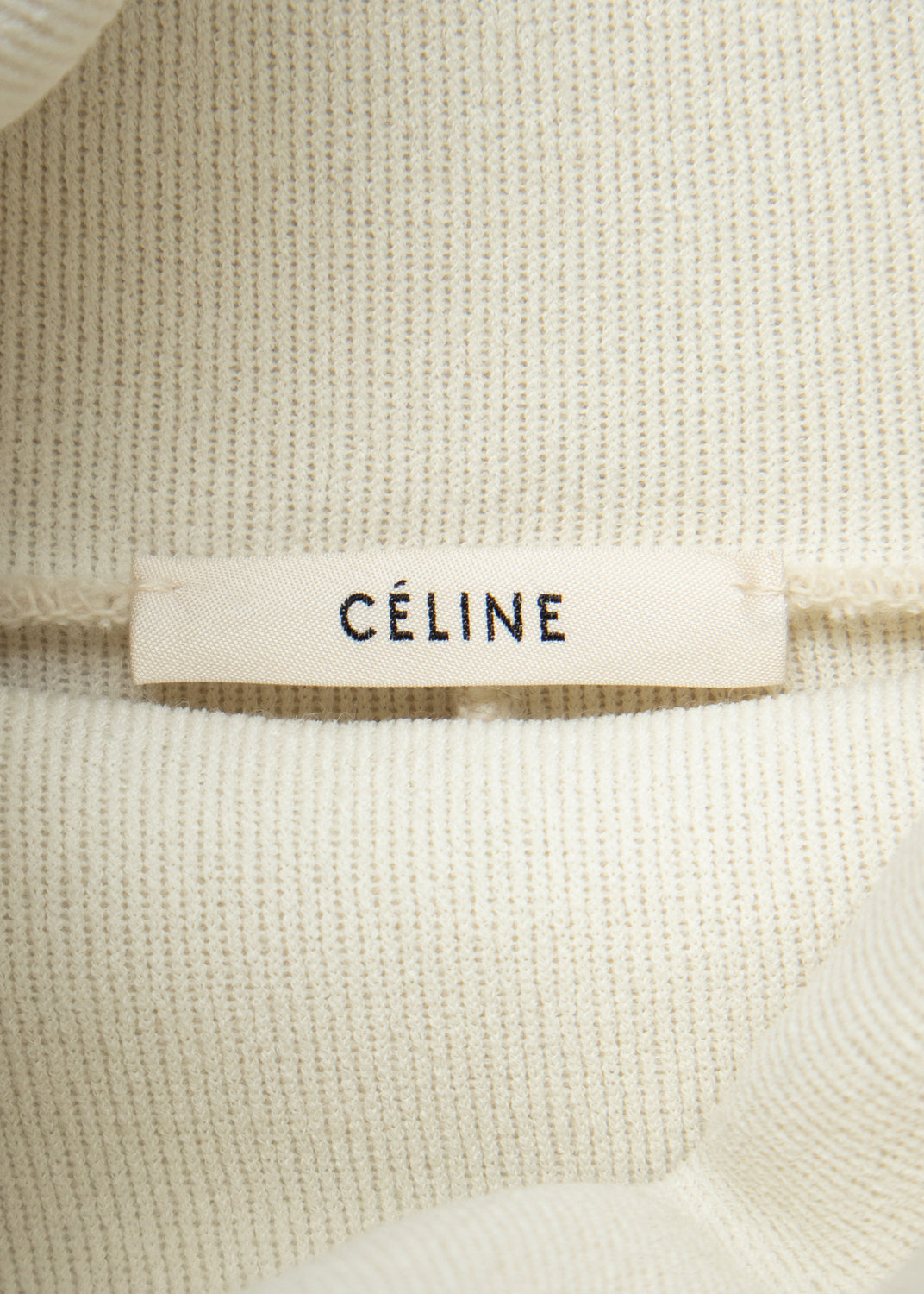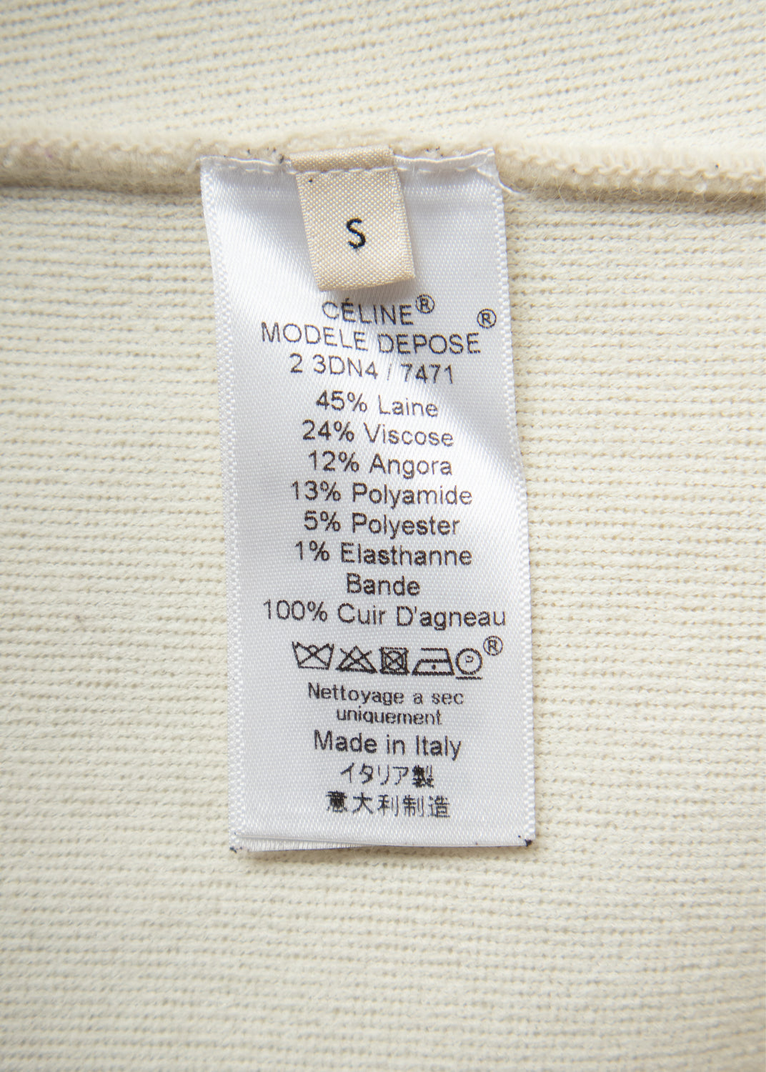 Material Angora-lambswool blend rib-knit Composition 45% Wool, 24% Viscose, 12% Angora, 13% Polyamide, 5% Polyester, 1% Elastane Handle Soft, fuzzy (face), textured, dry (reverse) Weight Midweight Transparency No Stretch Yes Sheen No Trim Lambskin leather Composition 100% Lambskin InscriptionsLabel marked "CÉLINE"