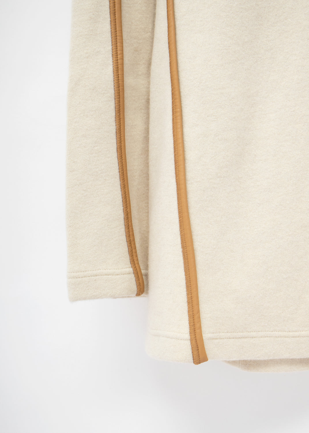 Diagonal seams gently shape the body into a slight A-line, widening subtly toward the hem. Stripes of tan lambskin run along some of those seams: one from the collar down the shoulder into the sleeves, and another under the same sleeve toward the front hip, creating graphic lines on the body.