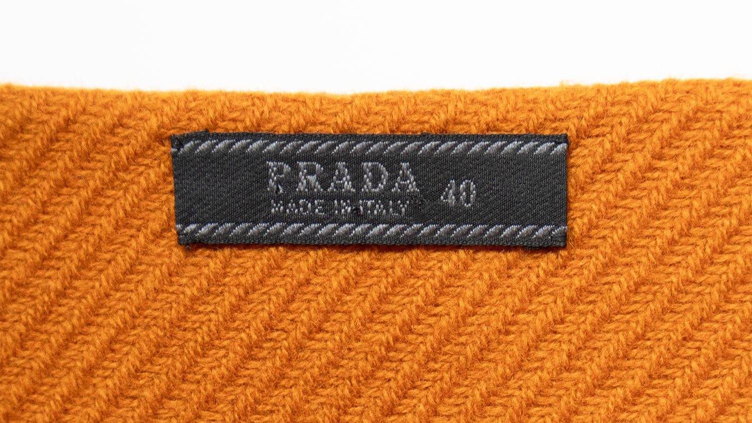 Material Diagonal-weave Shetland wool Composition 100% Virgin wool Handle Soft, textured, full Weight Midweight Transparency No Stretch Yes Sheen No Beetle appliques Patent leather Composition Unspecified Leaf appliques Matte plastic Composition Unspecified InscriptionsLabel marked "PRADA MADE IN ITALY 40"
