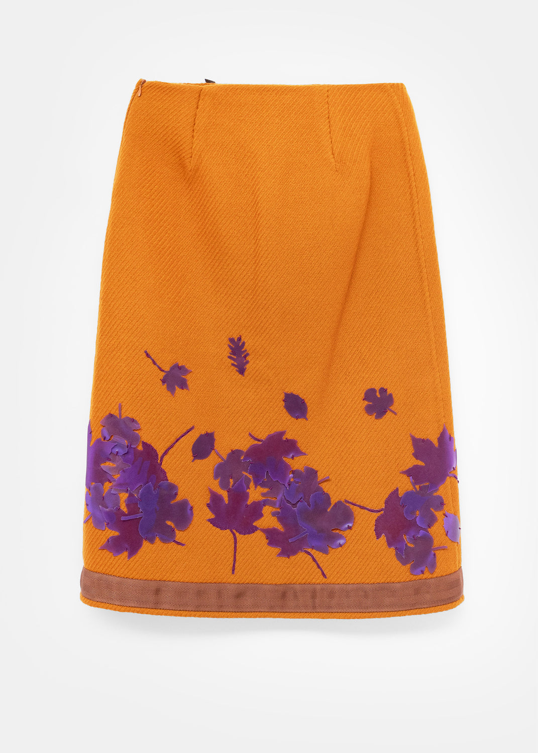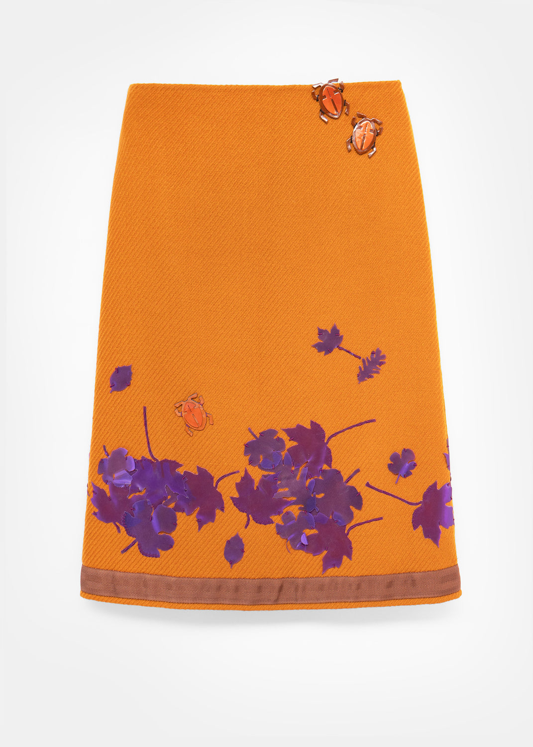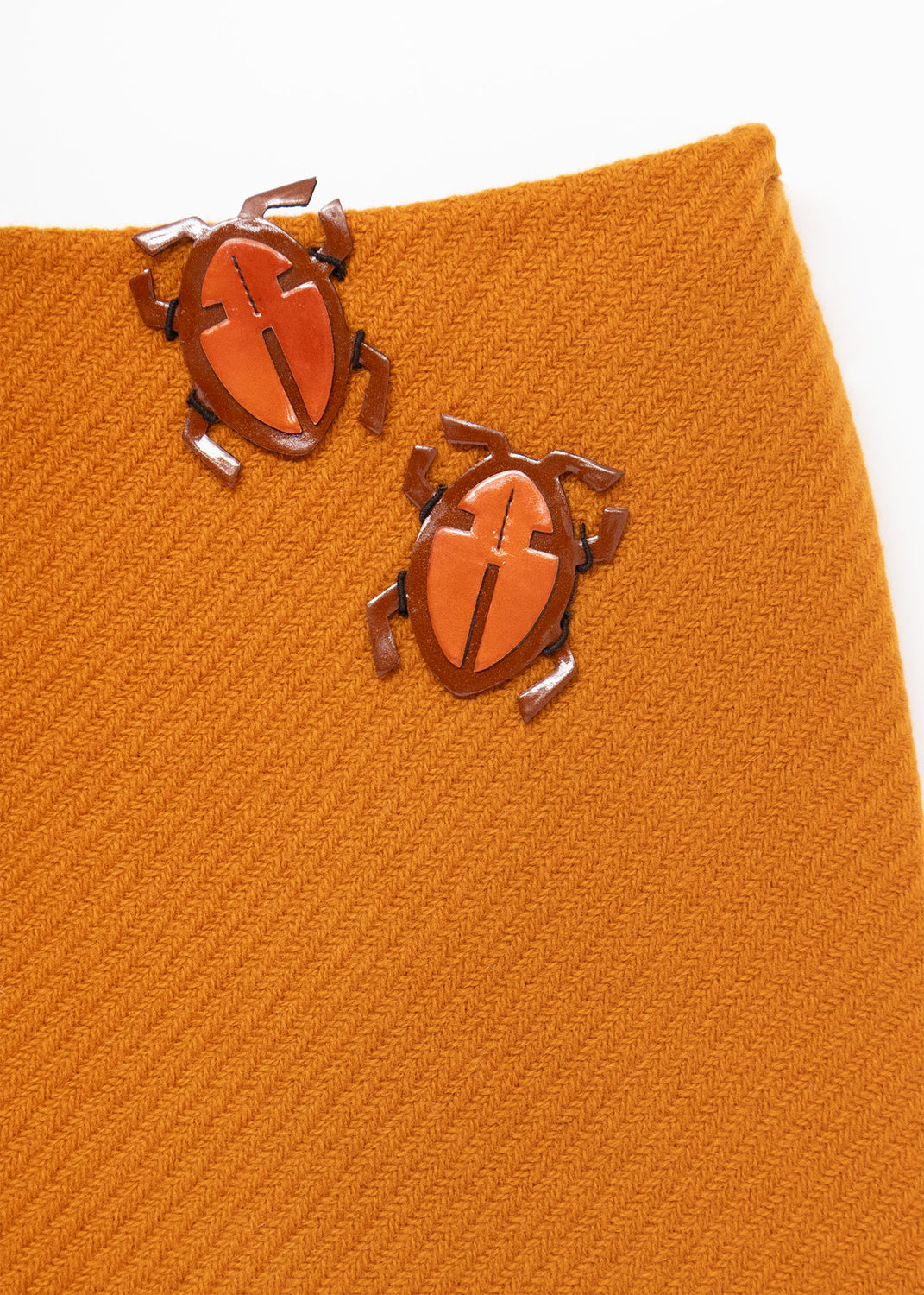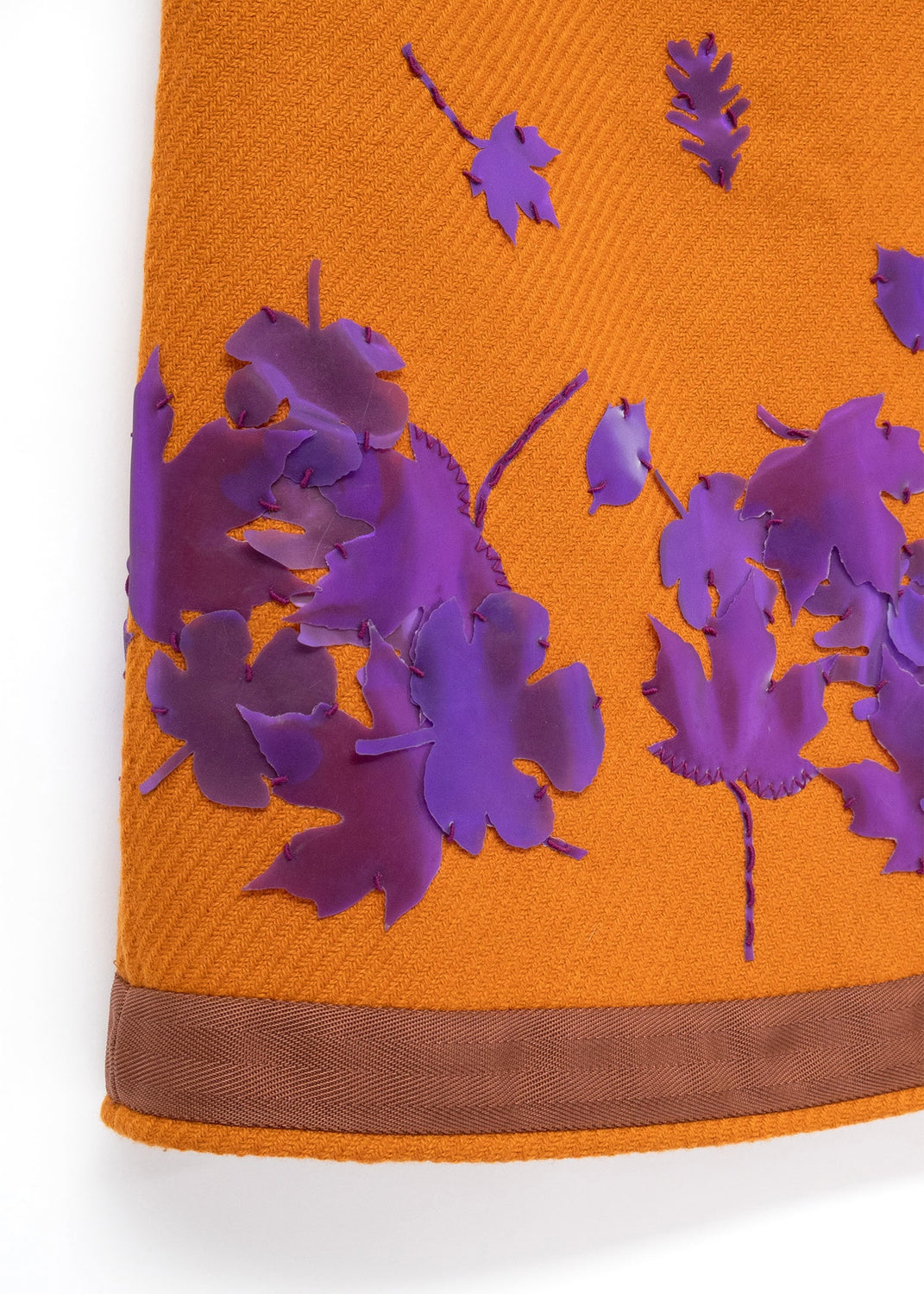 Worn by a 19-year-old Gisele Bündchen on the runway, this straight, midi-length skirt is a clear example. Cut from bright orange Shetland wool, the skirt's bottom half is dotted with clusters of laser-cut neon purple plastic leaves. Shiny cartoon beetles in patent leather are scattered, as if they’re crawling up the fabric. Copper brown herringbone twill tape wraps around the edge.