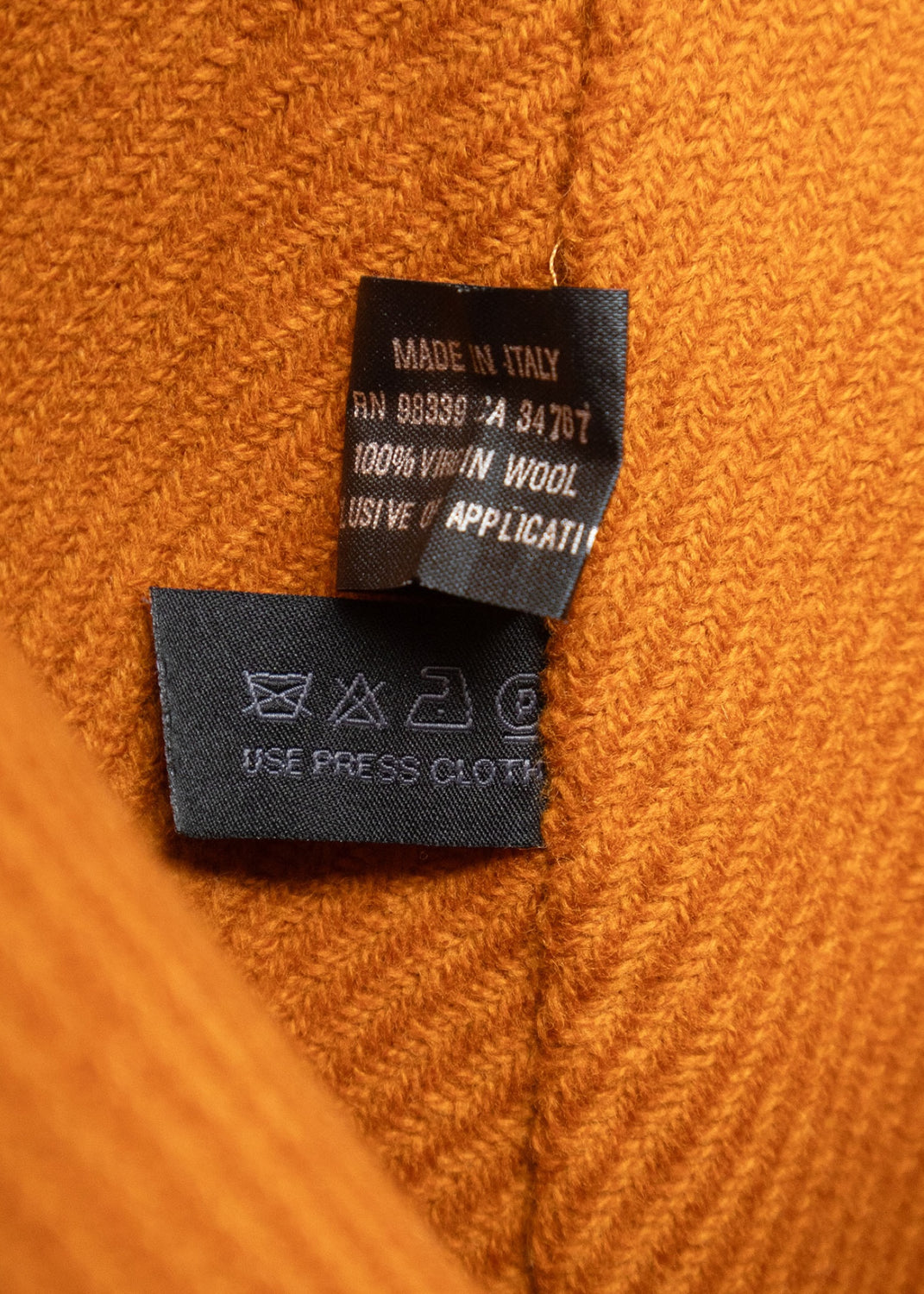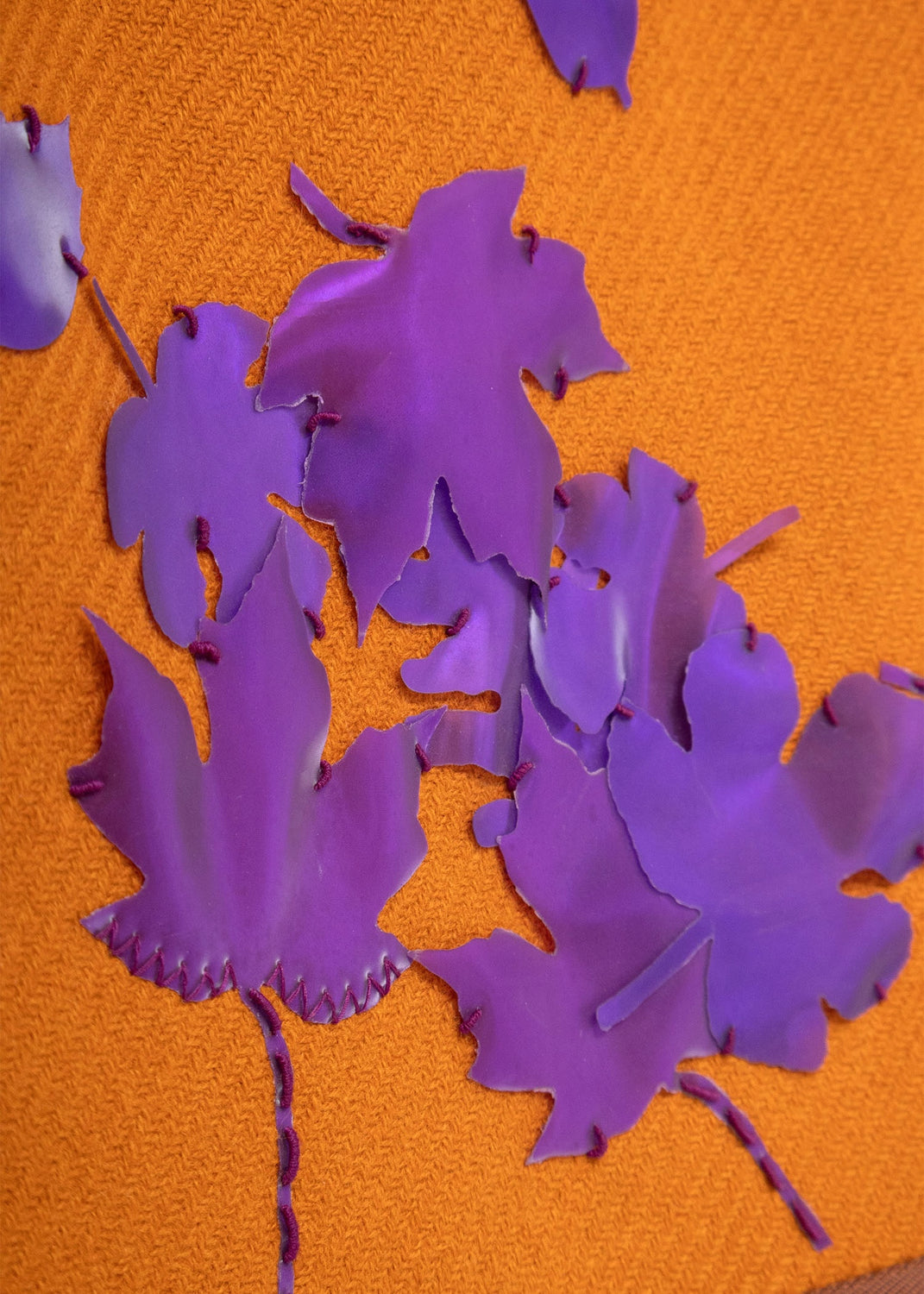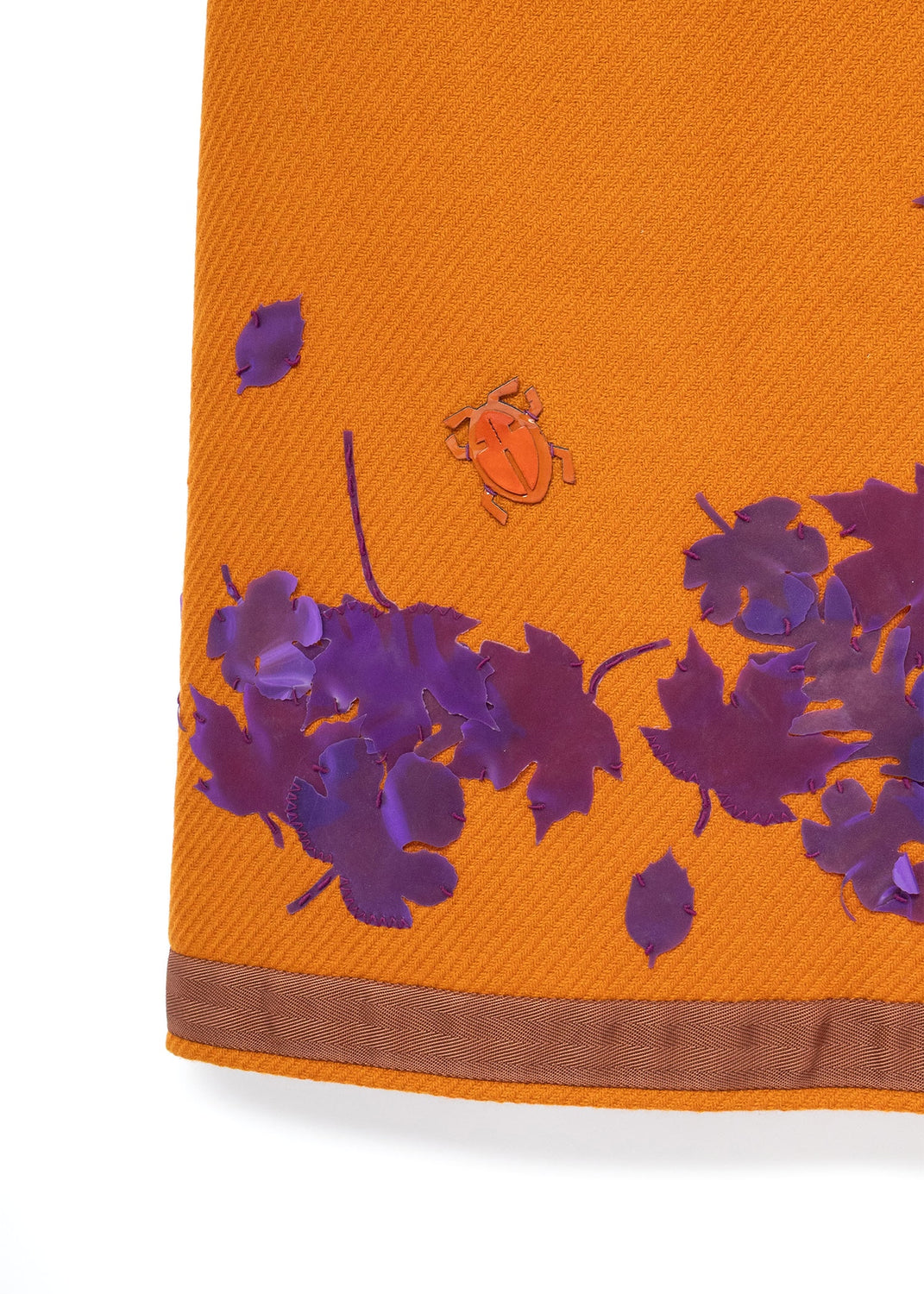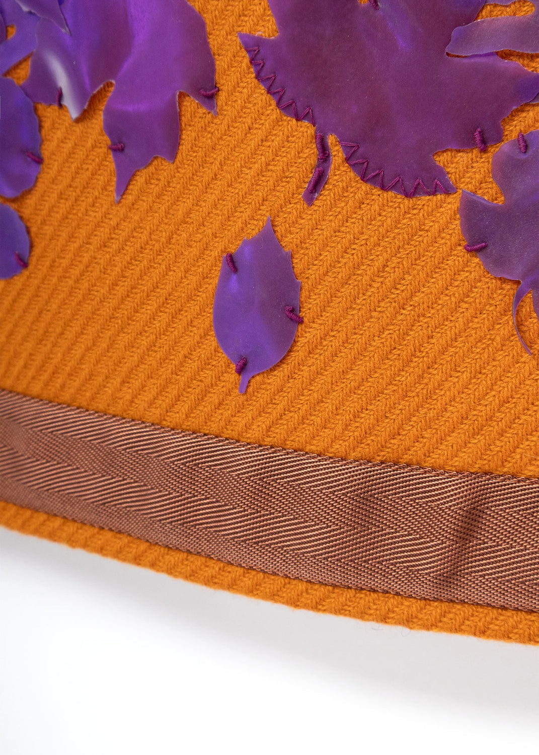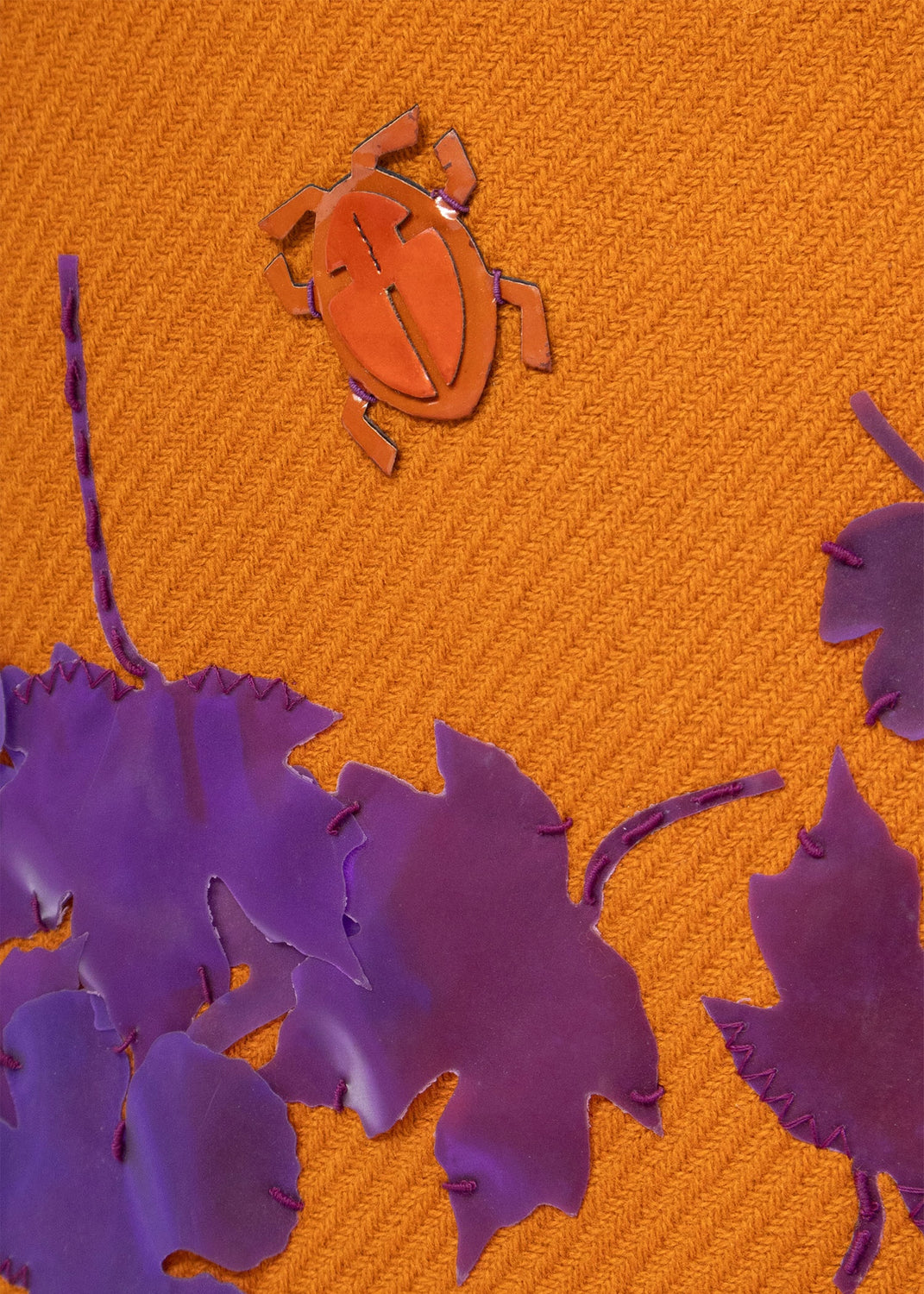 Worn by a 19-year-old Gisele Bündchen on the runway, this straight, midi-length skirt is a clear example. Cut from bright orange Shetland wool, the skirt's bottom half is dotted with clusters of laser-cut neon purple plastic leaves. Shiny cartoon beetles in patent leather are scattered, as if they’re crawling up the fabric. Copper brown herringbone twill tape wraps around the edge.