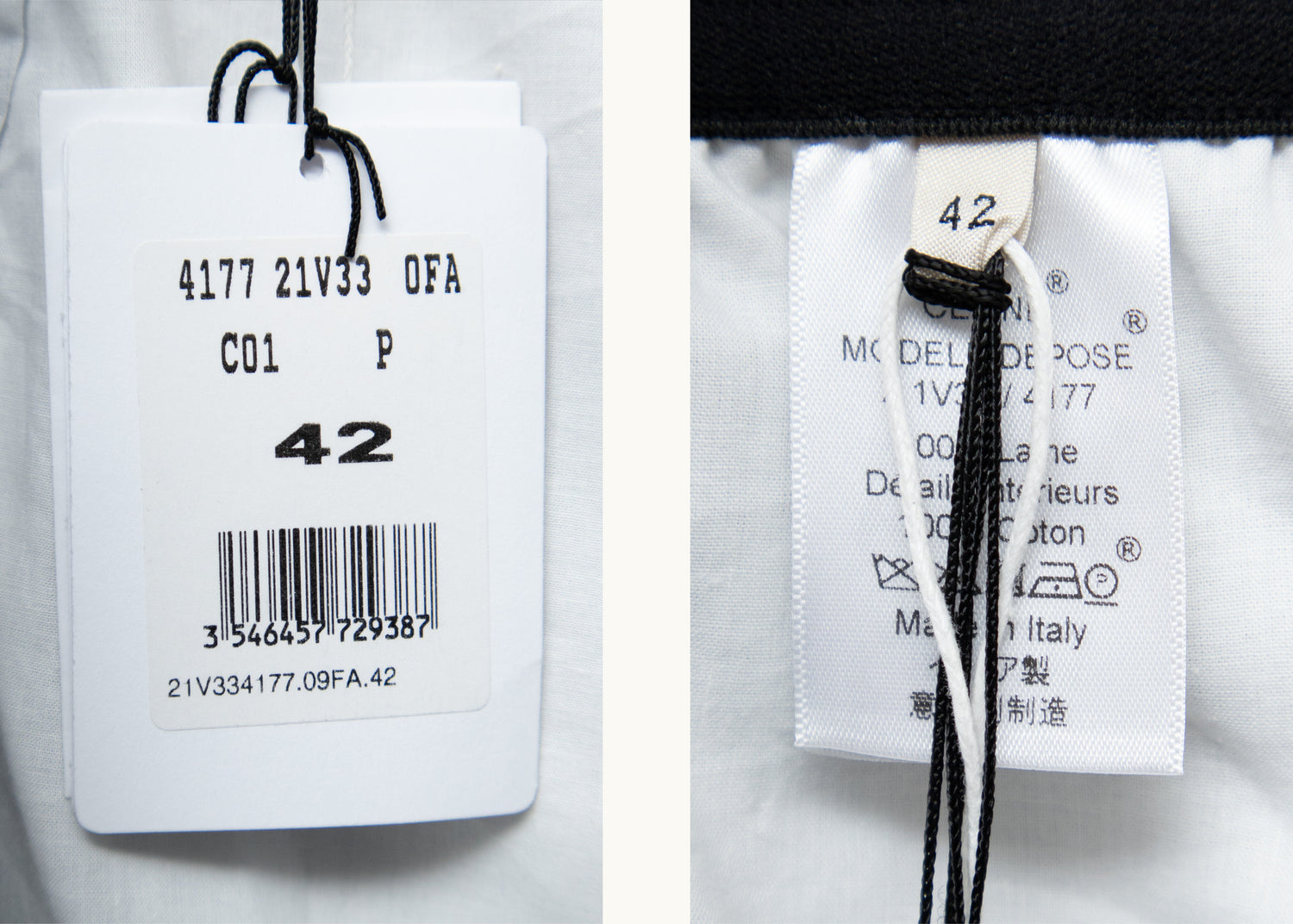 Original retail hang tag; size indication, material composition, care instructions, origin