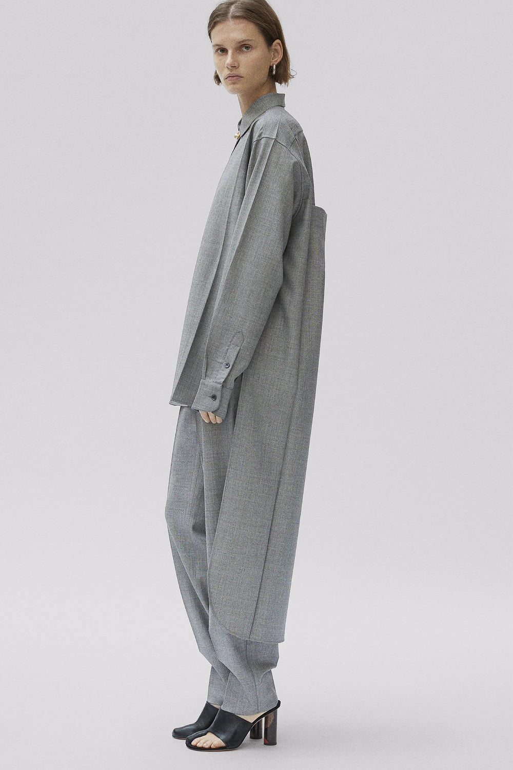 Long asymmetric shirt in suiting wool