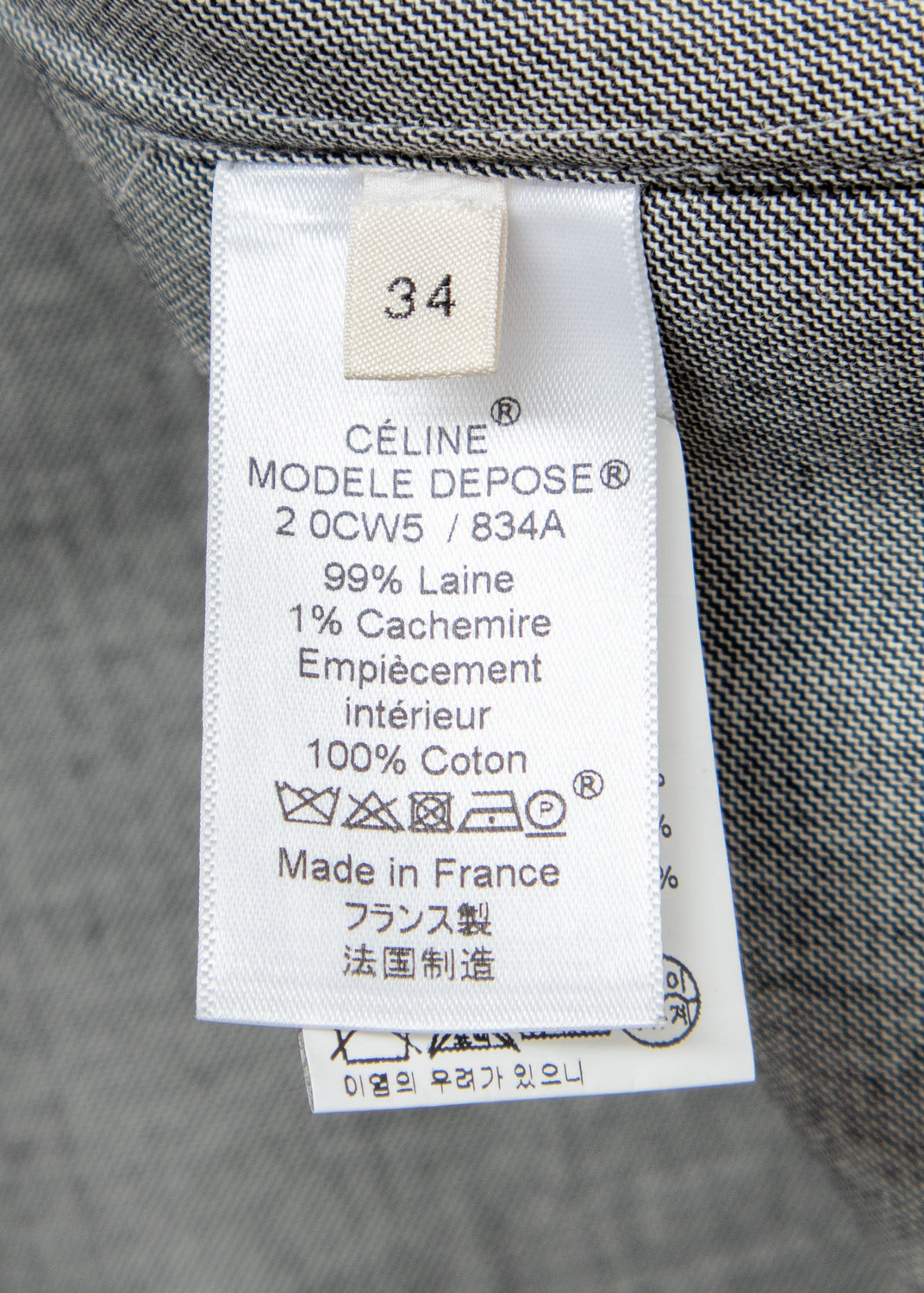 Material Melange wool suiting Composition 99% Wool, 1% Cashmere Handle Soft, light, dry, fluid Weight Midweight Transparency No Stretch No Sheen No Yoke lining, trims Cotton lining Composition 100% Cotton InscriptionsLabel marked "CÉLINE"