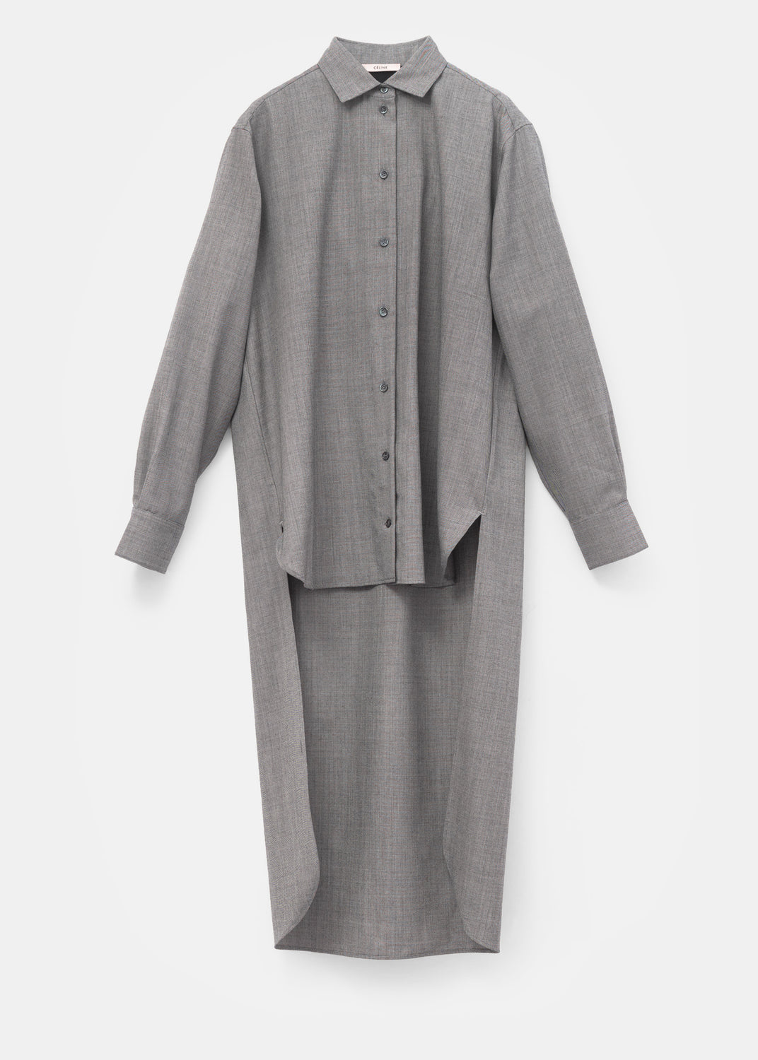 From the Pre-Fall 2017 collection, this asymmetrical shirt from Céline is an inventive take on the classic button-up. Made in soft melange wool suiting, the shirt is cut to a slightly oversize, masculine fit, and notably features an extended shirttail.