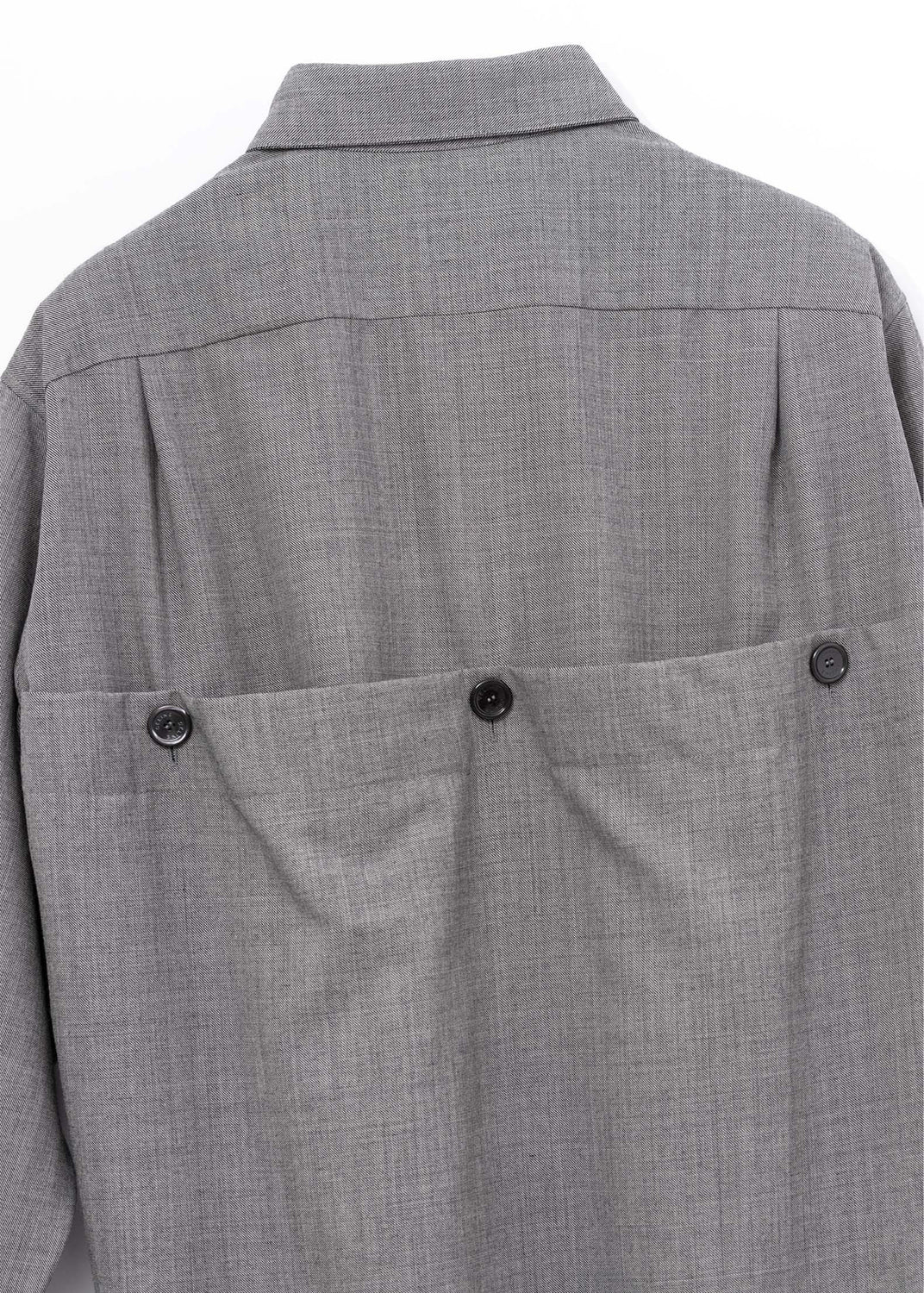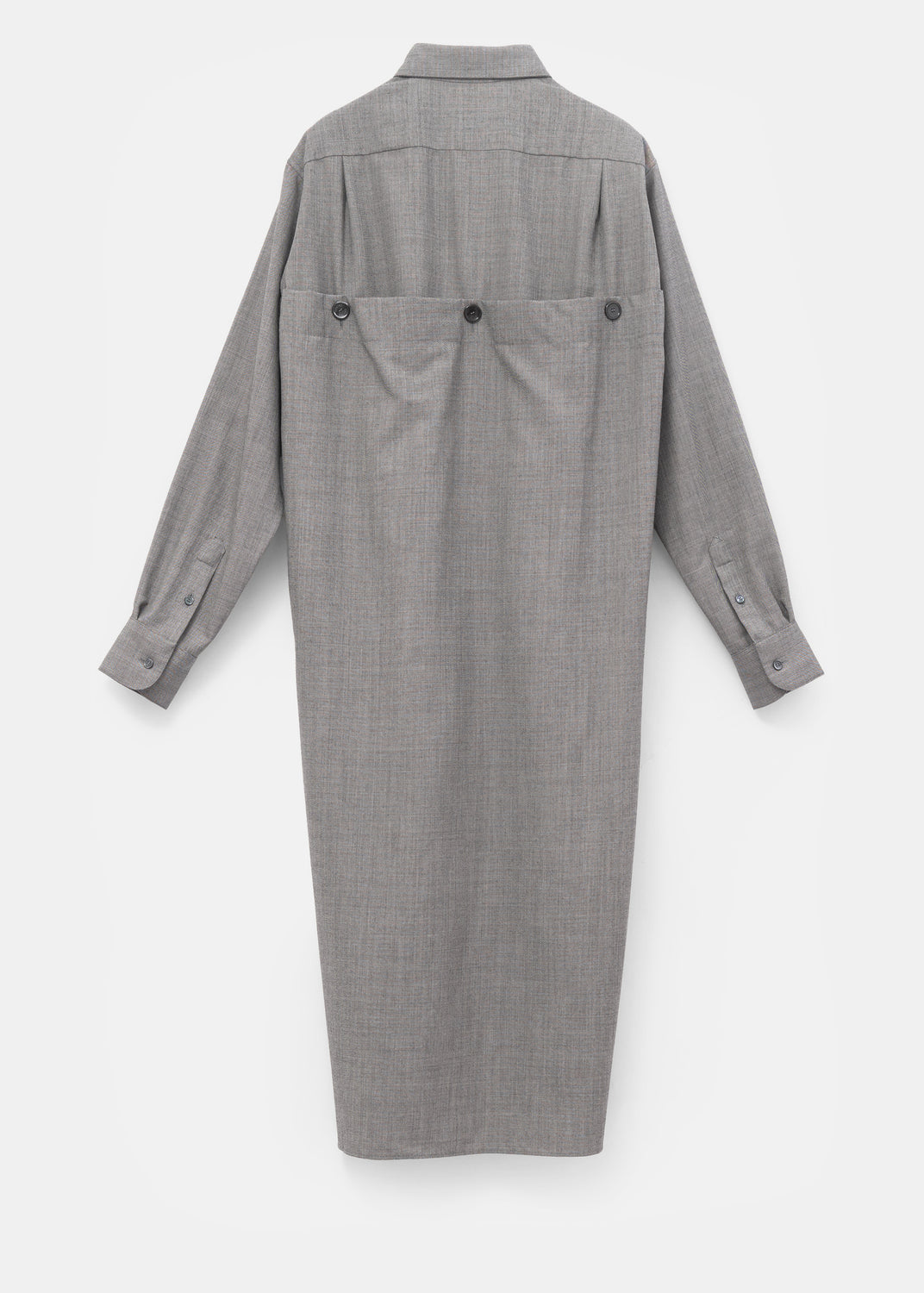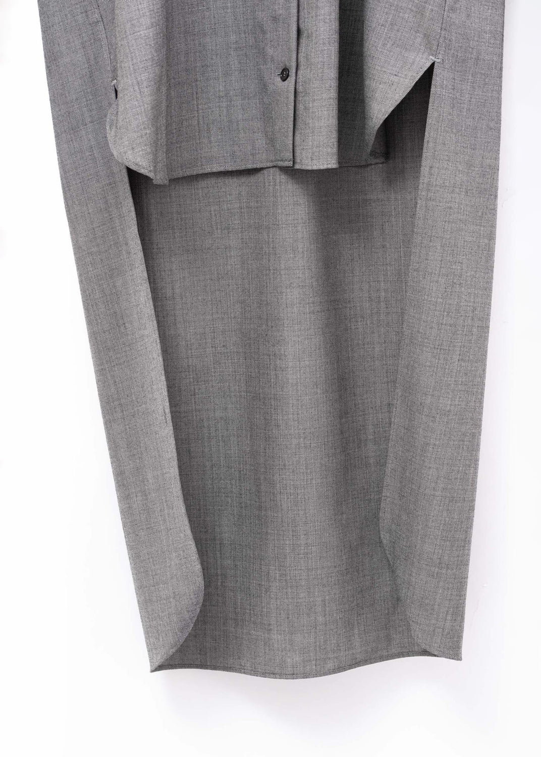 The extended shirttail is an addition; a separate panel seamed to the sides of the shirt. It is further secured by large buttons at the top. A discreetly placed buttonhole on the rounded hem lets the shirttail be fastened to the cuffs, the front placket, or the reinforced buttons inside the shirt, allowing the hemline to be shortened or draped in different ways.