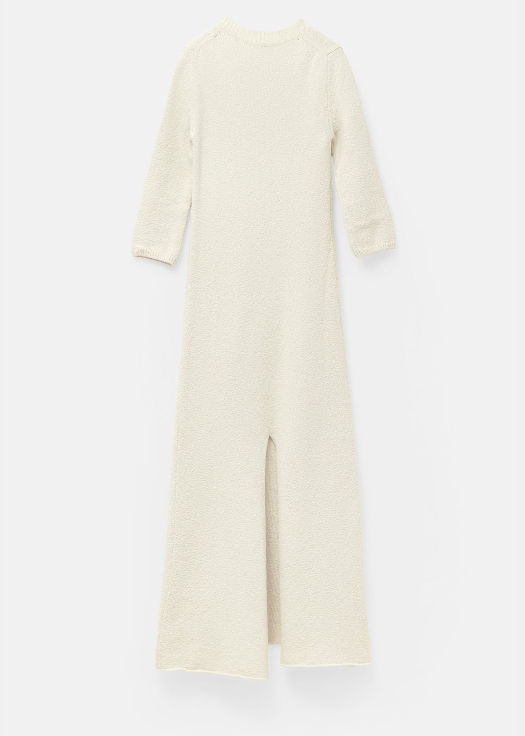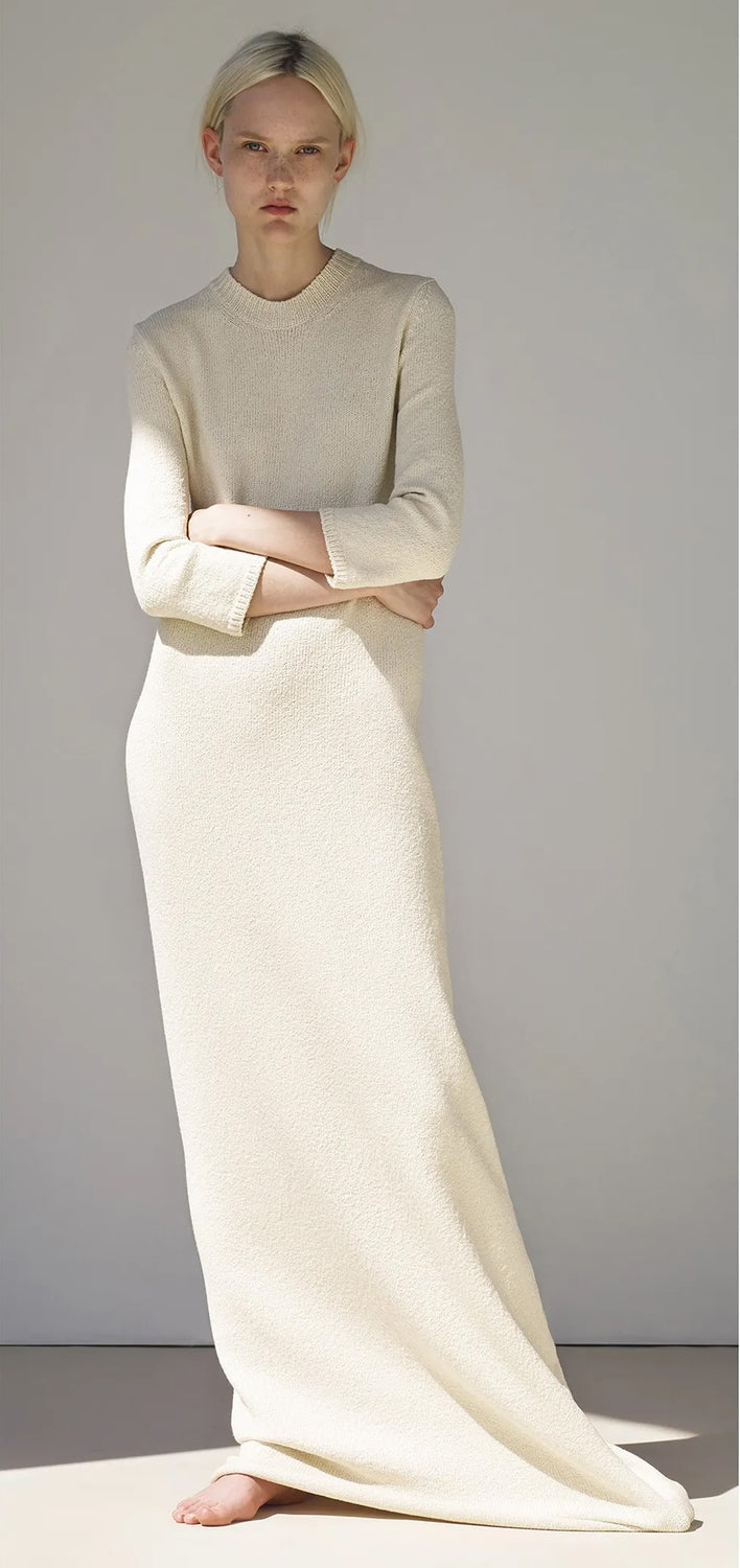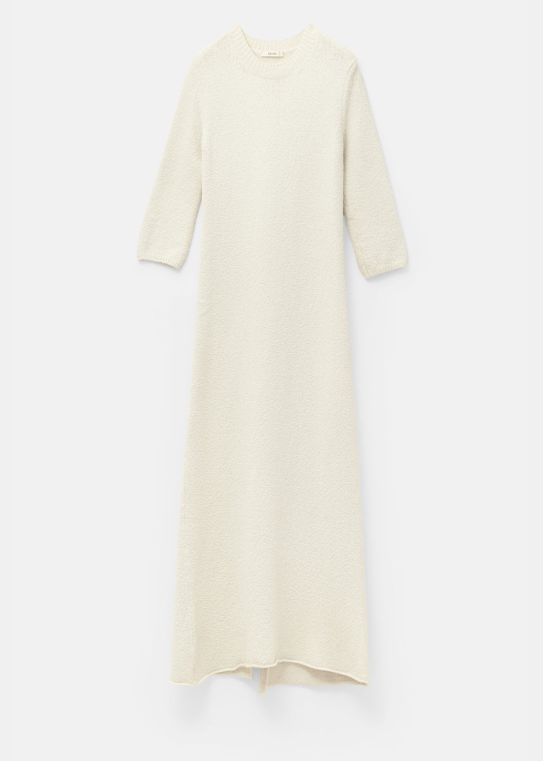 Shown in Céline’s Resort 2015 lookbook, this long knit dress is crafted to a relaxed silhouette with practical three-quarter sleeves and a floor-length hem. Knitted in Italy, the dress is made in an off-white wool, with subtle variations in the yarn that lend a tactile, handmade quality to the piece.