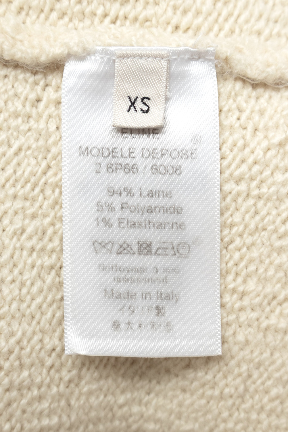 Label with size indication, fabric care and composition, and origin -