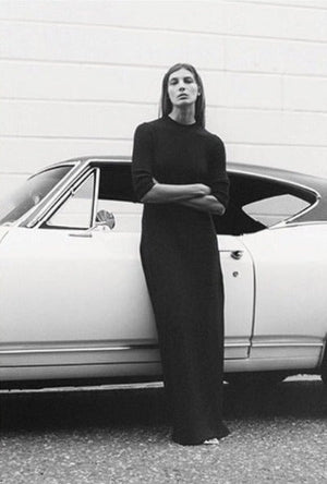 The dress appears in imagery shot for the season’s campaign by Tyrone Lebon, where model Daria Werbowy wears a version in black. The campaign imagery nods to Julian Wasser’s 1968 photographs of Joan Didion with her newly acquired Corvette Stingray. The velour dress Didion wears in the Time Magazine-commissioned portraits seems to be a signature, reappearing in various images of her over the years.