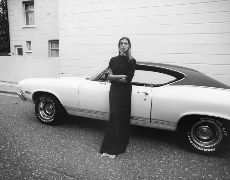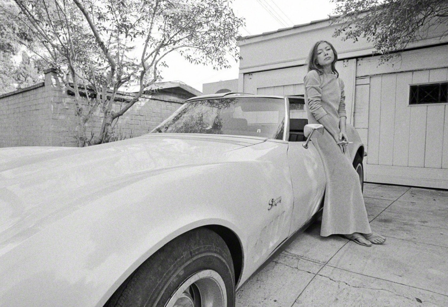 Joan Didion in a long velour dress with her newly acquired Corvette Stingray in 1968. Image by Julian Wasser