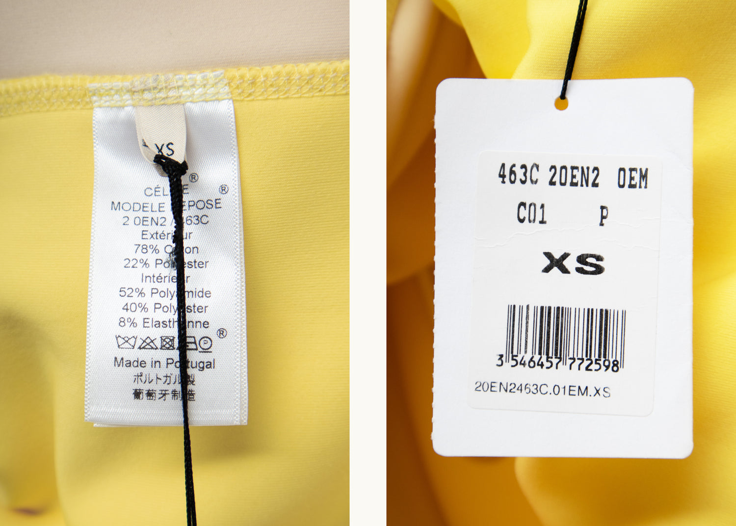 Material Heavy cotton jersey Composition 78% Cotton, 22% Polyester Handle Soft, full, weighty Weight Midweight Transparency No Stretch No Sheen No Lining Technical stretch lining Composition 52% Polyamide, 40% Polyester, 8% Elastane InscriptionsLabel marked "CÉLINE"