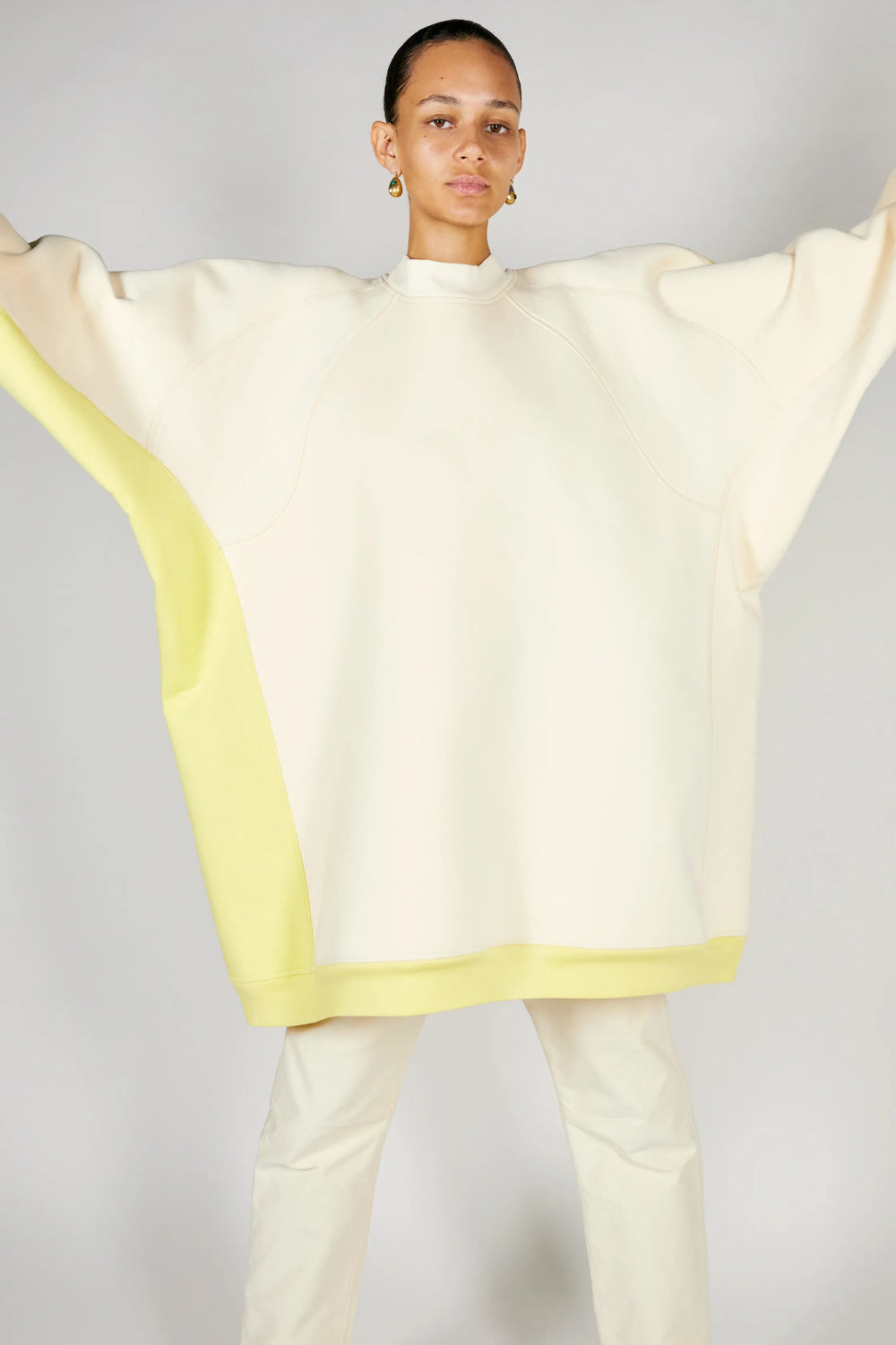 Inside, a colour-matched silky polyester jersey lining gives the sweater extra body and weight, helping the exaggerated proportions hold their volume.
