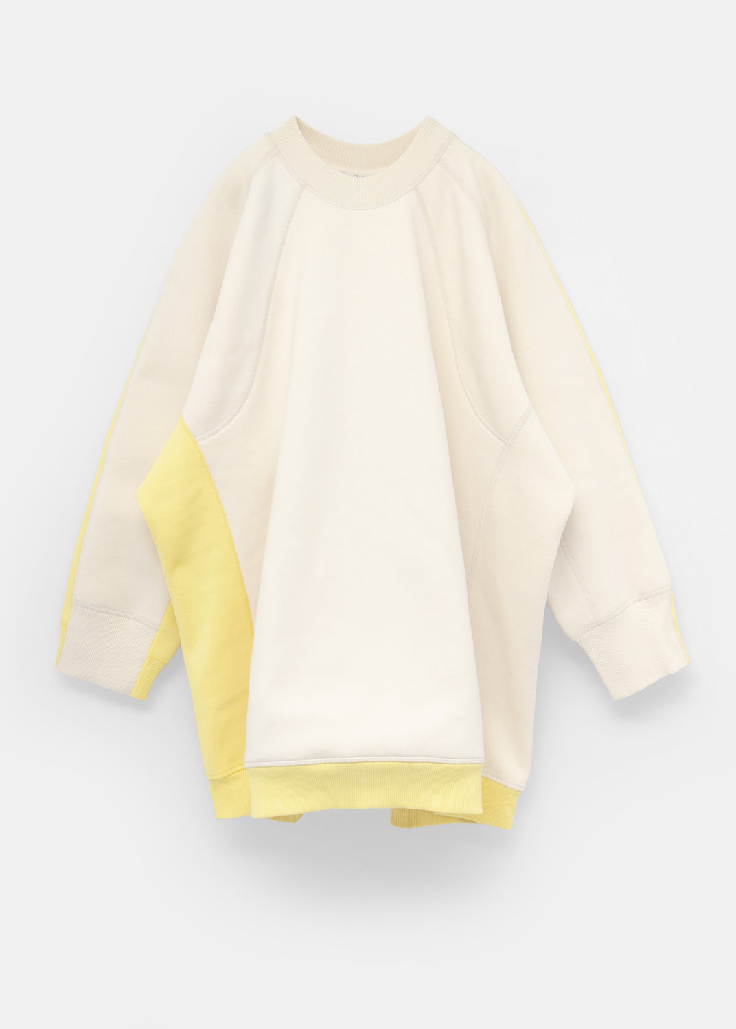 Made with a ribbed crew-neck collar and large raglan sleeves, the body is built from off-white and fluorescent yellow panels that are assembled into asymmetrical colorblocking.