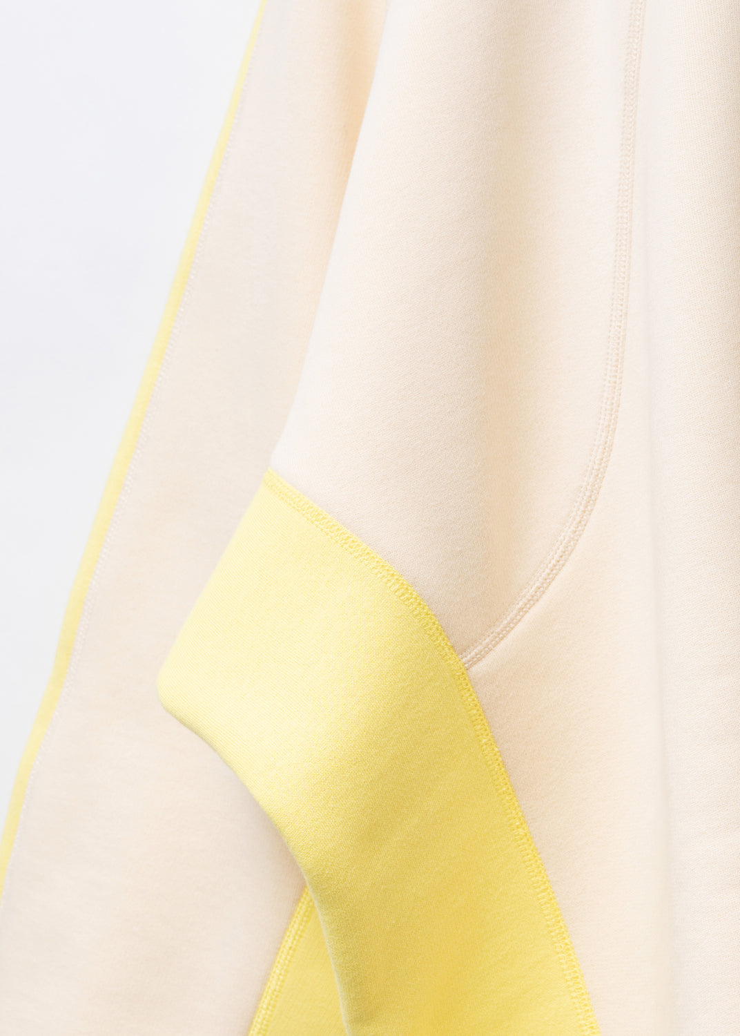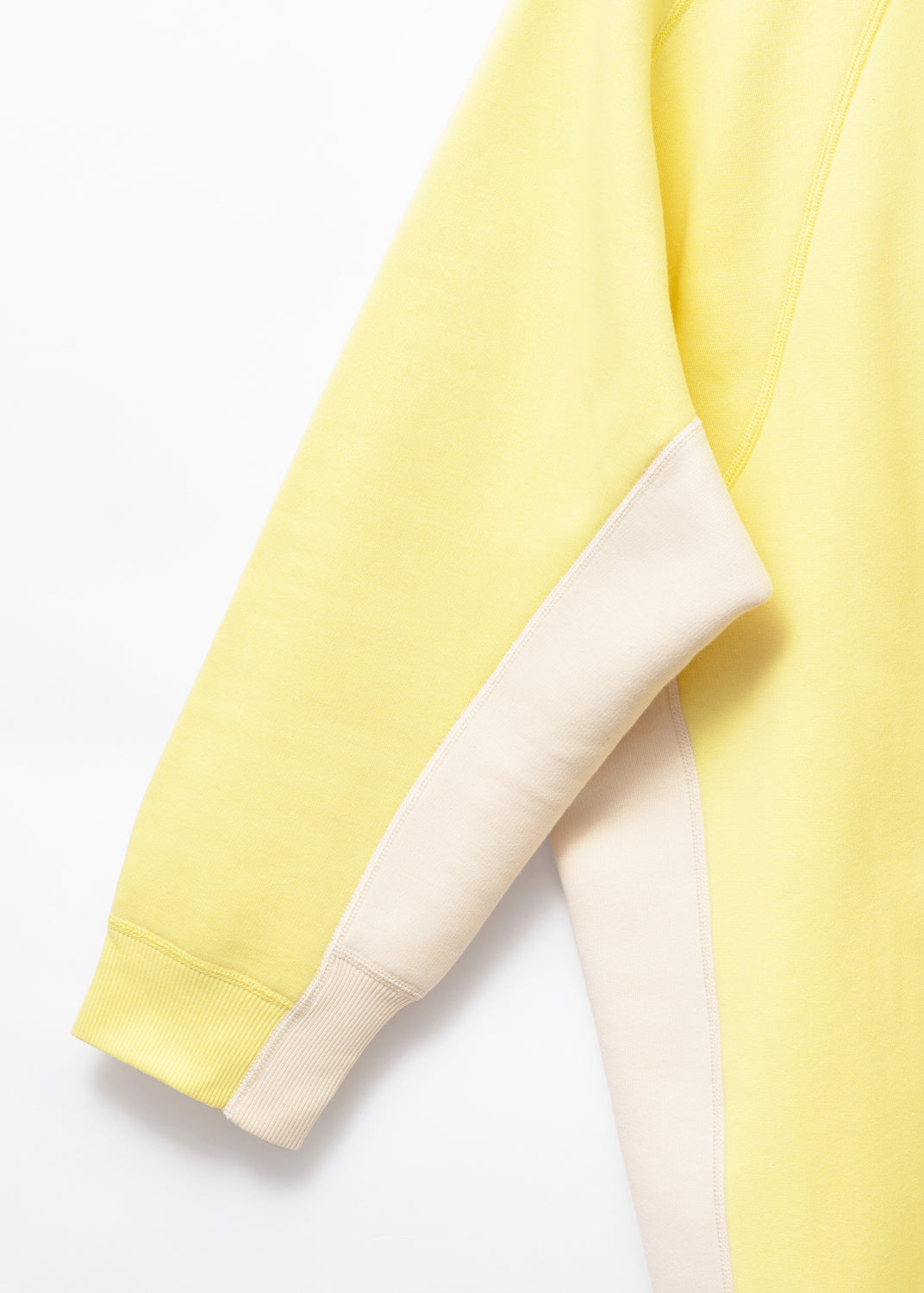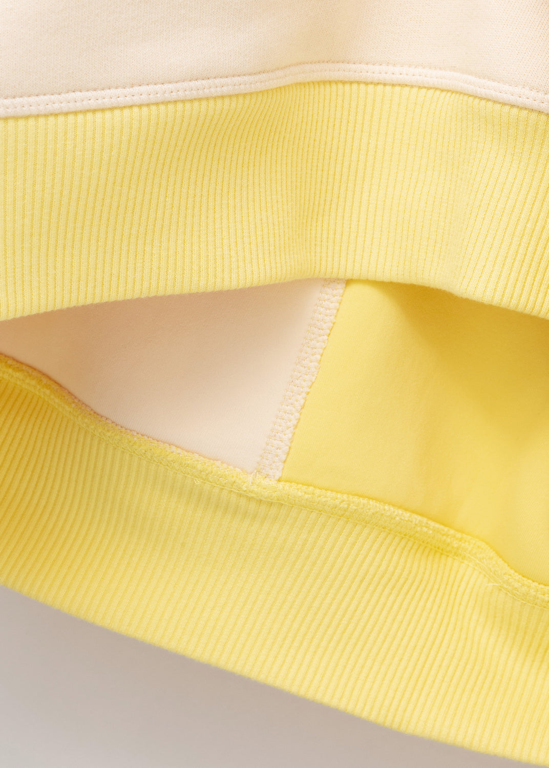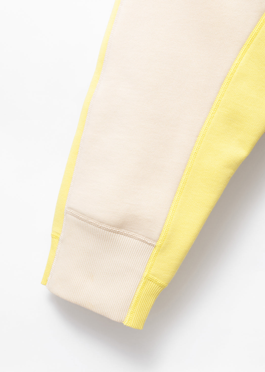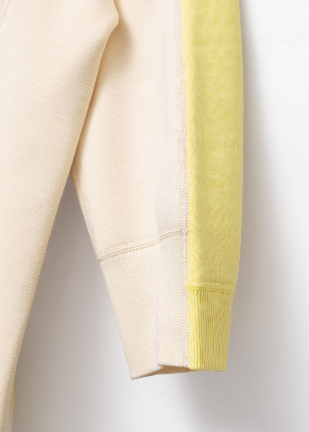 That asymmetry continues at the cuffs, where the ribbing is deliberately mismatched. The off-white parts are wider than the yellow, as if two different sweaters have been spliced and resolved into one garment.